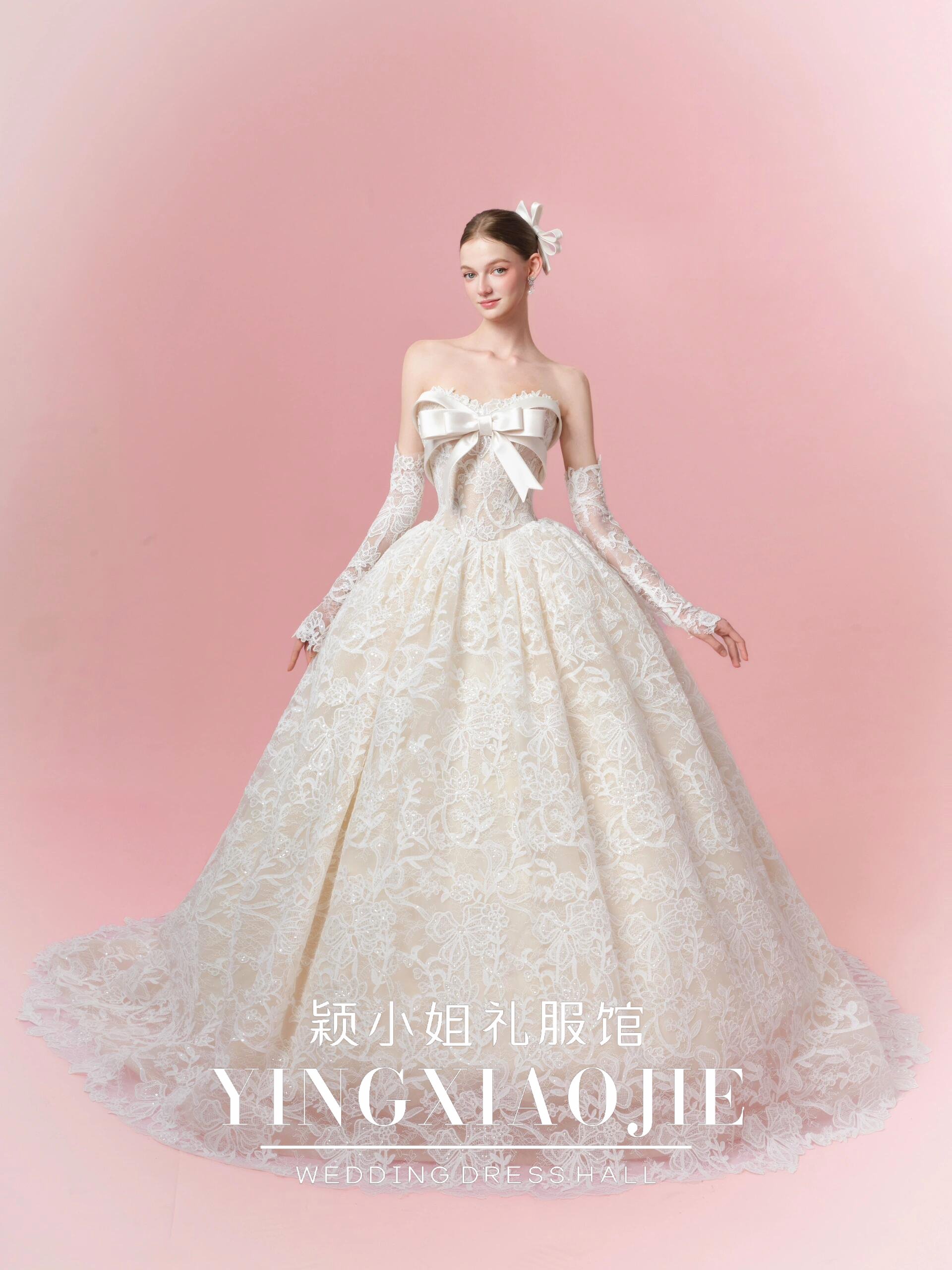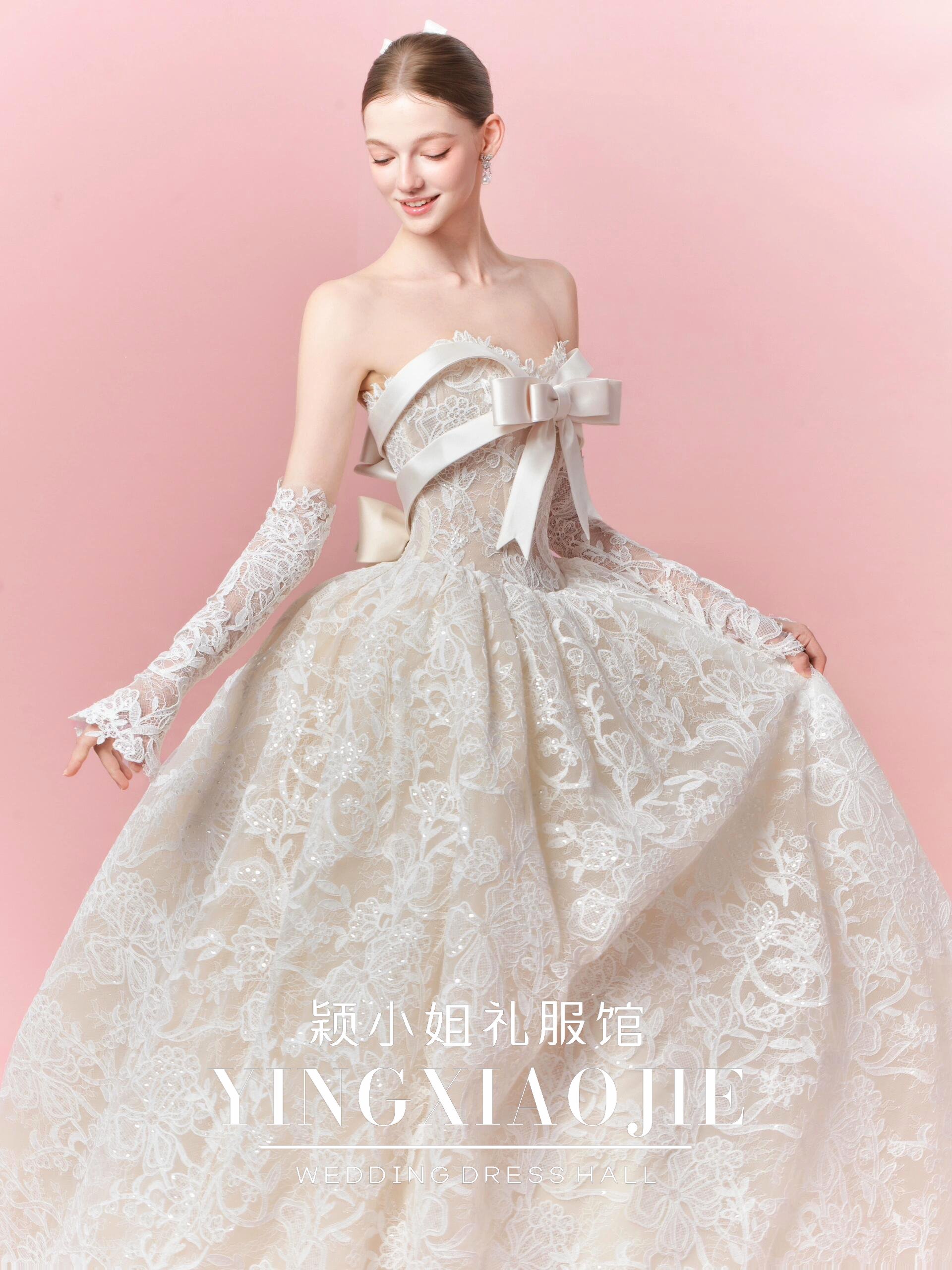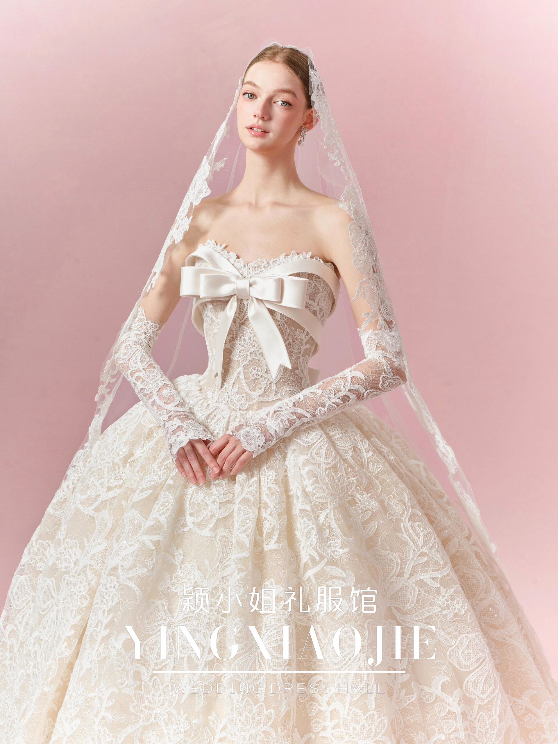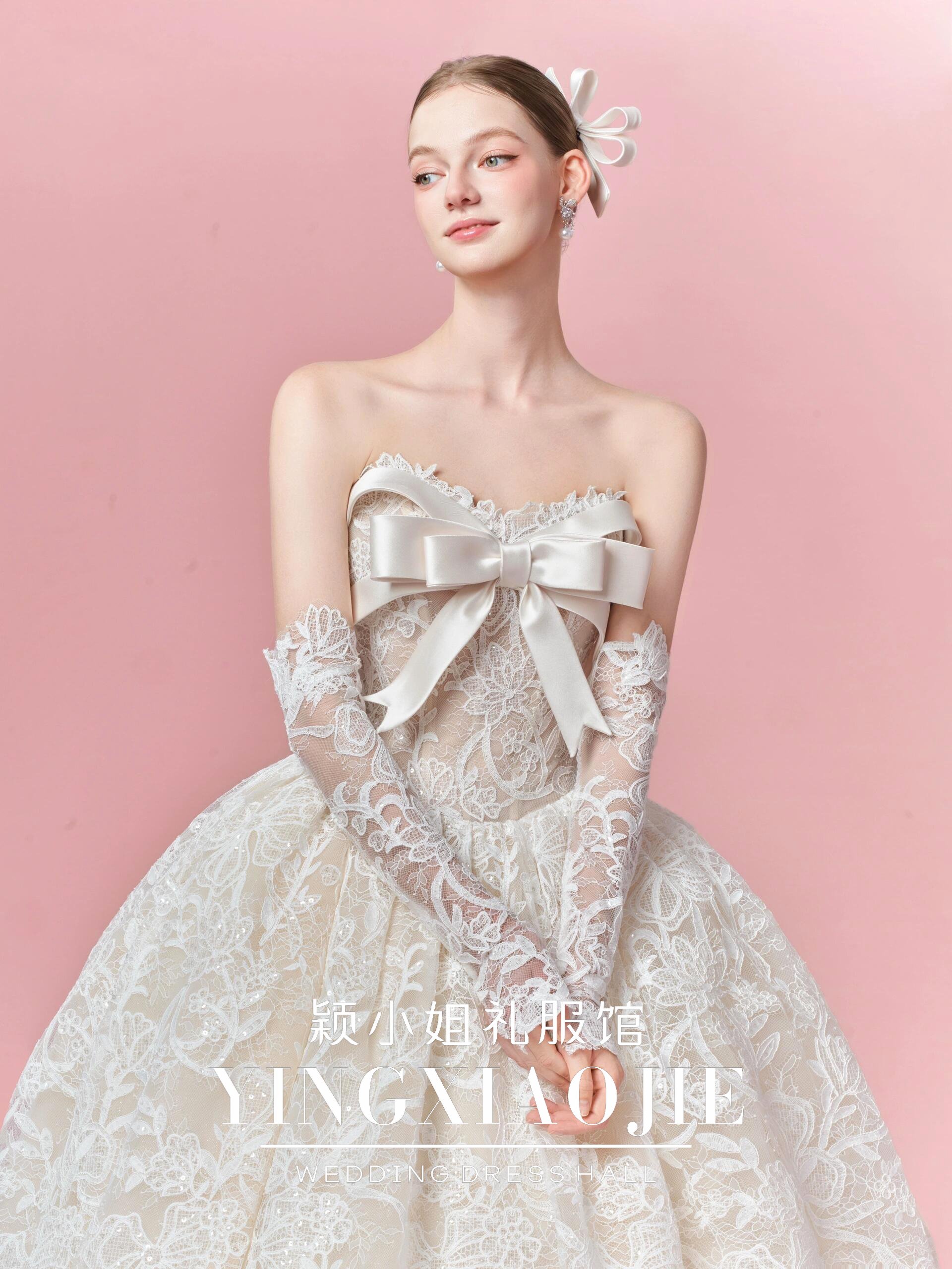 • 🦋蕾丝于蝴蝶结的温柔私语 月光白的丝绸裹着心跳 每一针刺绣都在说[我愿意] 🎀被蝴蝶结轻轻拖住的承诺 蓬纱藏起少女时代的幻想 #少女感婚纱