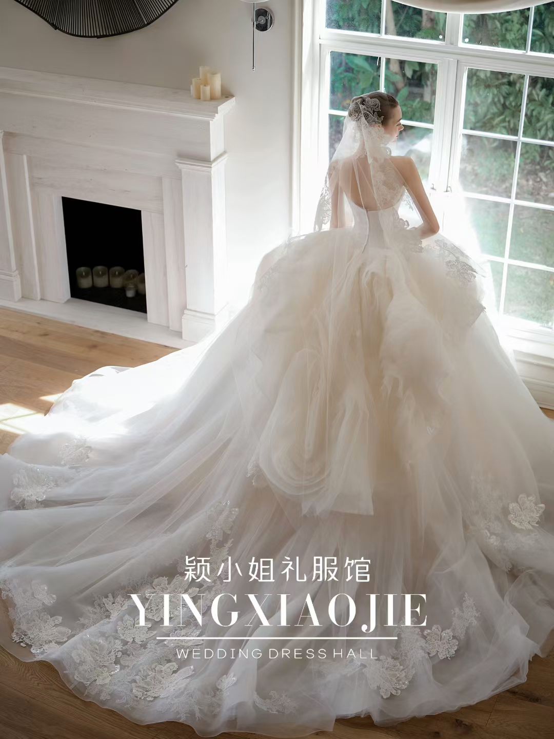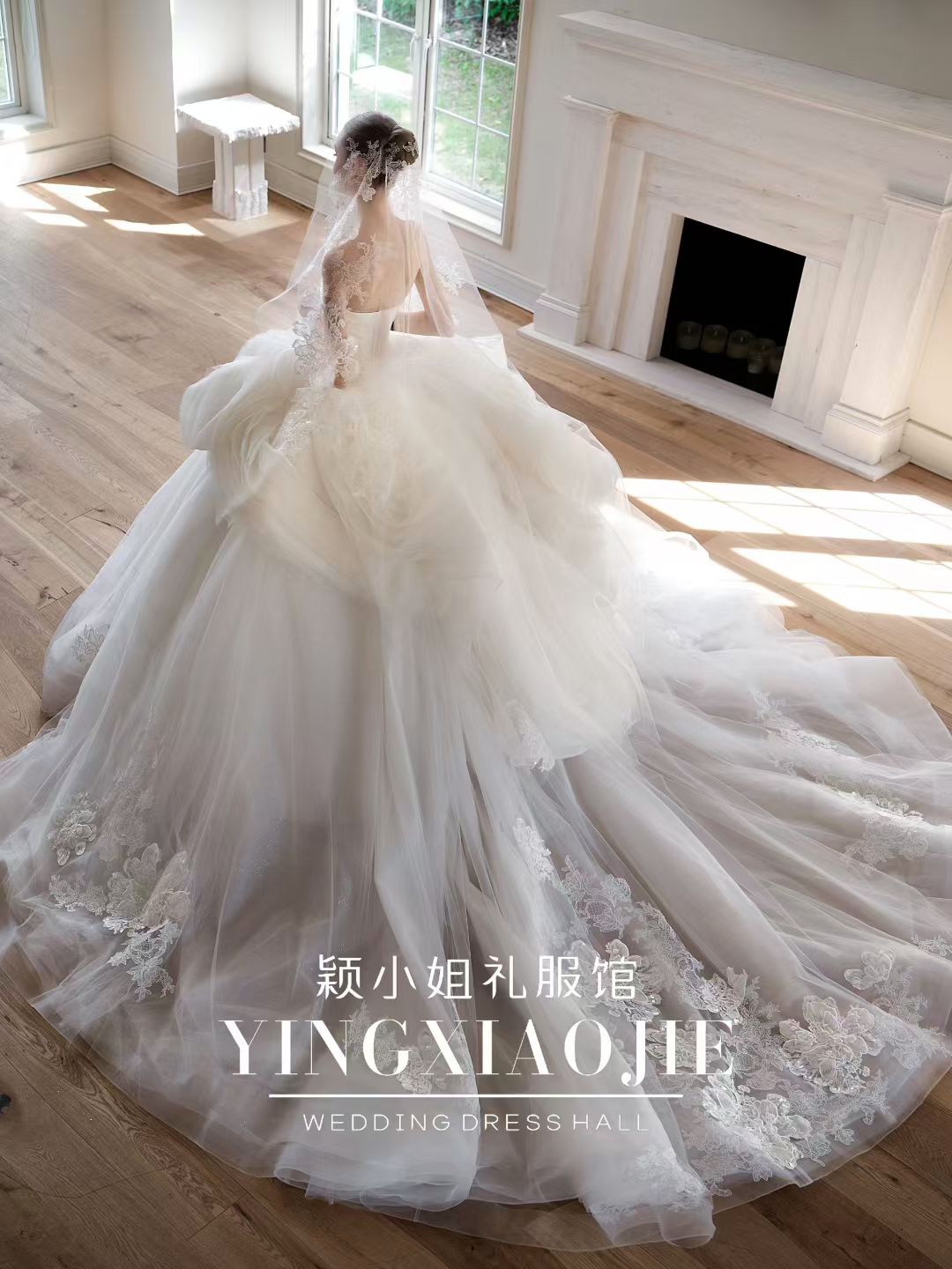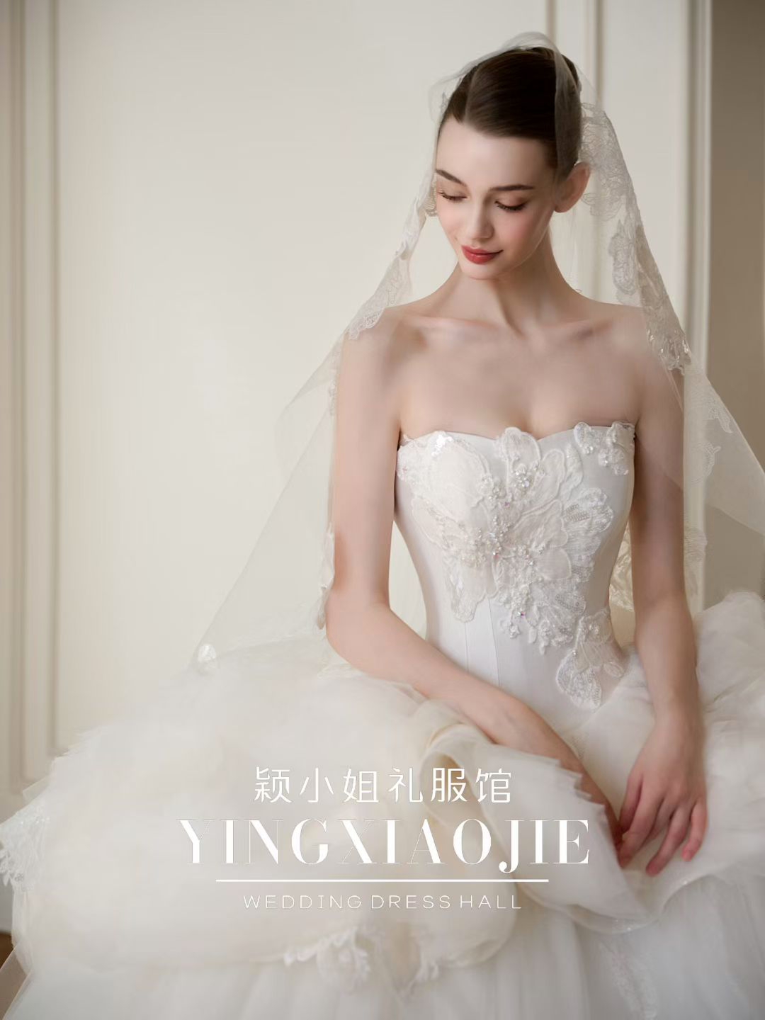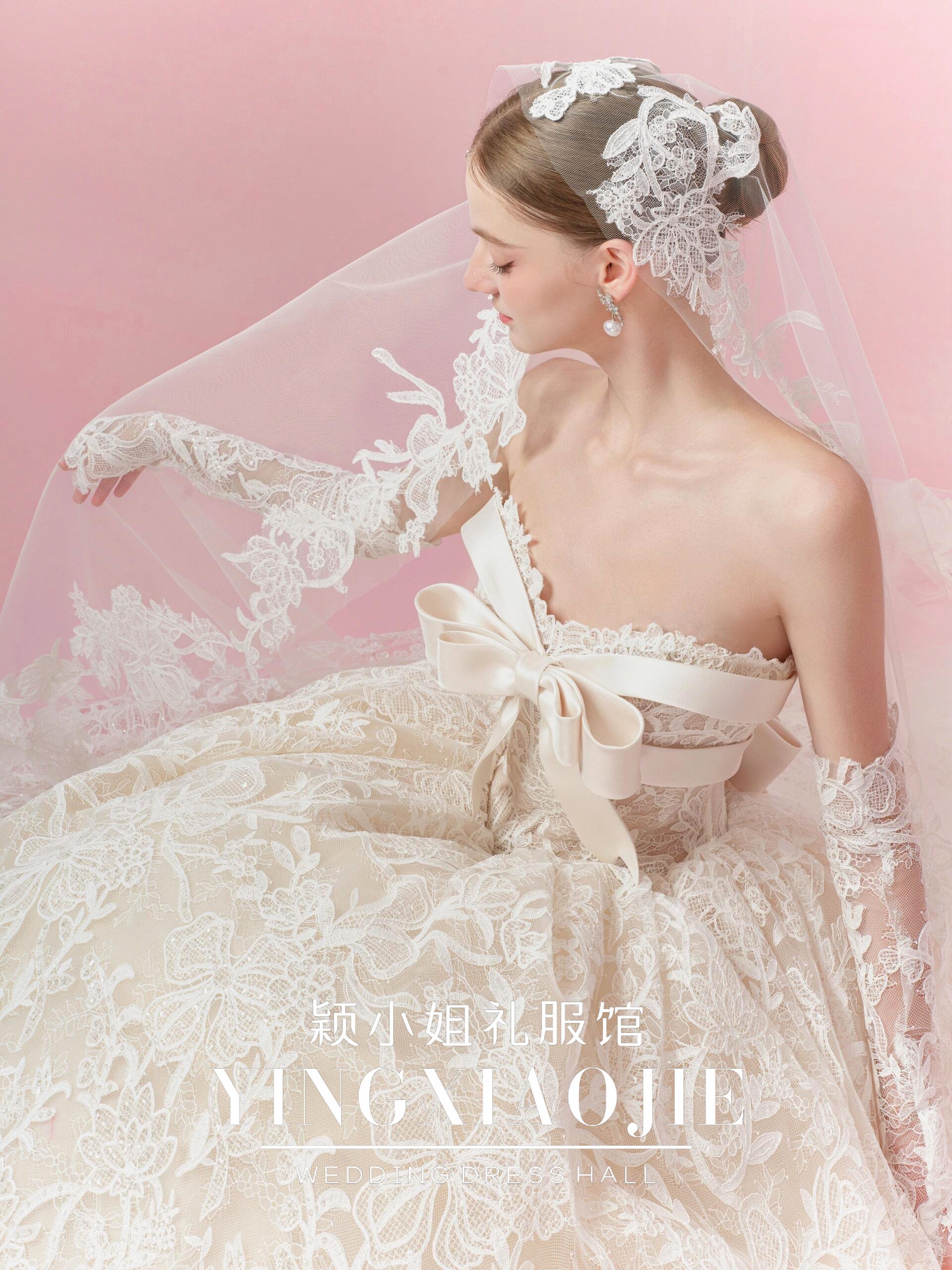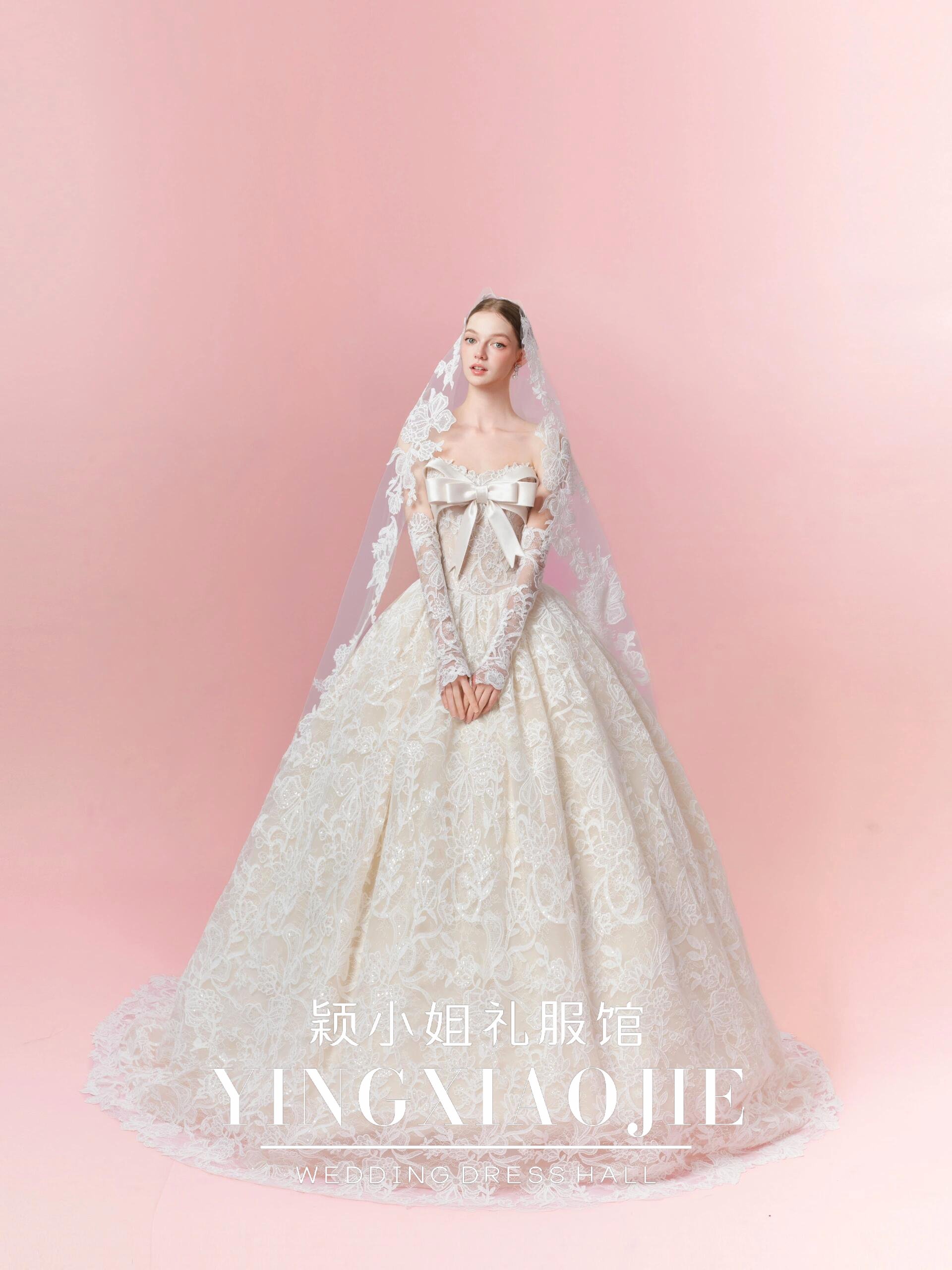 • 🦋蕾丝于蝴蝶结的温柔私语 月光白的丝绸裹着心跳 每一针刺绣都在说[我愿意] 🎀被蝴蝶结轻轻拖住的承诺 蓬纱藏起少女时代的幻想 #少女感婚纱