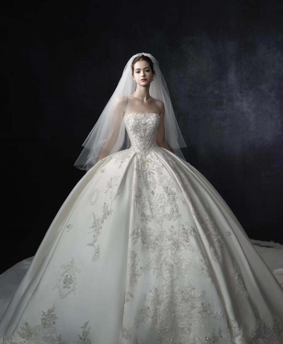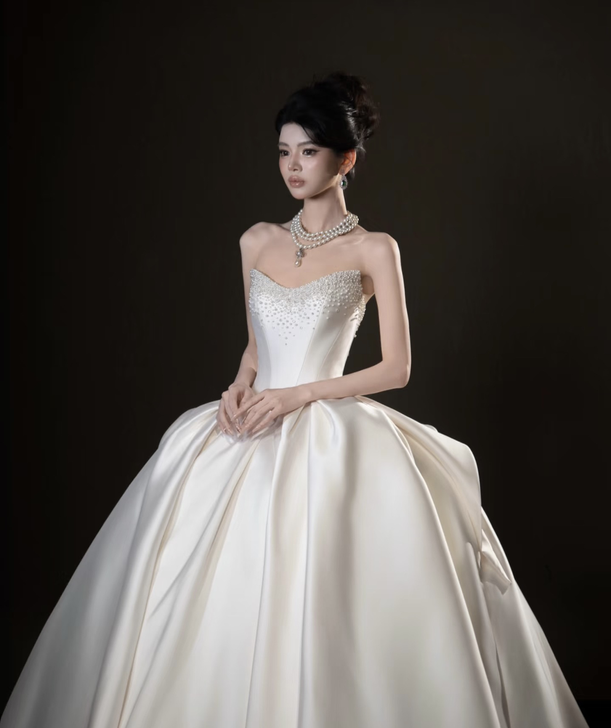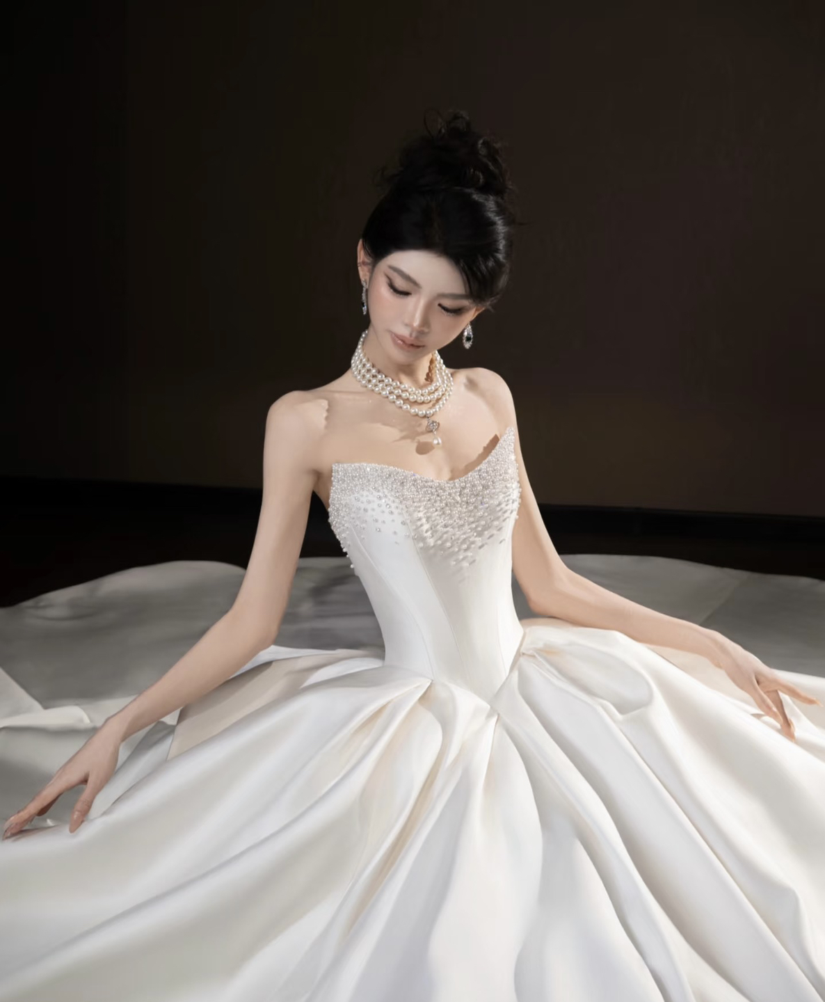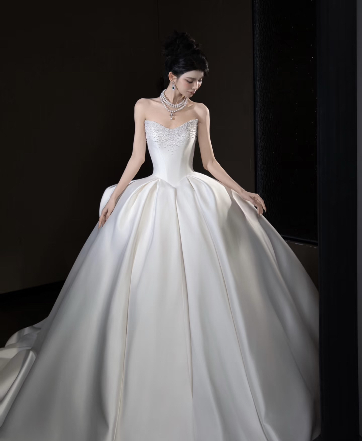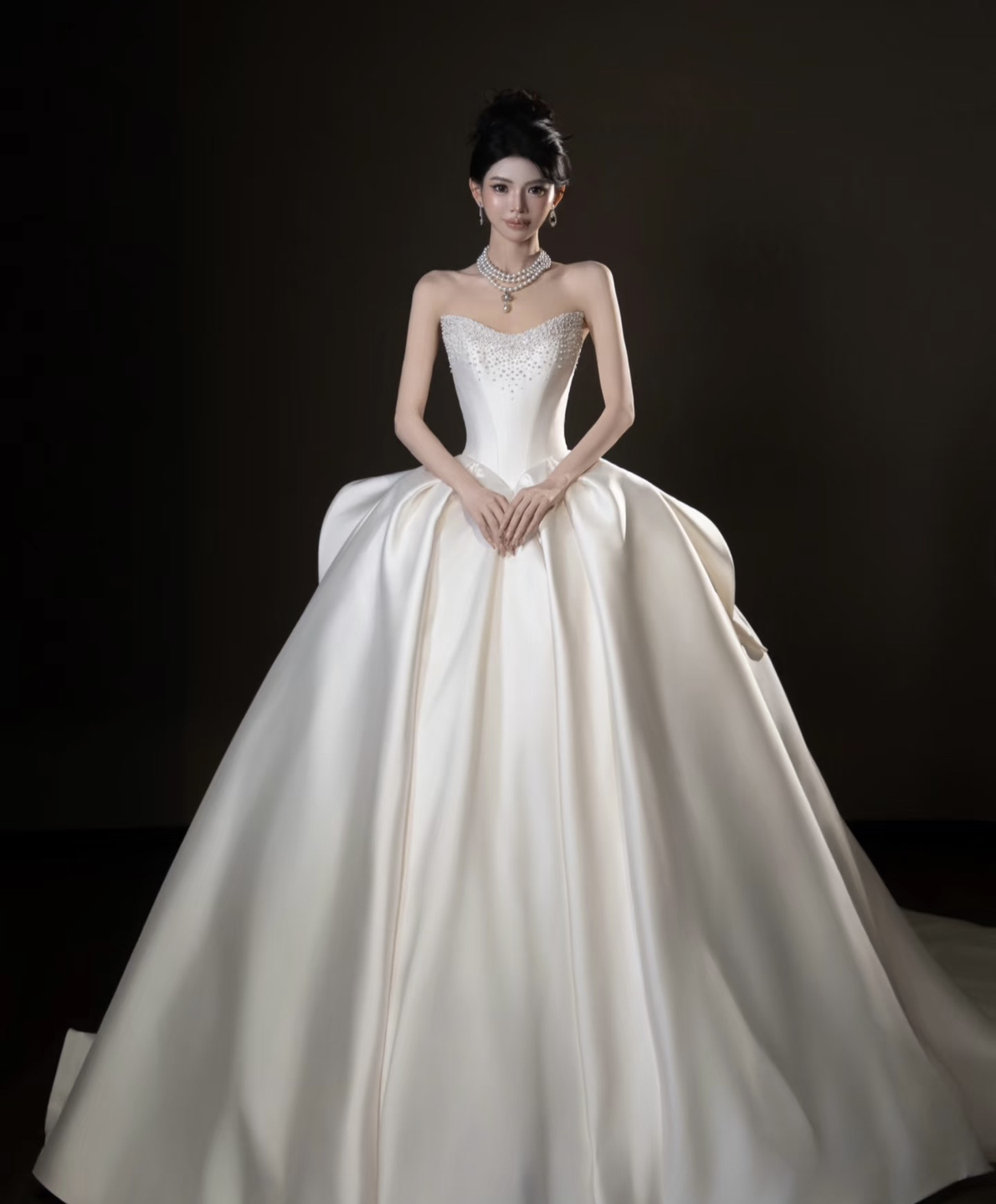 • #白月光缎面婚纱 在爱的梦幻诗篇里,抹胸缎面拖尾婚纱宛如最美的那行情诗。细腻的缎面,仿若被月光亲吻过的湖面,泛着柔和且迷人的光泽。抹胸设计,大方展露精致锁骨与优美肩线,似是在诉说着少女心底的羞涩与期待。长长的拖尾自身后迤逦展开,如银河倾落,每一步的移动,都像是在编织着浪漫的梦。当新娘身着它缓缓走来,时间仿佛都为这份绝美而驻足,那是爱情最动人的模样,纯粹、圣洁且永恒。