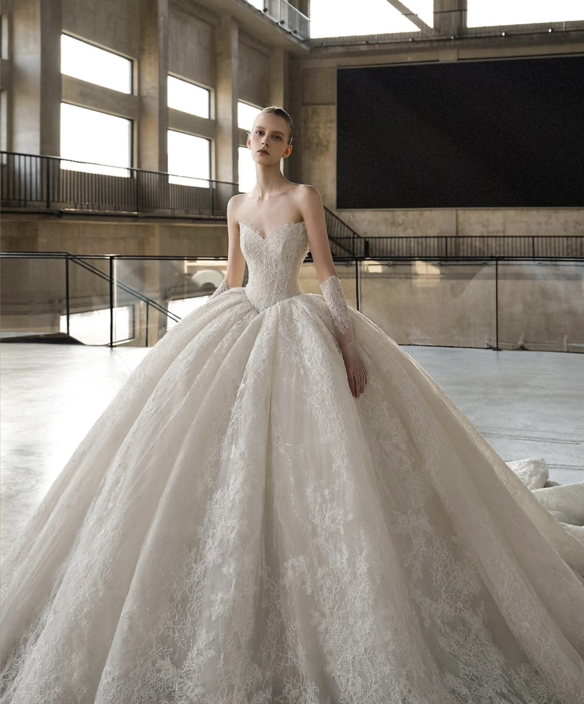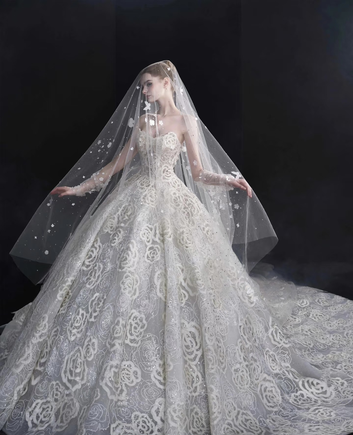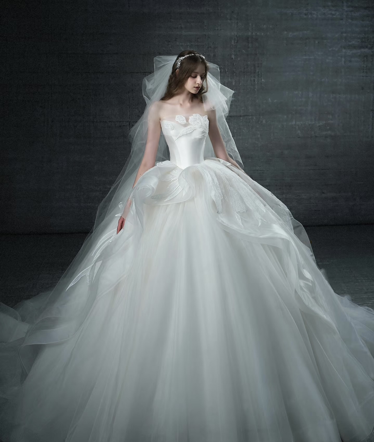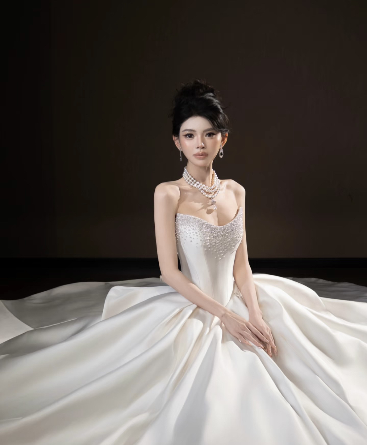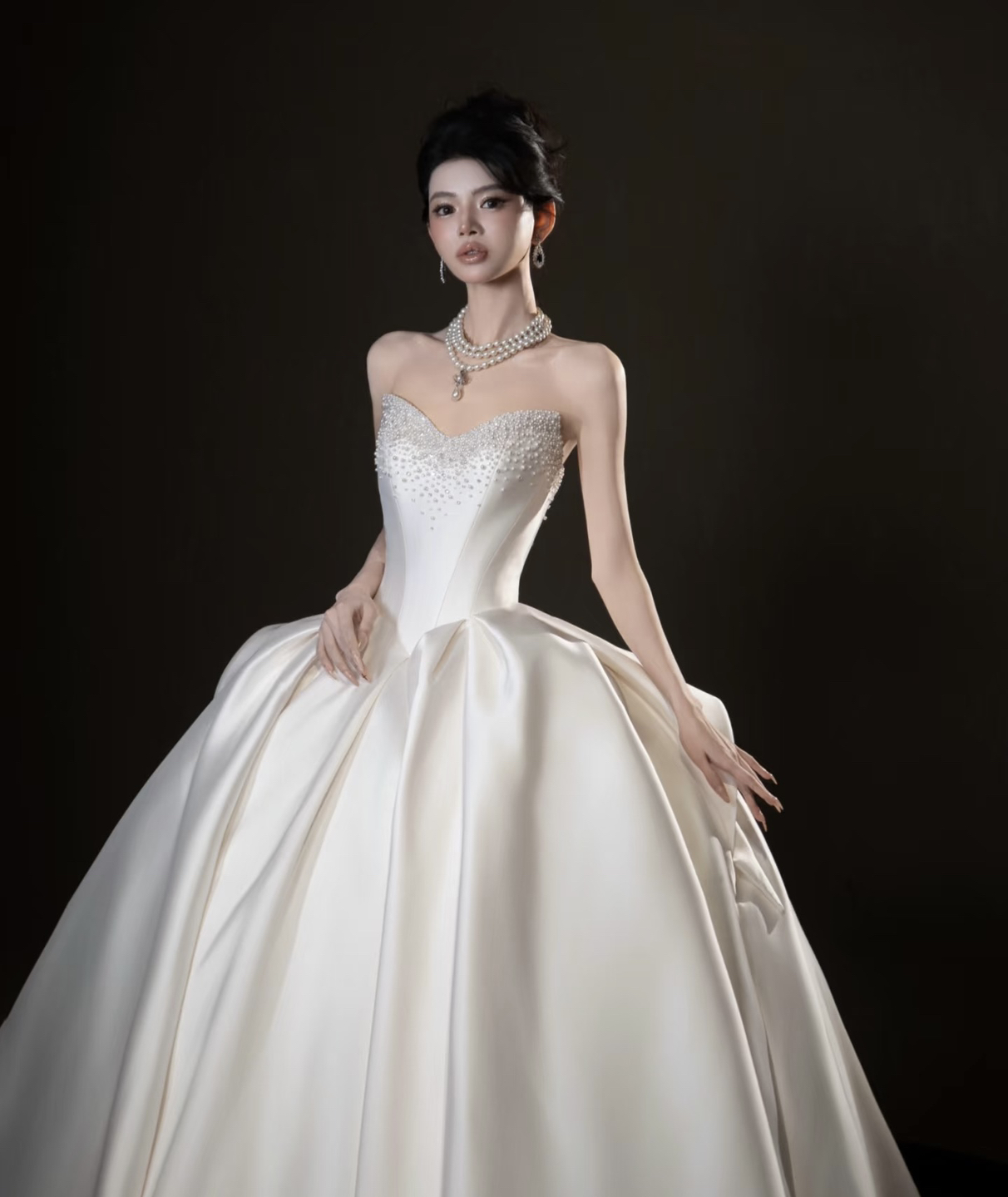 • #白月光缎面婚纱 在爱的梦幻诗篇里,抹胸缎面拖尾婚纱宛如最美的那行情诗。细腻的缎面,仿若被月光亲吻过的湖面,泛着柔和且迷人的光泽。抹胸设计,大方展露精致锁骨与优美肩线,似是在诉说着少女心底的羞涩与期待。长长的拖尾自身后迤逦展开,如银河倾落,每一步的移动,都像是在编织着浪漫的梦。当新娘身着它缓缓走来,时间仿佛都为这份绝美而驻足,那是爱情最动人的模样,纯粹、圣洁且永恒。