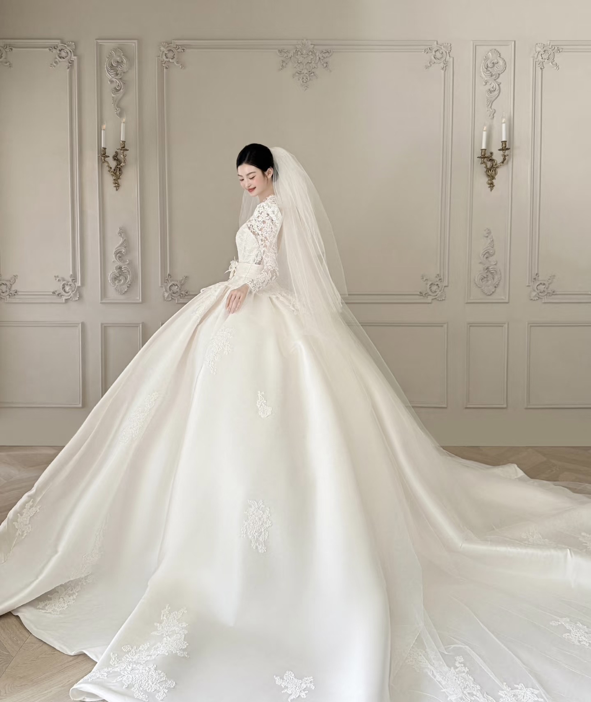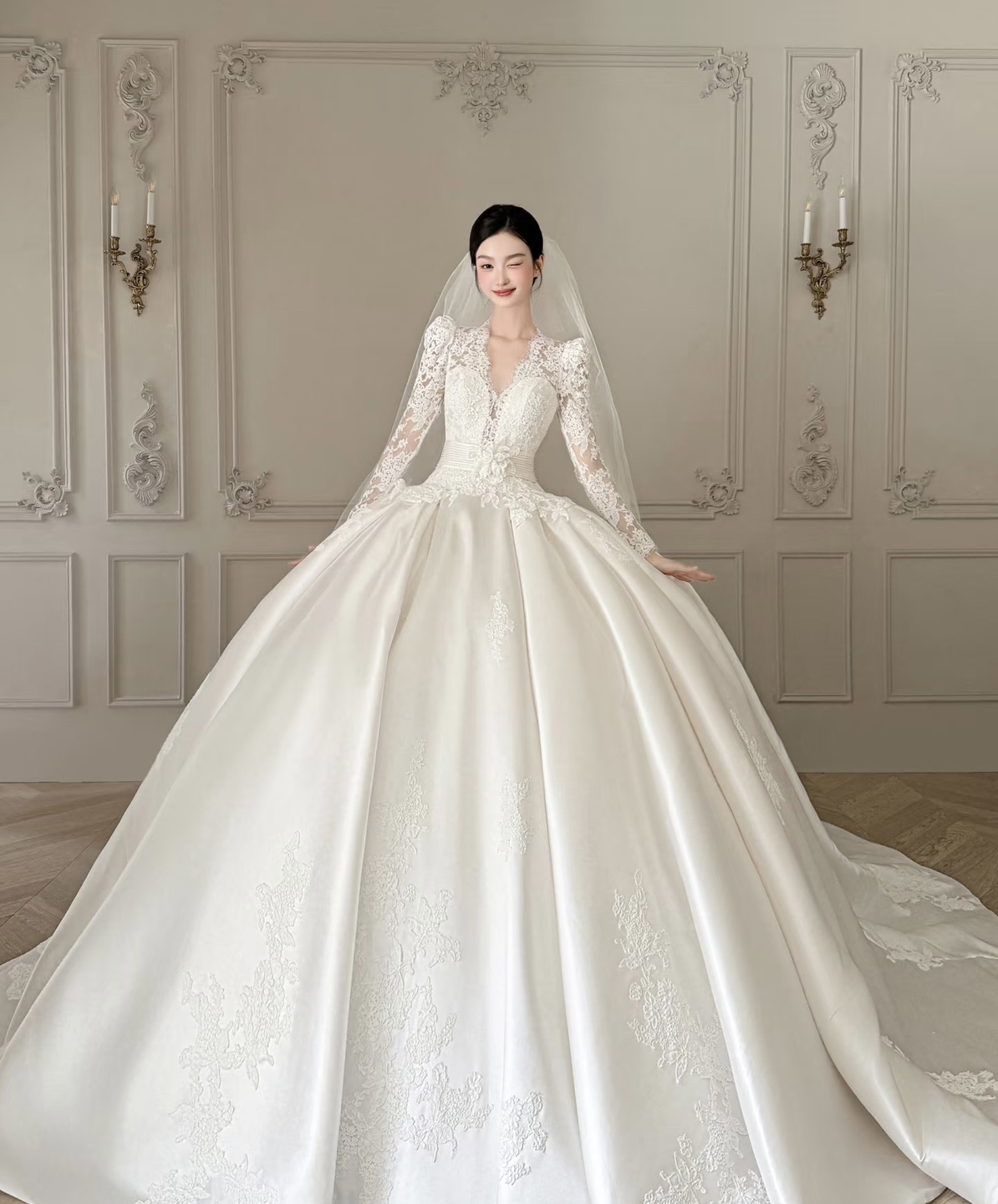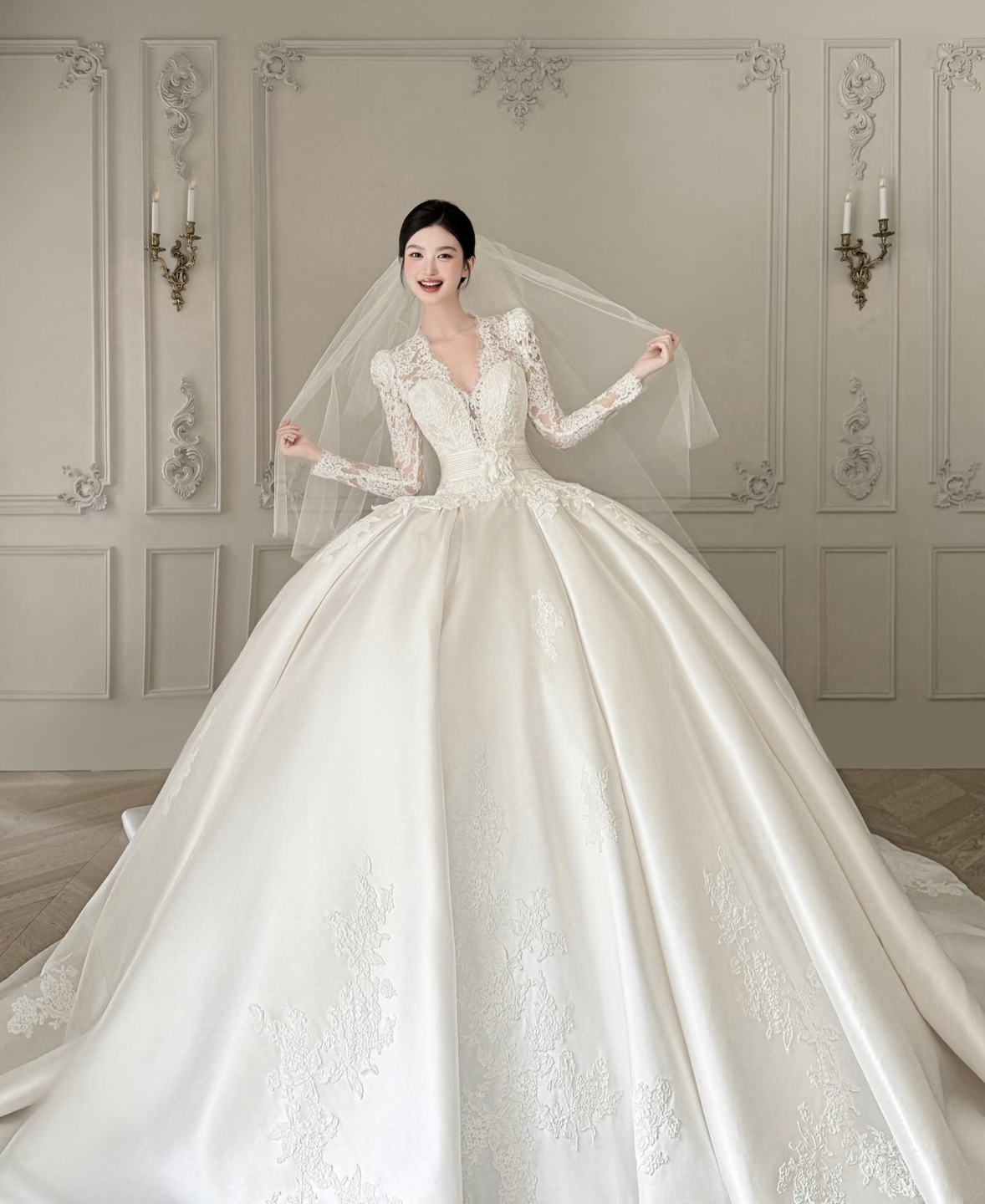 • #一眼心动的公主嫁衣 缎面是一种非常有质感的面料,表面光滑,光泽柔和,给人一种高级、典雅的感觉。就好像是一块细腻的丝绸,摸起来顺滑又舒服。比如像真丝缎,垂坠感特别好,穿在身上自然流畅。