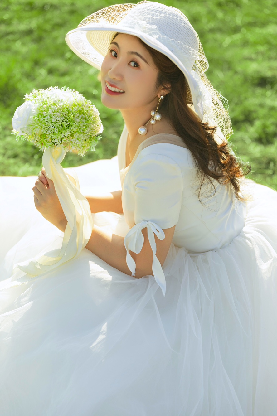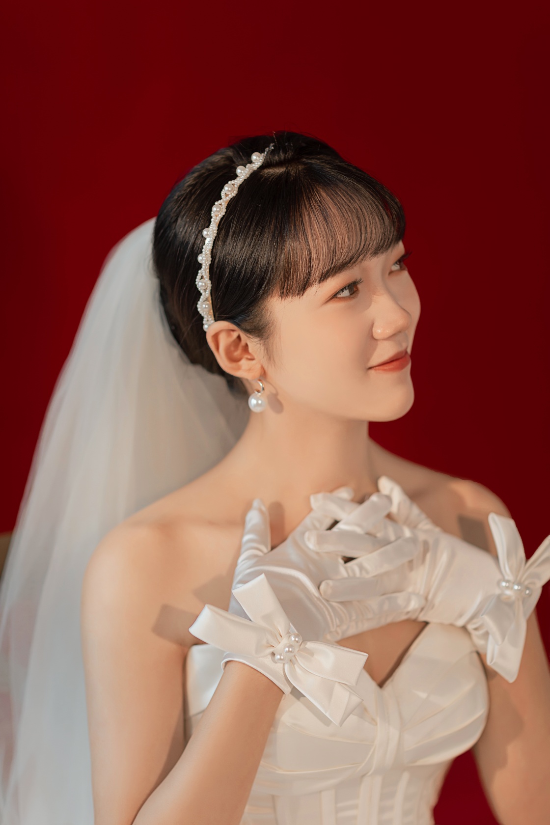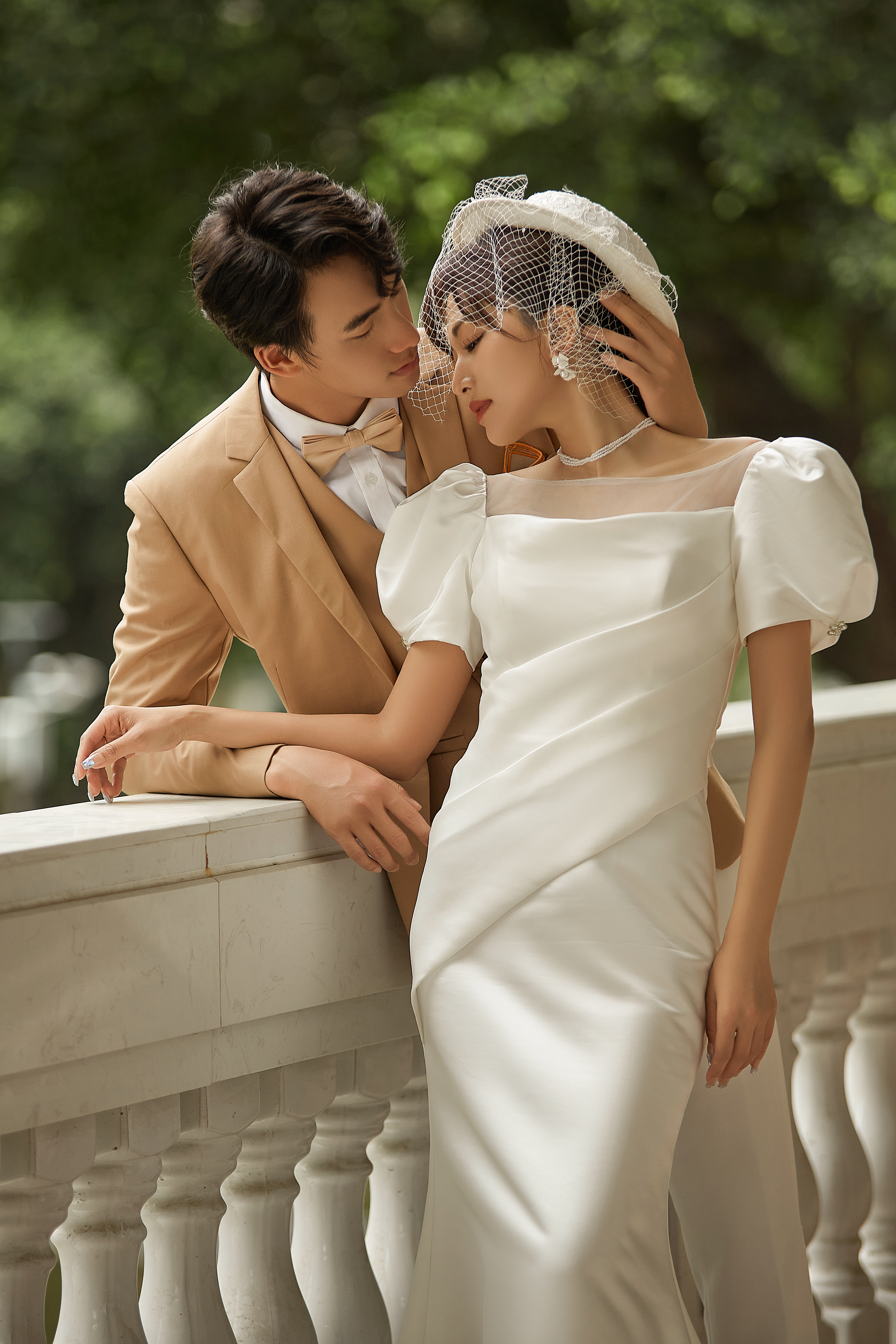 • 法式礼帽搭配蕾丝手套,与修身白纱尽显新娘的优雅 。#2023热门婚纱照风格