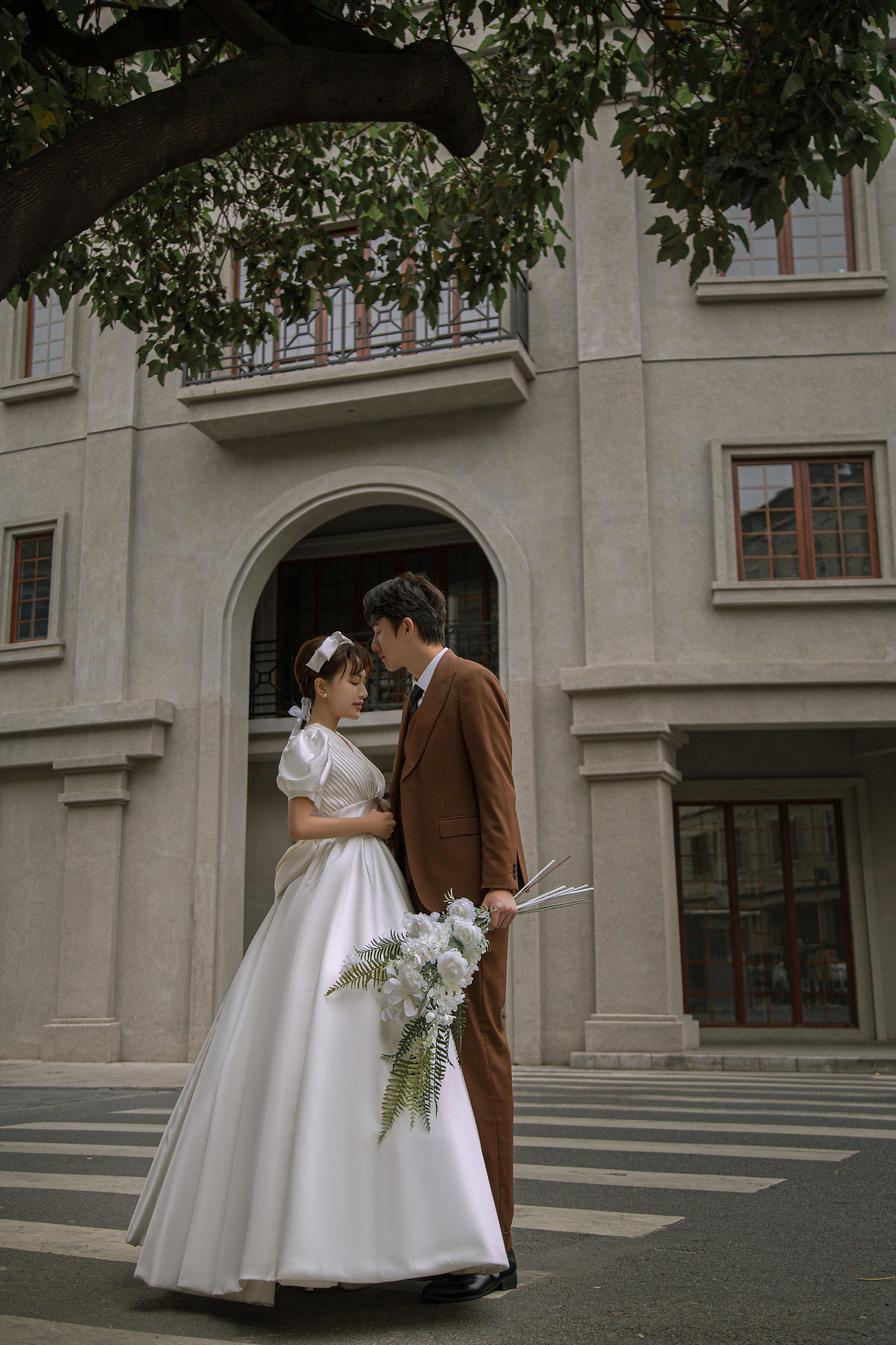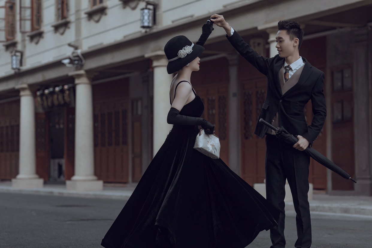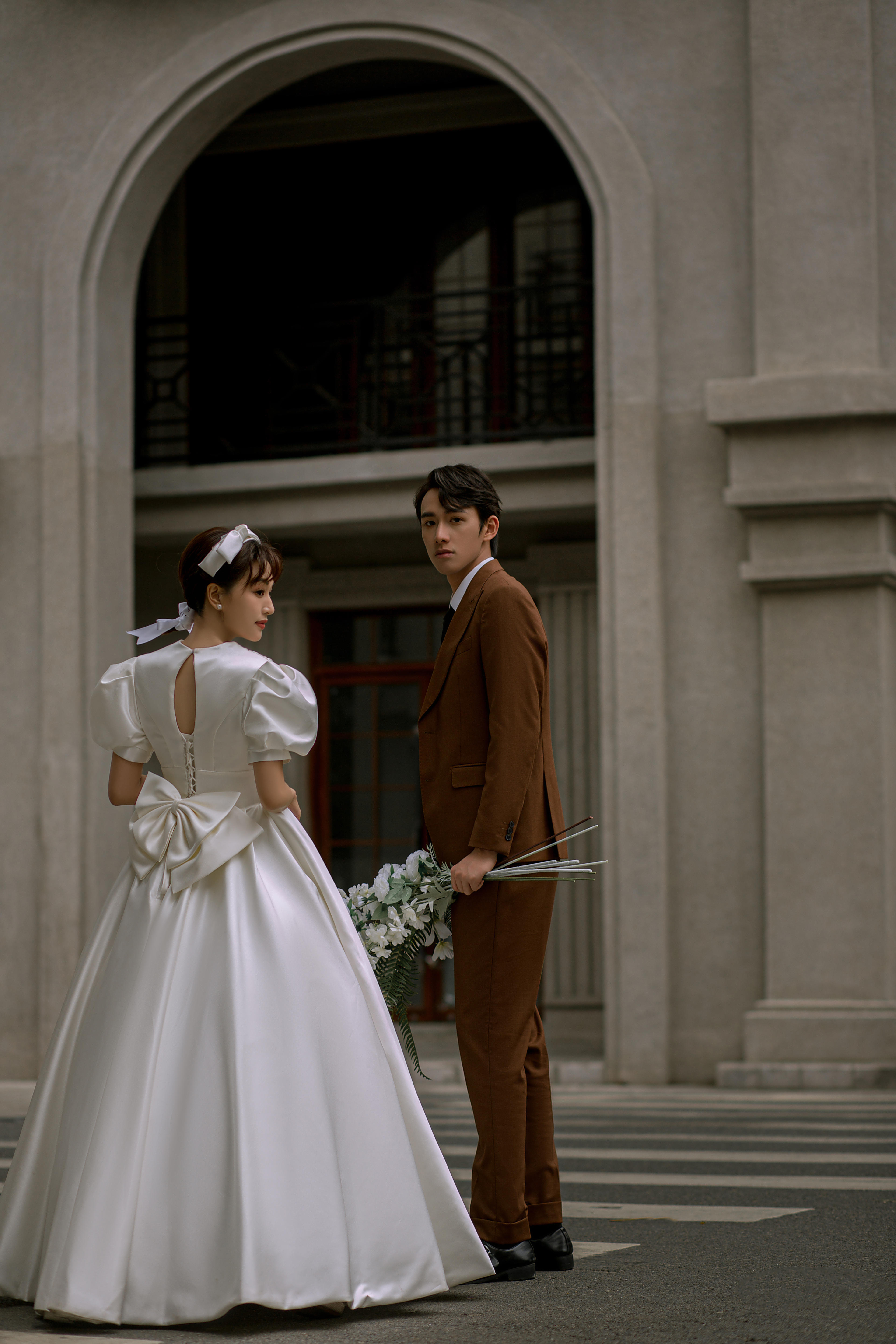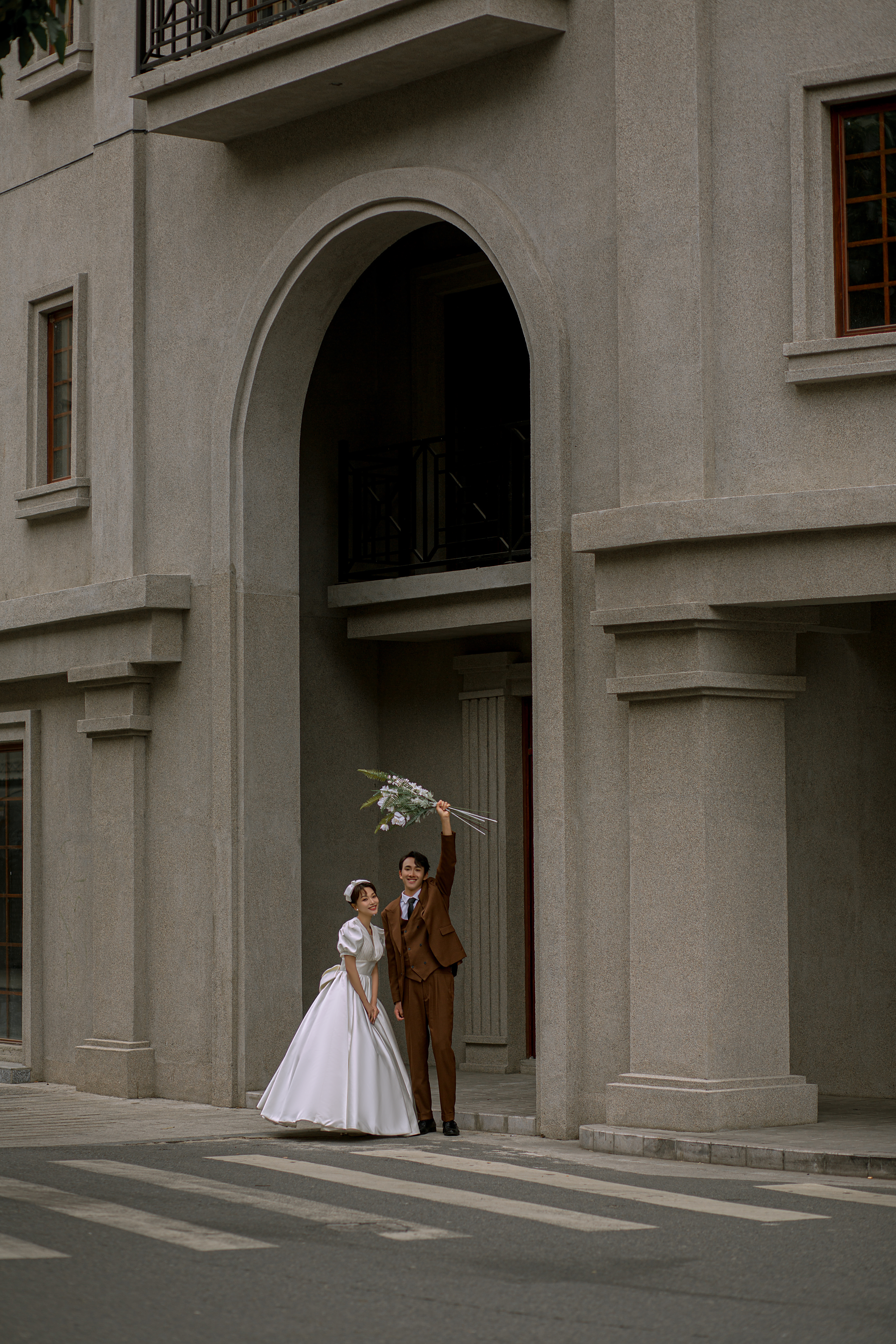 • 老式区复古建筑搭配法式婚纱,礼帽配搭蕾丝手套承托新娘优雅气质。#2023热门婚纱照风格