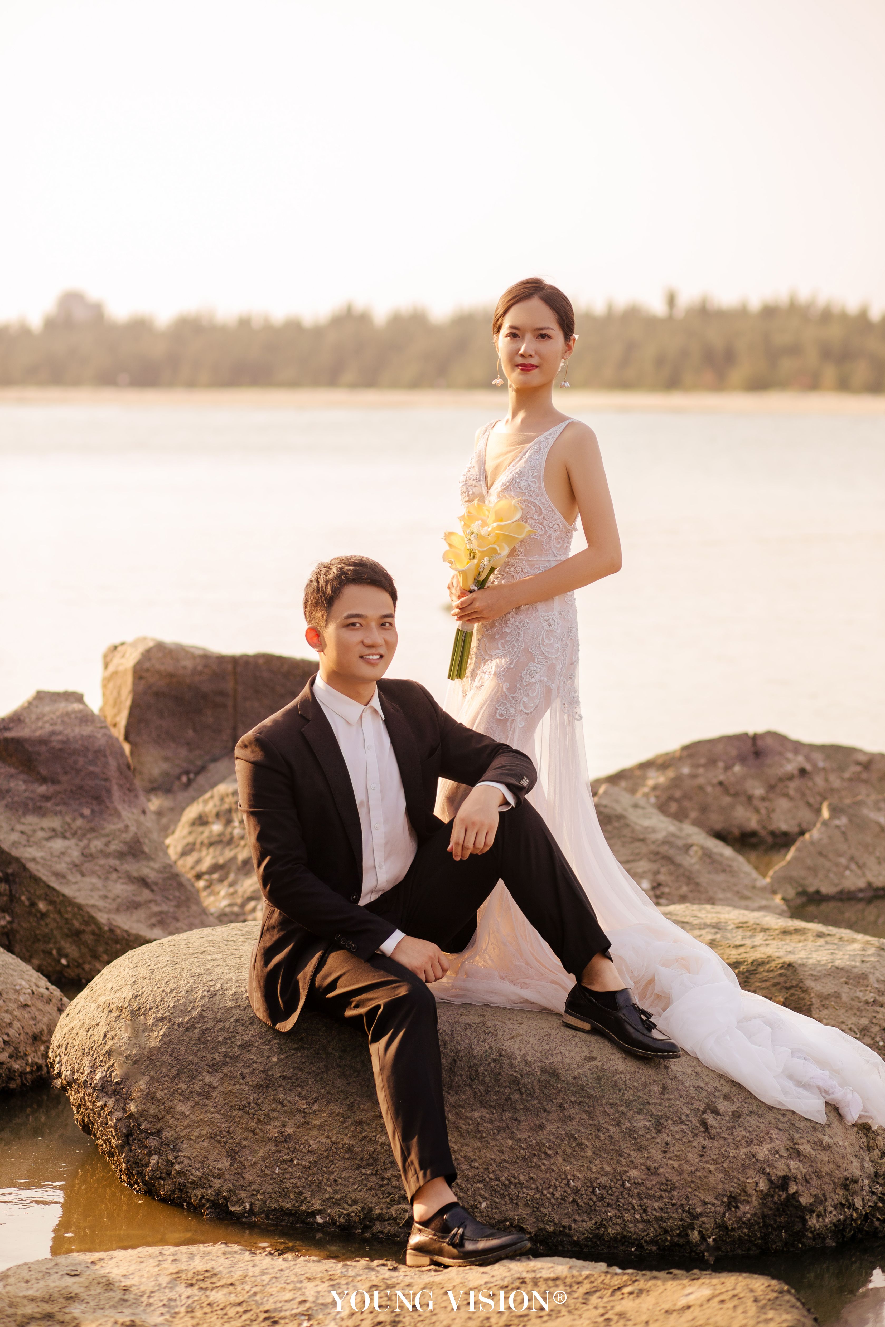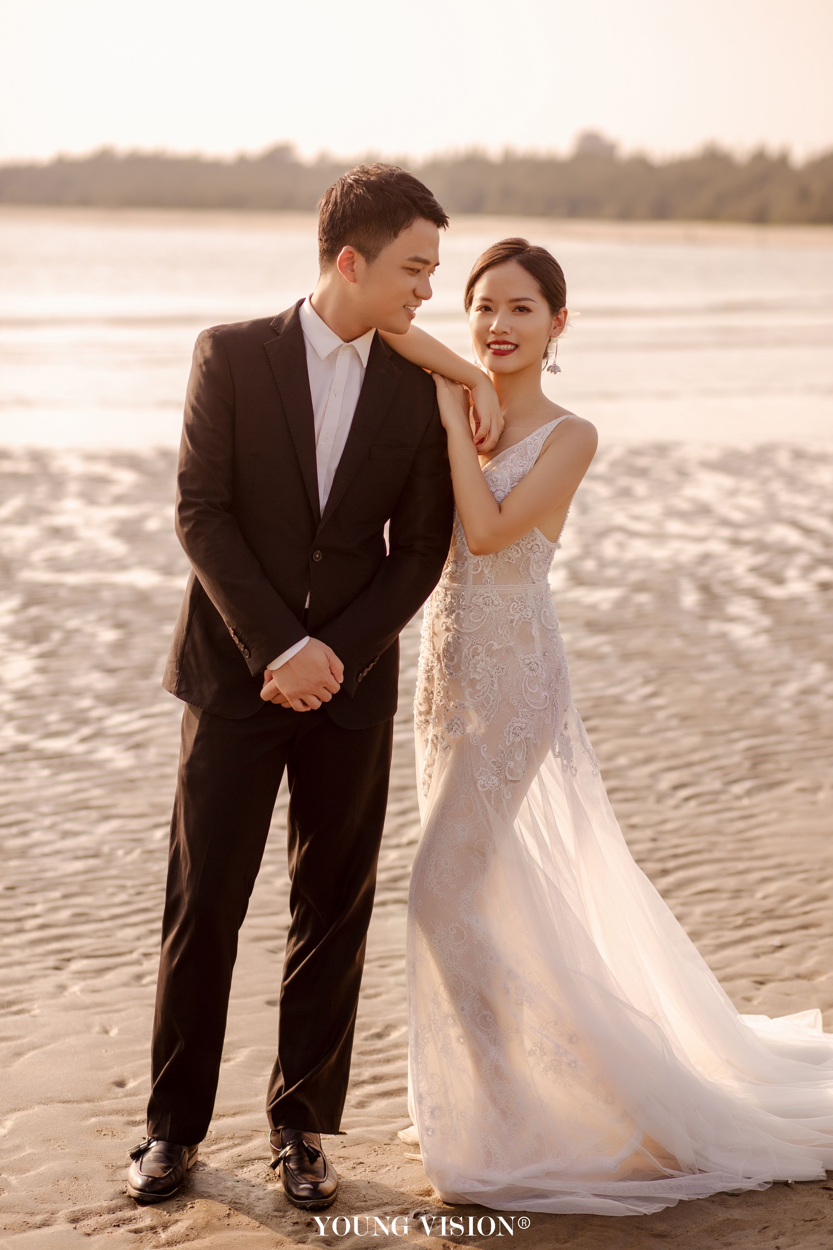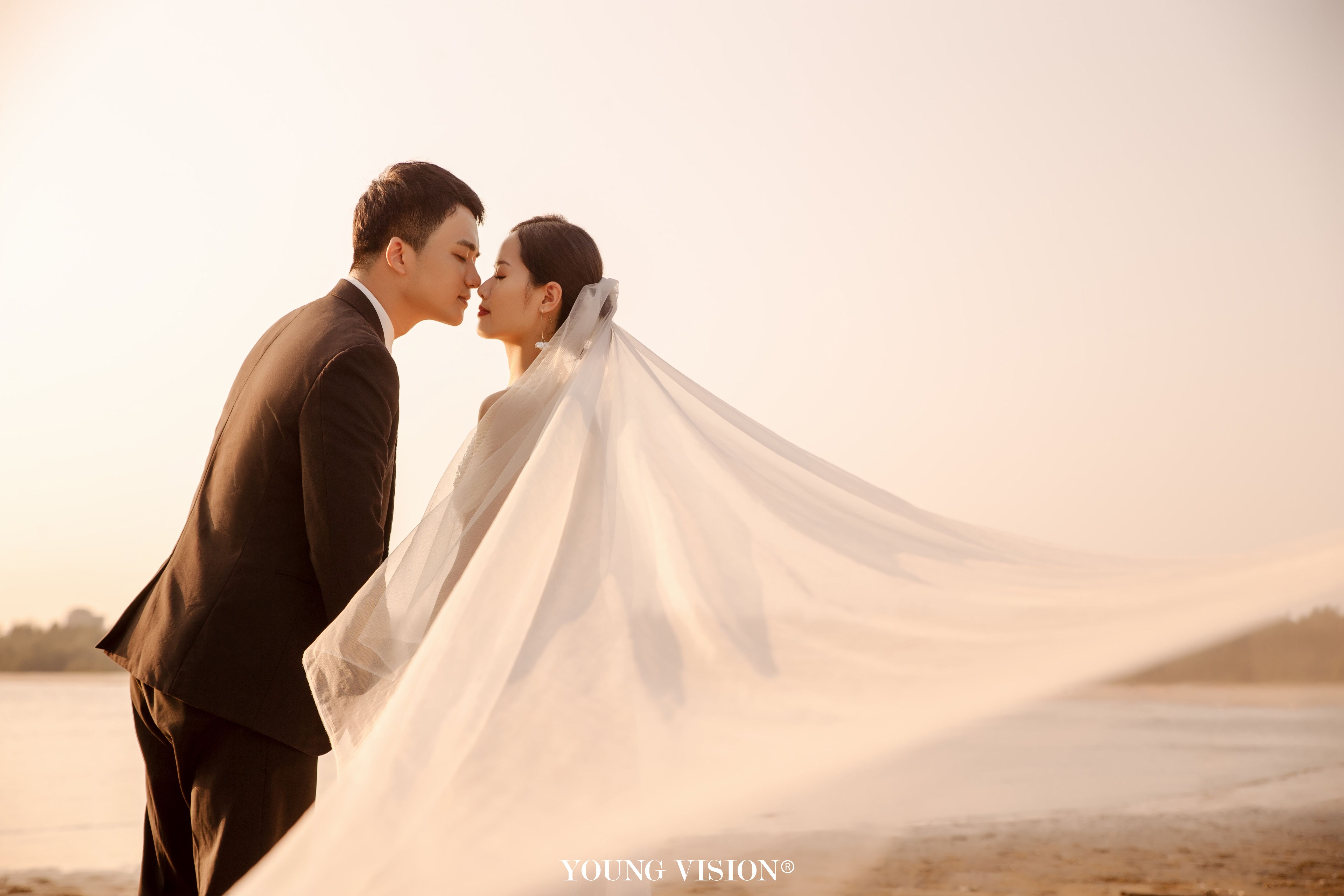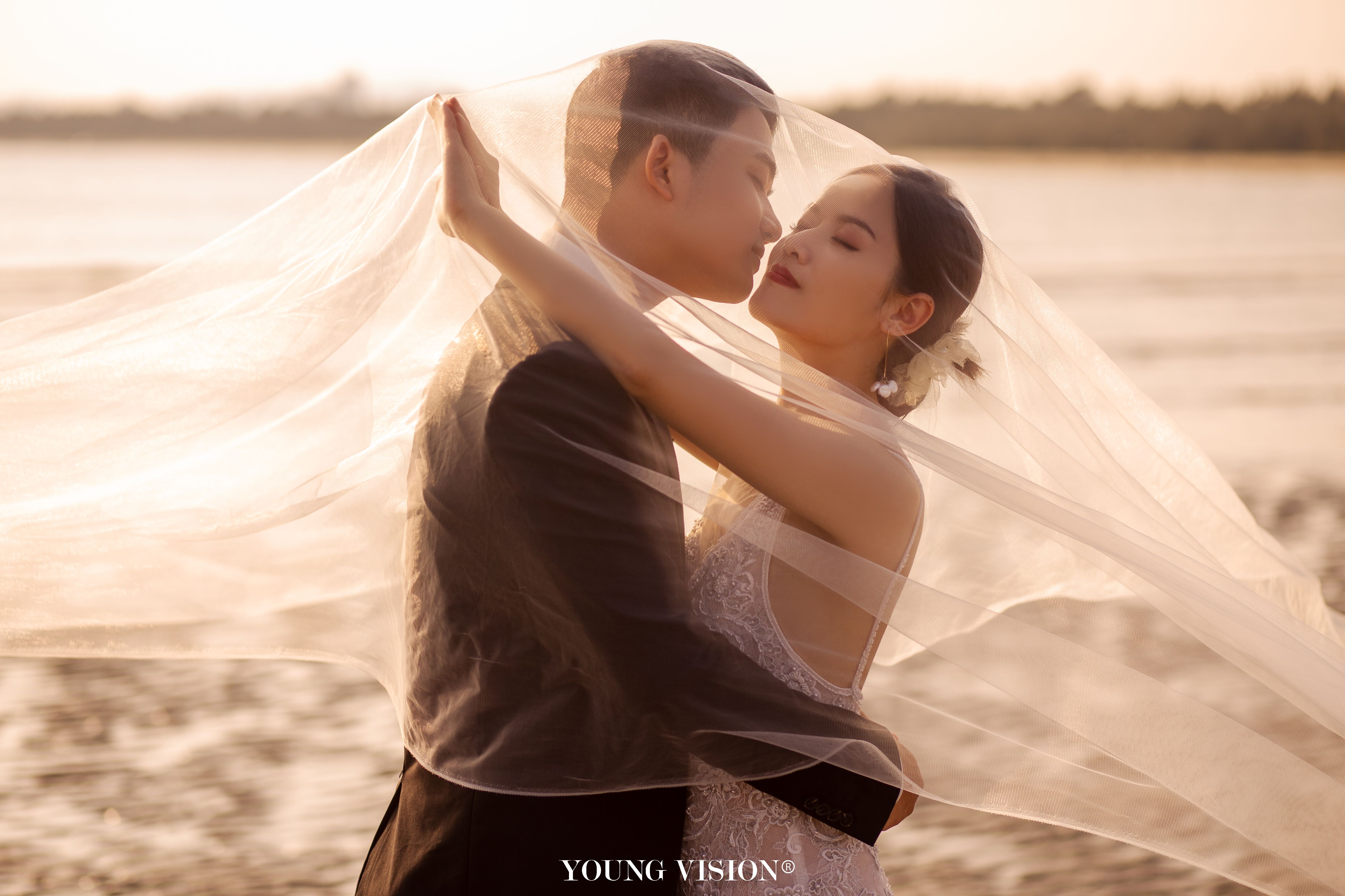• 自然舒适的夕阳余晖 落日的色调带着氤氲的美好 书写一封浪漫的海边情书 逆光的朦胧 酝酿着浓郁的爱意 让每一张婚照都带着璀璨的光芒