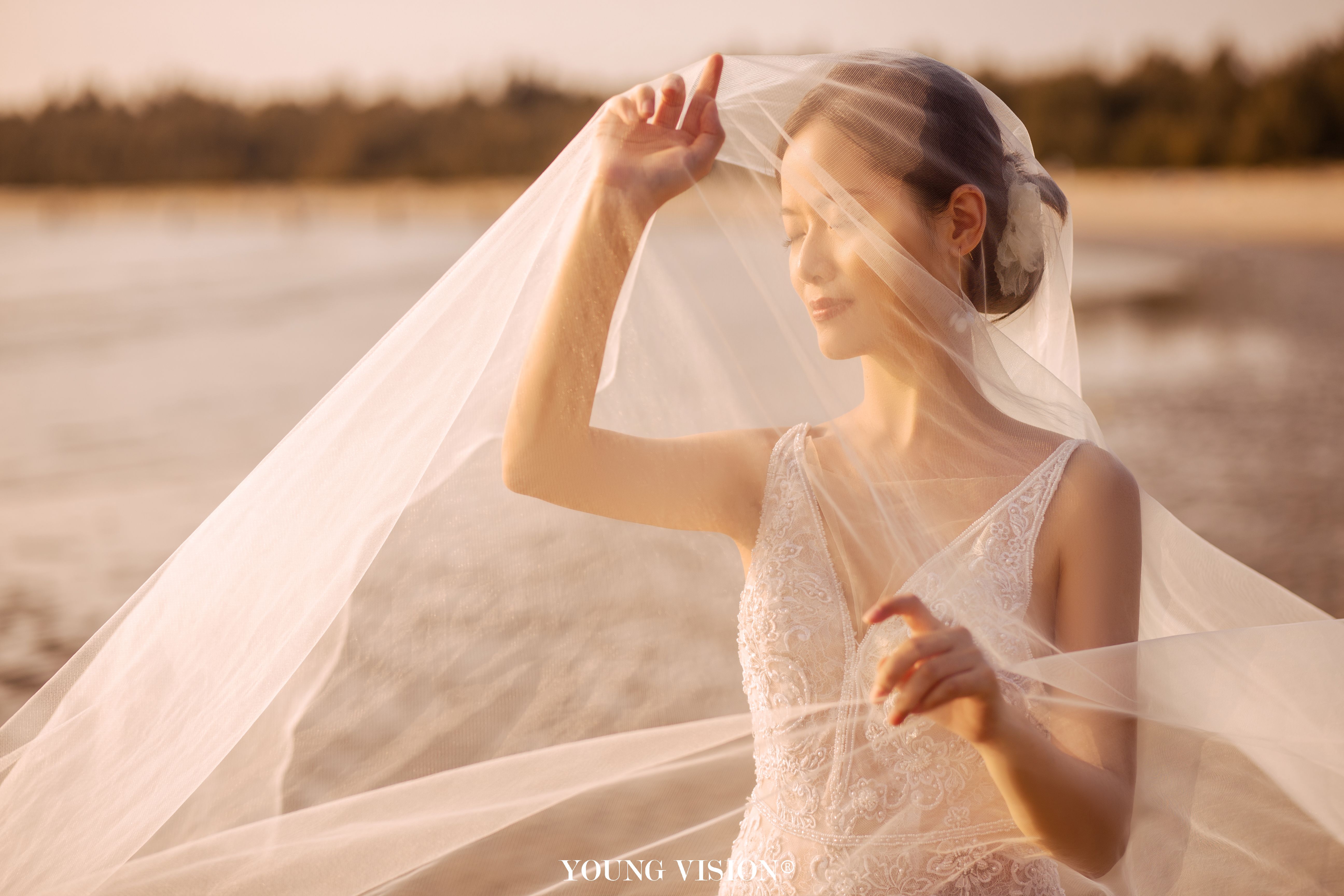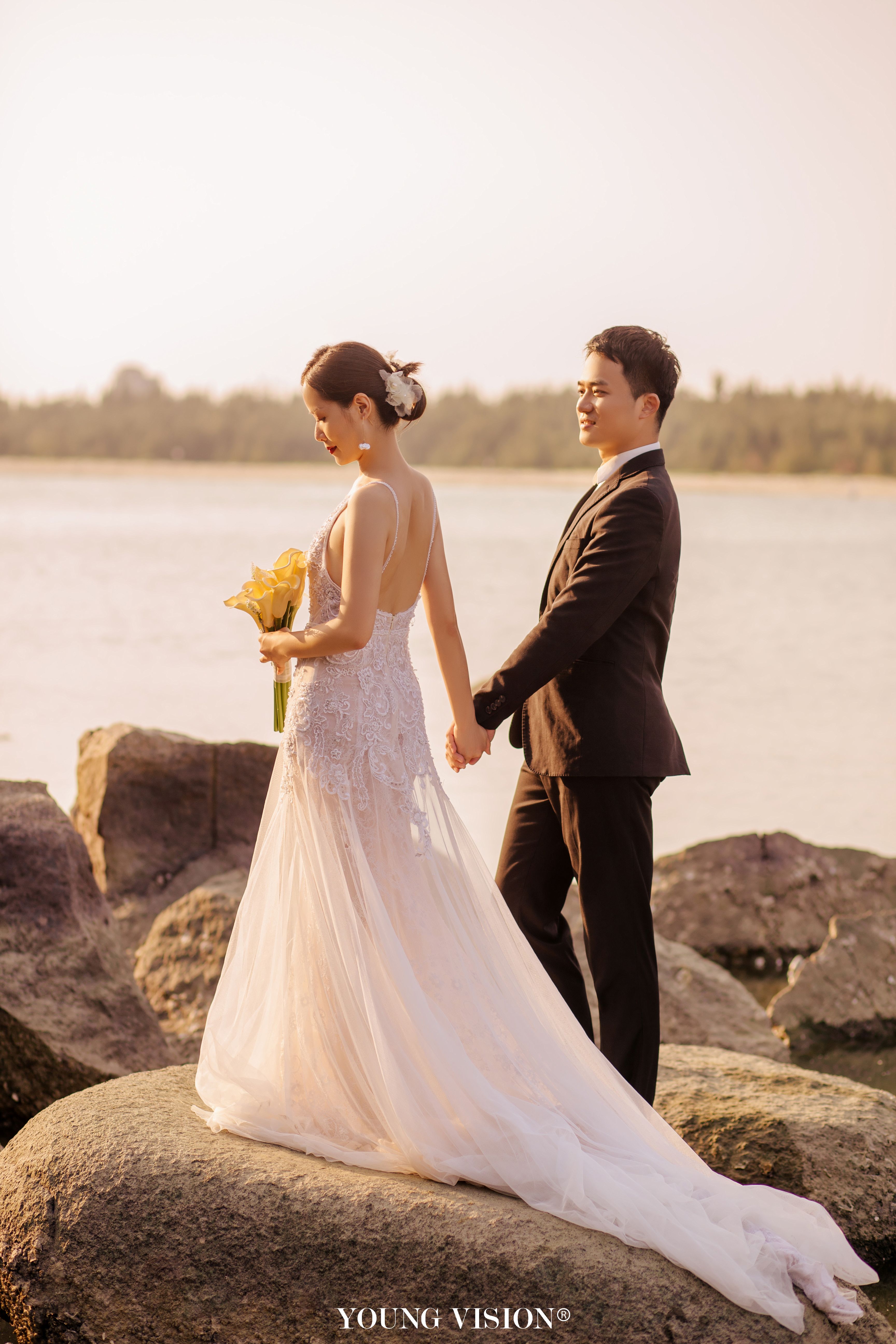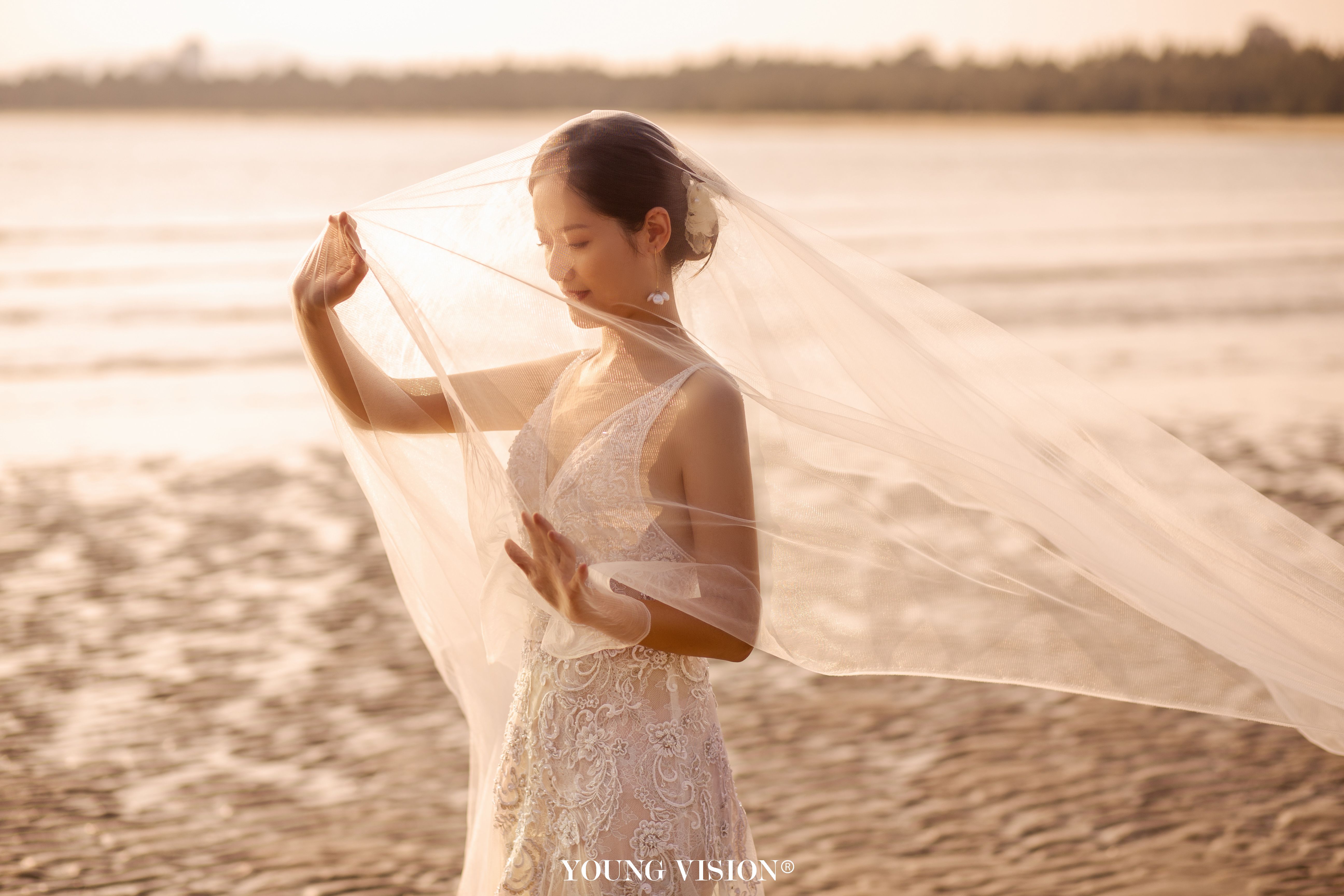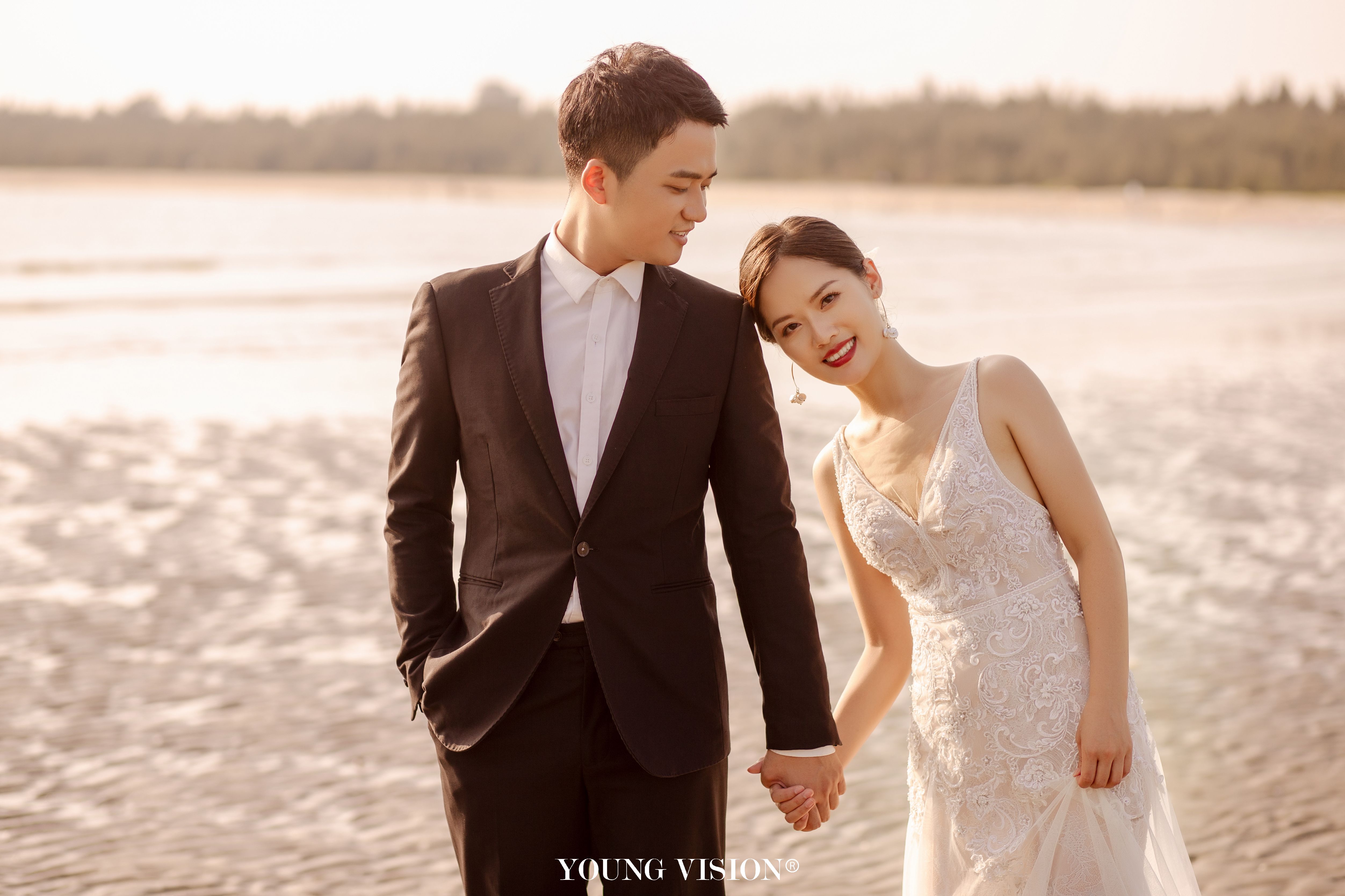 • 自然舒适的夕阳余晖 落日的色调带着氤氲的美好 书写一封浪漫的海边情书 逆光的朦胧 酝酿着浓郁的爱意 让每一张婚照都带着璀璨的光芒