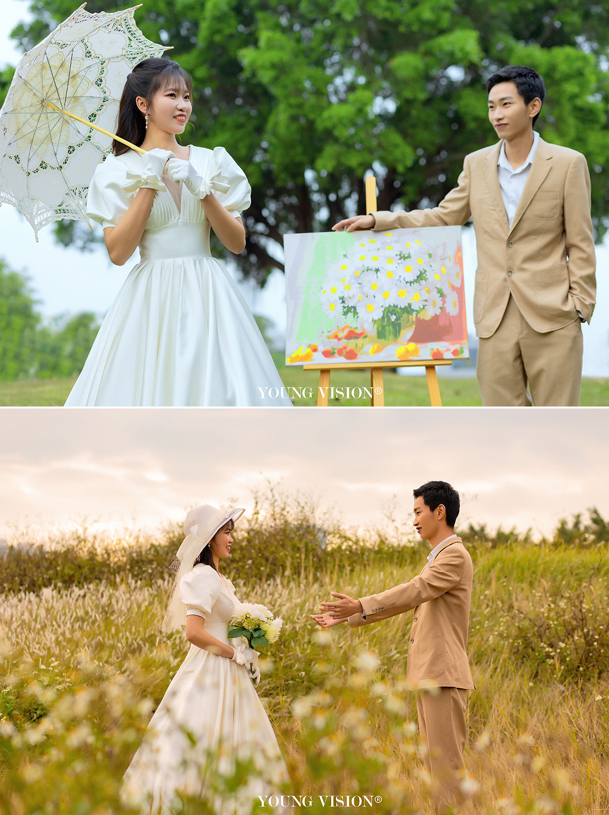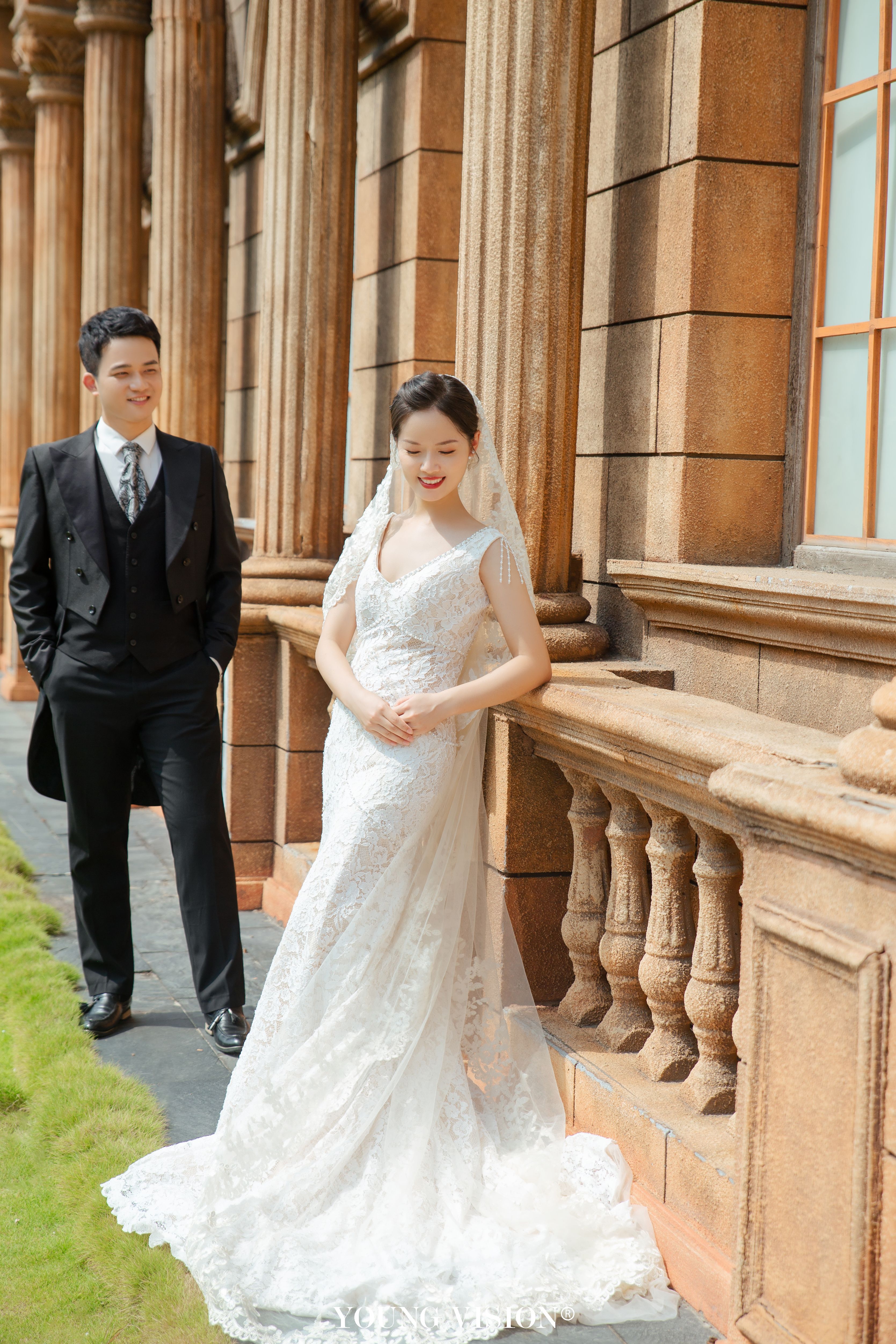 • 在东方园林与西方建筑的融合中 复刻民国时期的婚照造型 温柔古典 洋溢着上世纪的时光感 大量运用远景和中景 不管是眺望还是对视 在镜头前发挥出现代美学的内涵