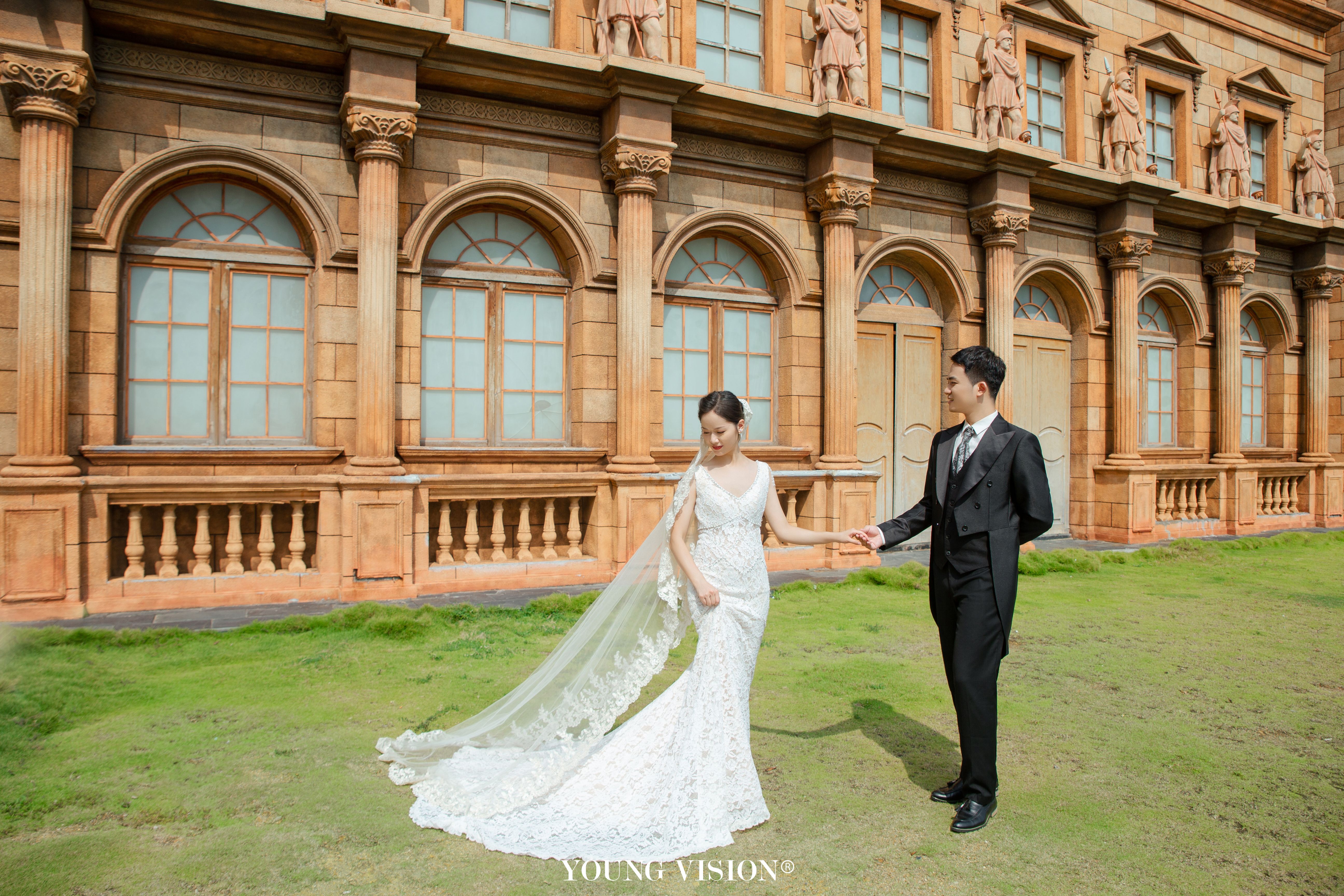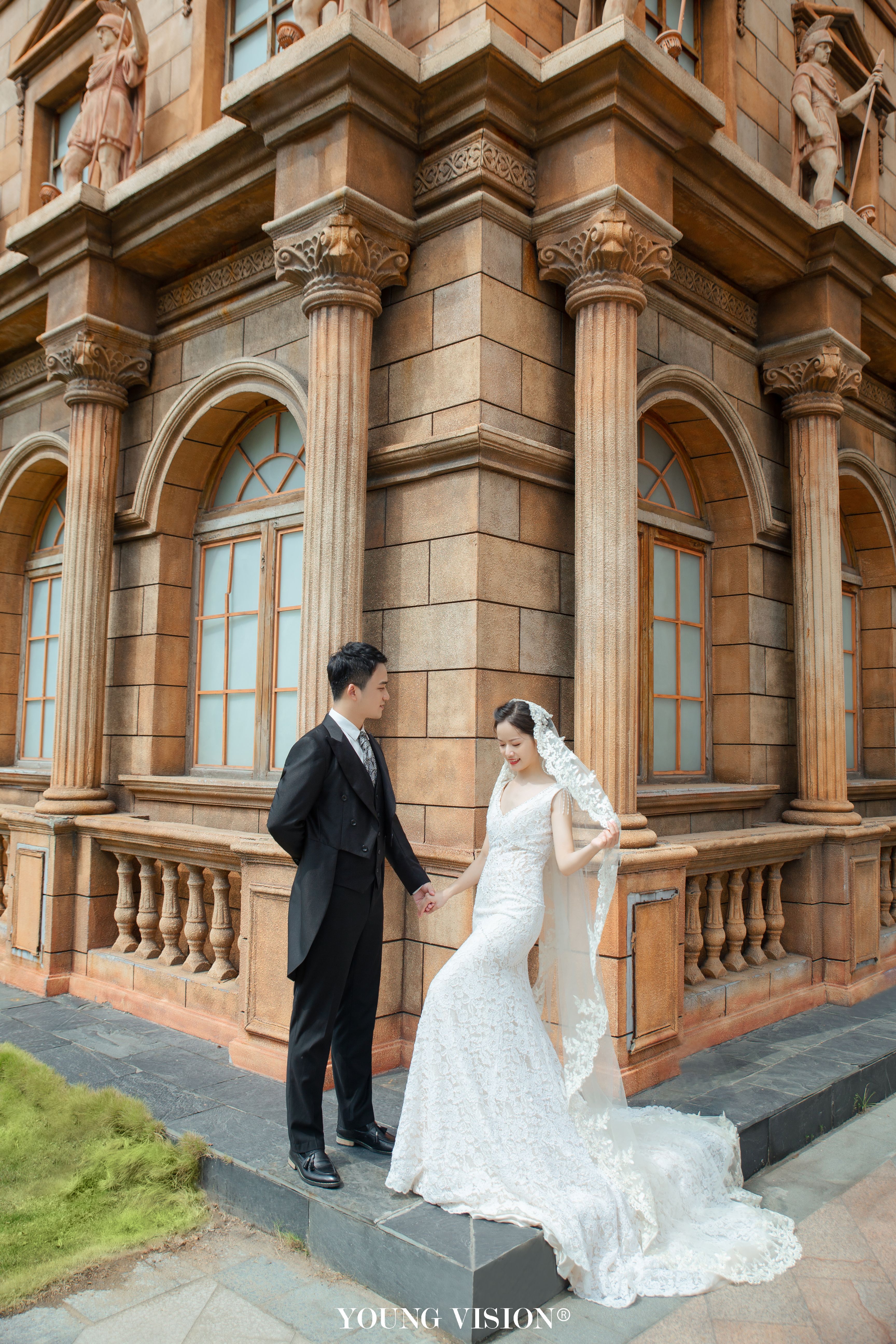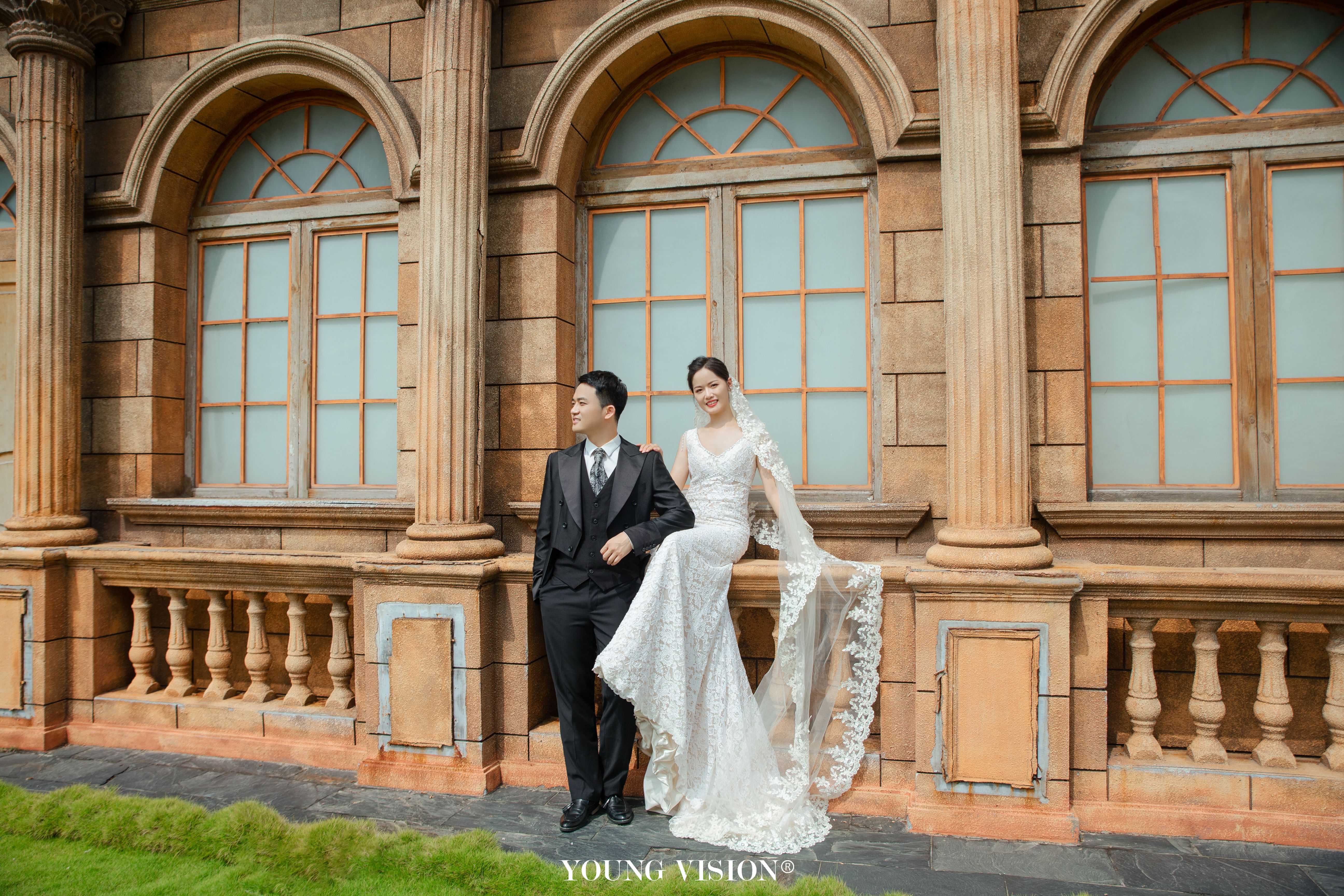 • 典型的欧式建筑,自带法式风情 高贵优雅的长拖尾白纱 化身欧洲宫廷淑女 静谧辉煌的古堡殿堂 展现了公主与王子的完美童话故事 在欧式场景中演绎永恒的爱情 碰撞出浪漫绮丽的画面