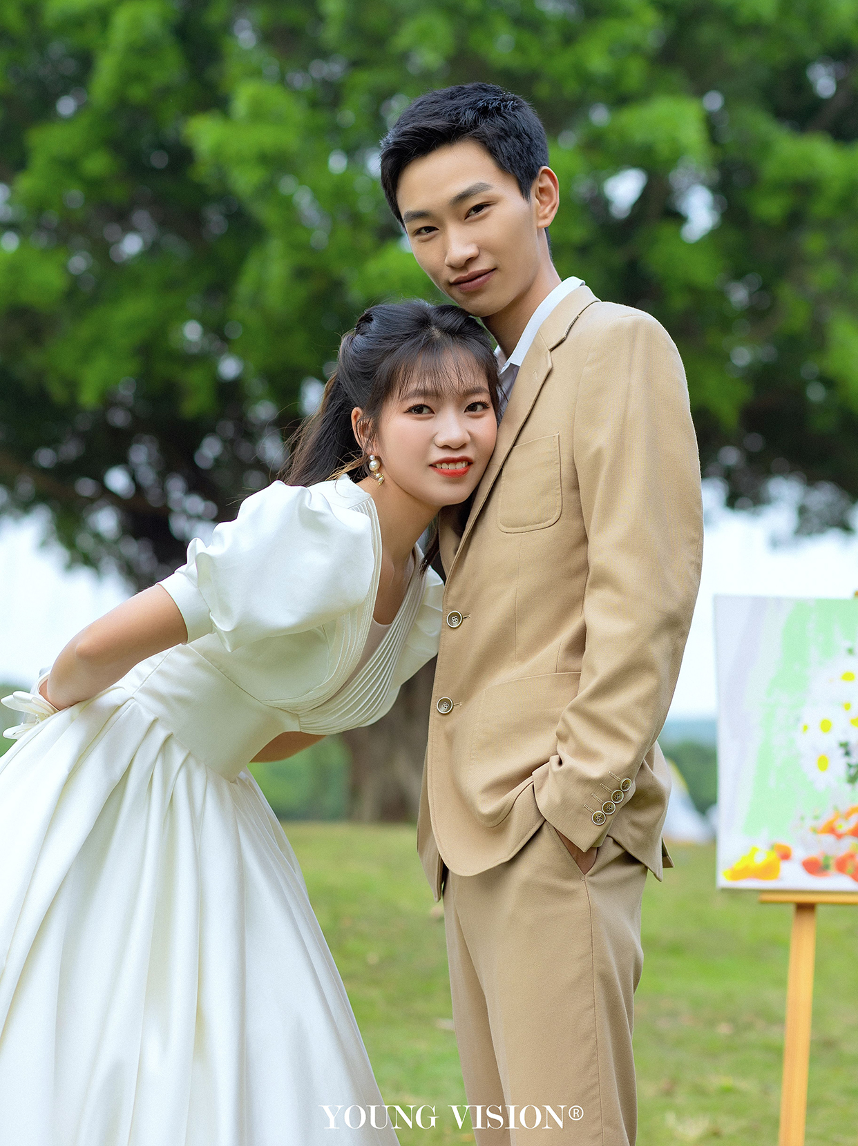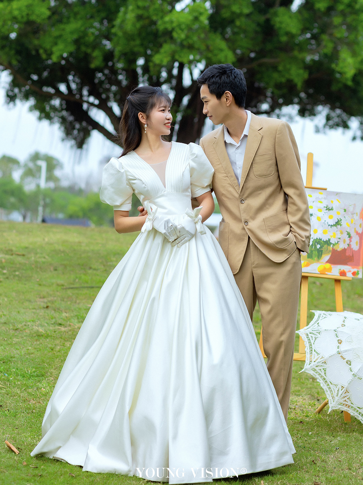 • 新娘一身缎面白裙 可爱又不失仙气 将灵动的少女感发挥得淋漓尽致 搭配新郎的衬衫 清爽又不失甜蜜 轻盈不失质感 主打轻松 俏皮的氛围感 捕捉情侣间的小动作 还原亲昵无间的美好 两个人简单的站在一起 无论对视还是拥抱 都洋溢着甜蜜的恋爱氛围感