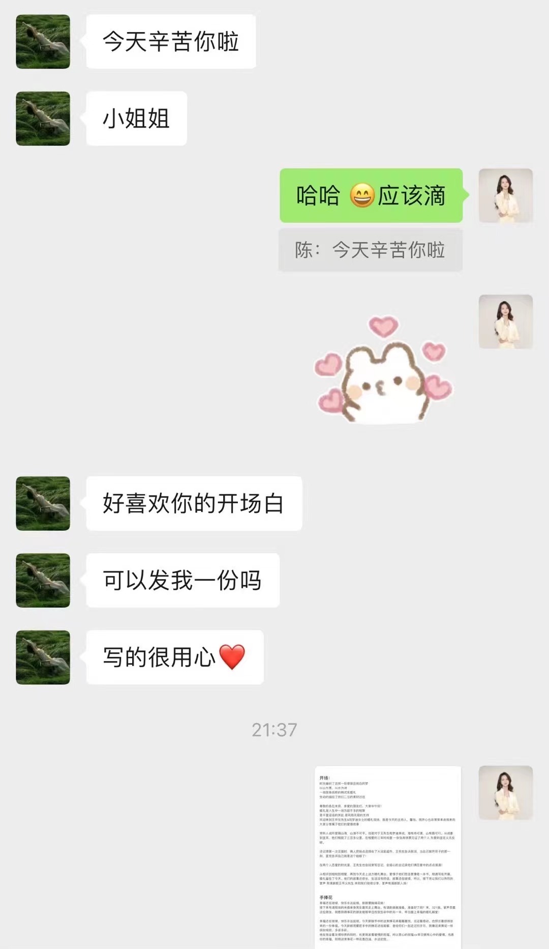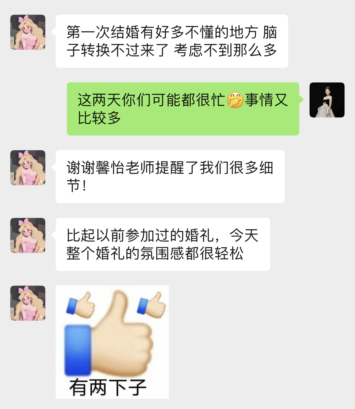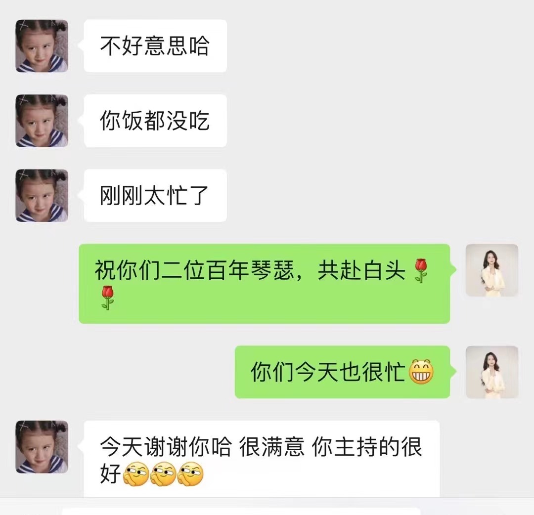 • 今天终于空下来啦!谢谢馨怡! 你的主持满足了我对婚礼的期待。 从我们第一次加微信,你就很热情的和我沟通婚礼流程。后来我也一直在忙,有些信息都回复得很慢,你也一直很耐心的引导我们讲一些我们的爱情故事,也让我回忆了这五年的美好。彩排的时候你也很细心,给我们讲了很多的细节,婚礼前一天,也很贴心的提醒我们一些要准备的东西。婚礼当天现场的氛围也特别的好,朋友们也很开心。 我觉得你就像我的朋友一样,很贴心很细心,咱们微信多多保持联系,以后有机会也能在朋友圈见证 你的幸福。