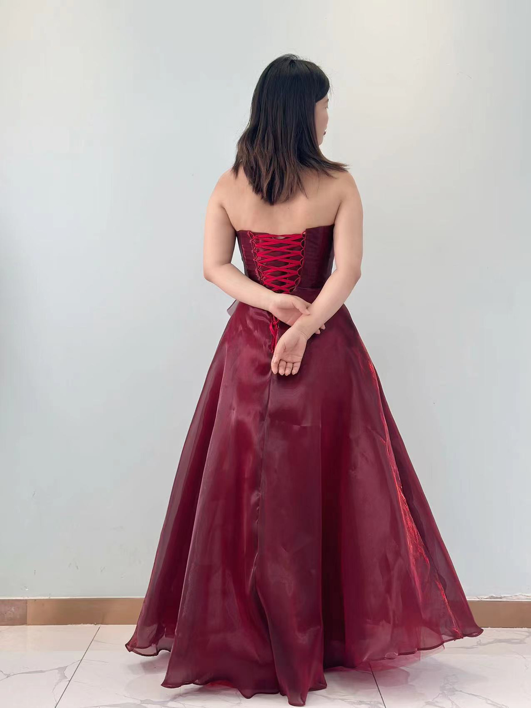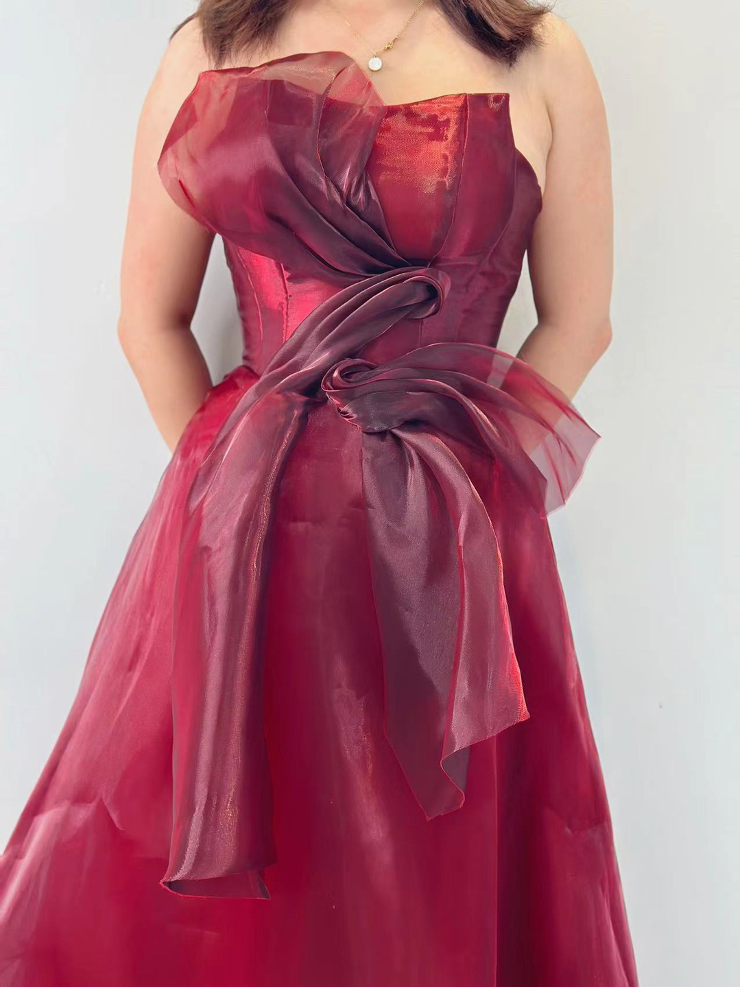 • 车厘子色高级质感抹胸轻盈新娘气质敬酒礼服