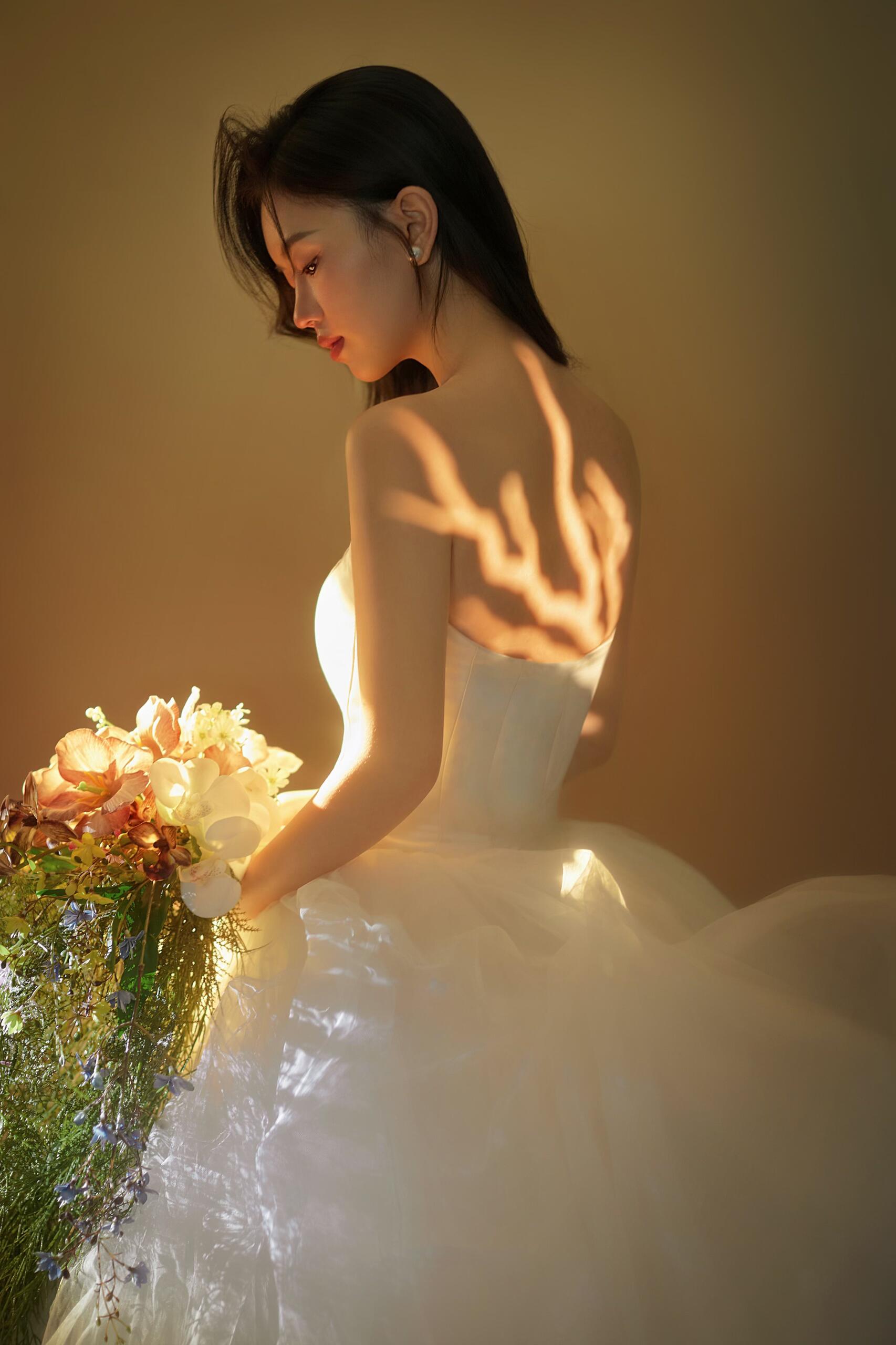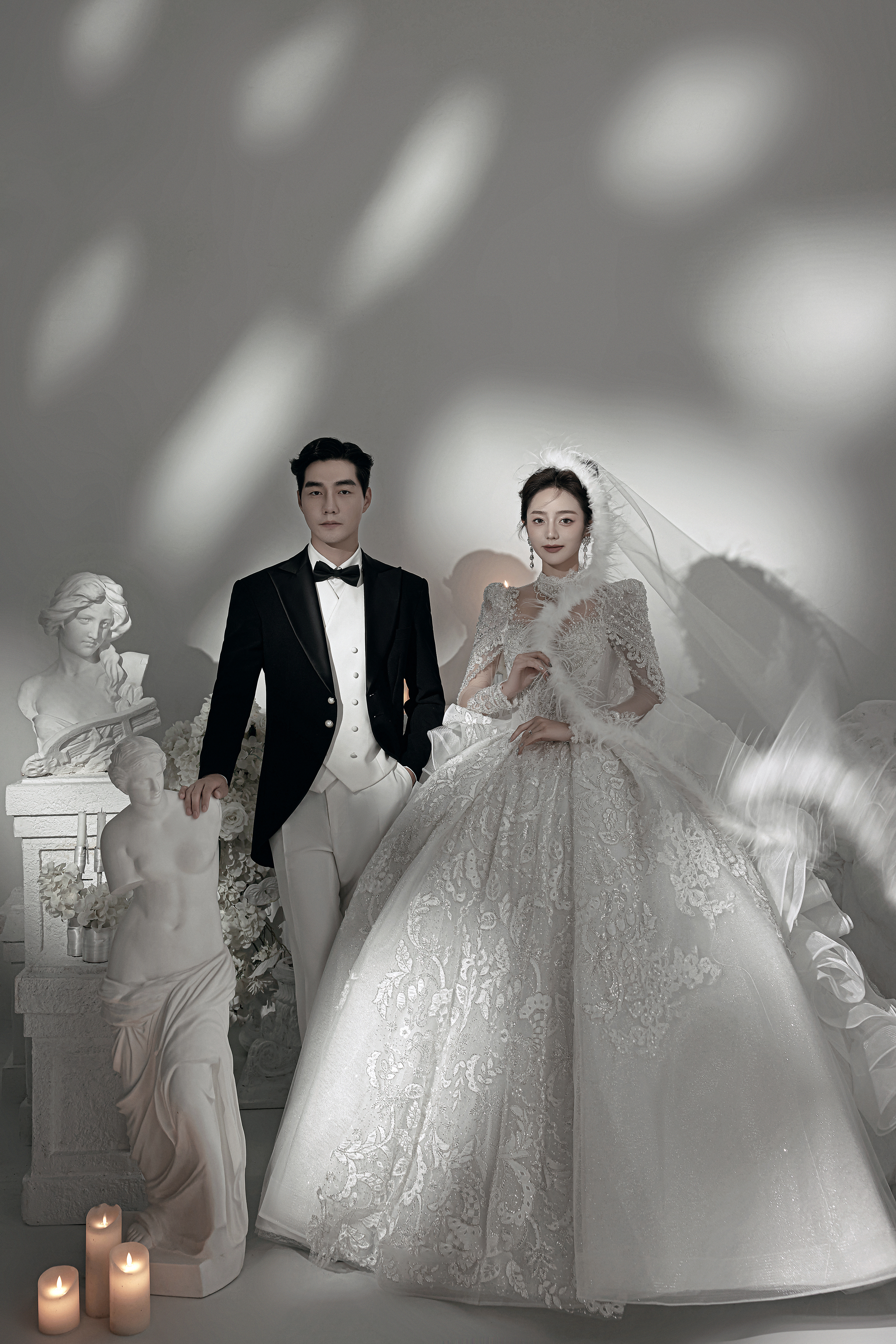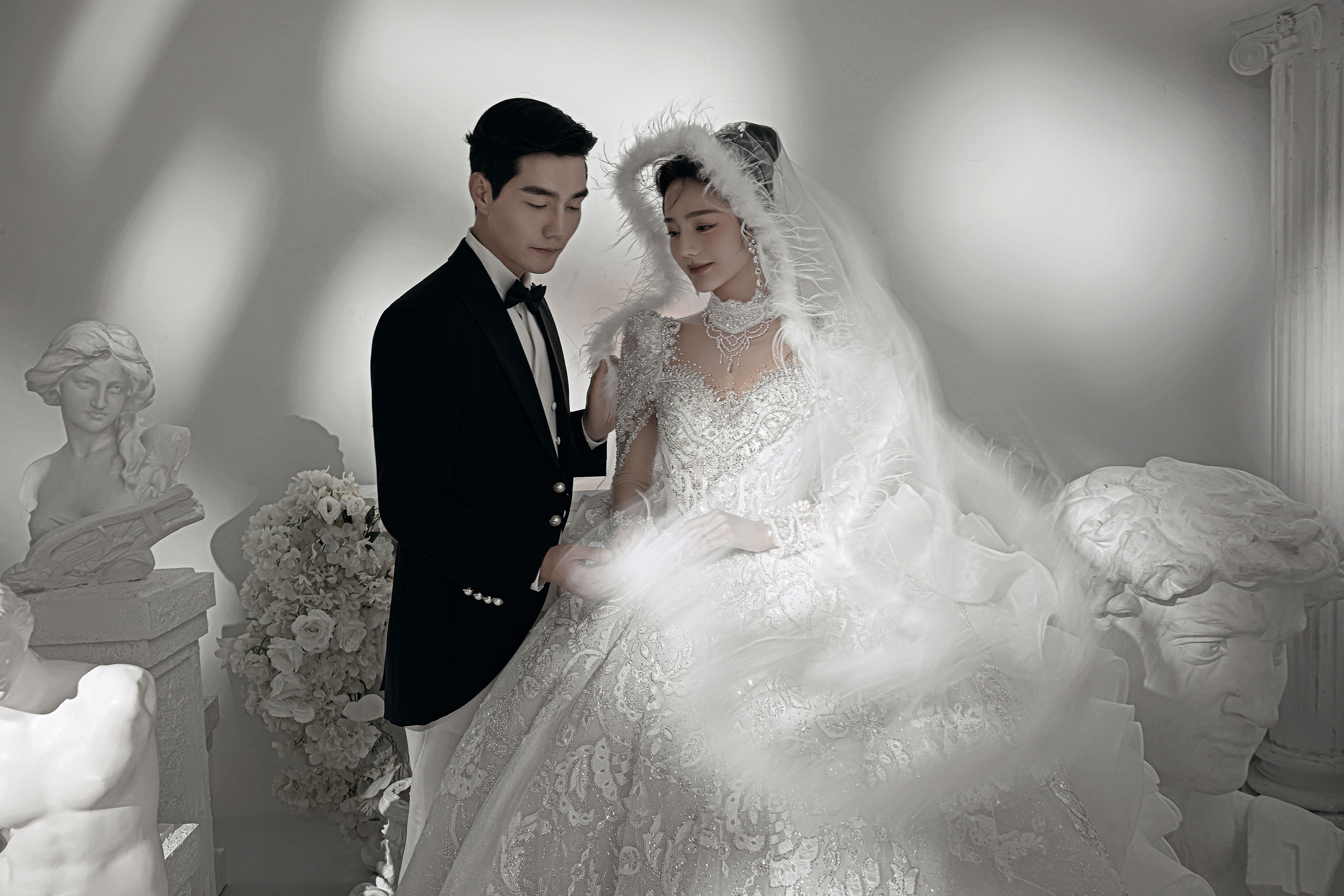 • 婚纱照✨||室内 | 光影 | 艺术 | 高定 ◤艺术之始,雕塑为先◢ 光影流动在轻盈飘散的羽毛之上 纯白缎面塔夫绸勾勒曼妙身姿 宛如艺术品般无言高级的画面🤍 是每个女孩子都无法抗拒的人间浪漫 #美到犯规的光影婚纱照