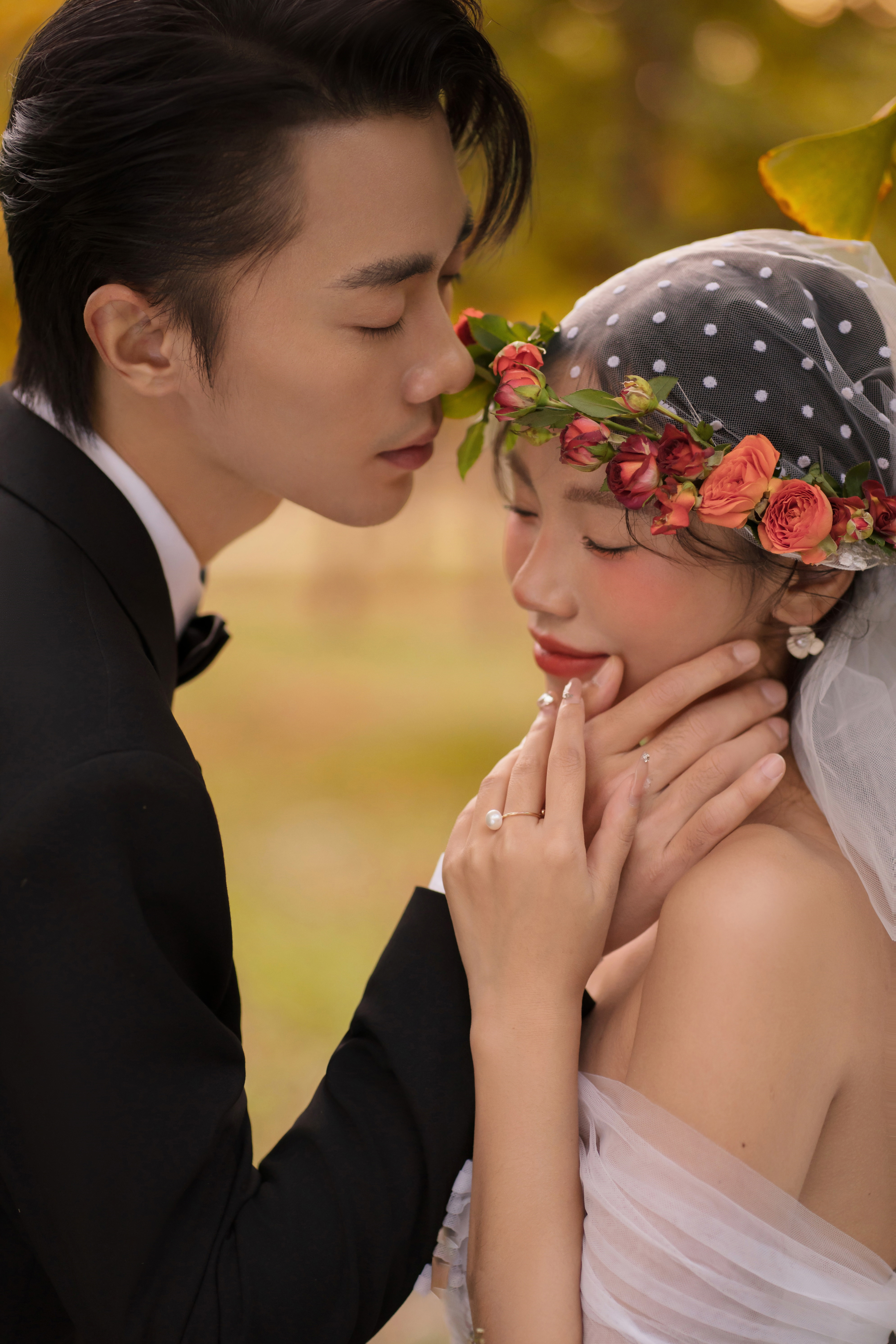 • 金黄的树叶与洁白的婚纱呼应 也太出片了吧🉑#超有氛围感的森系婚纱照