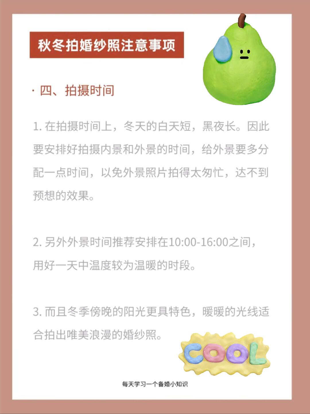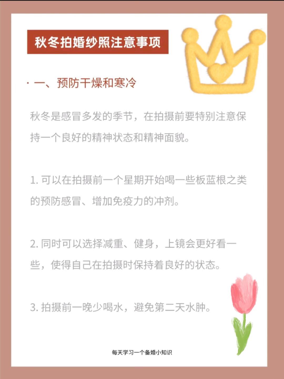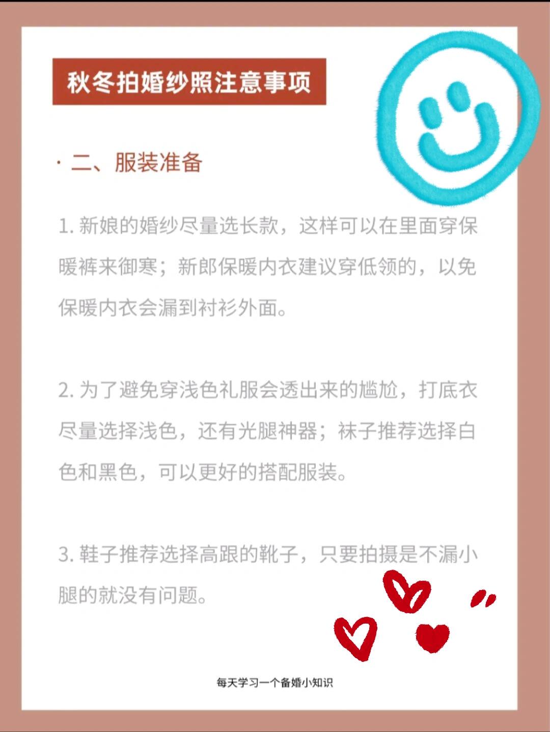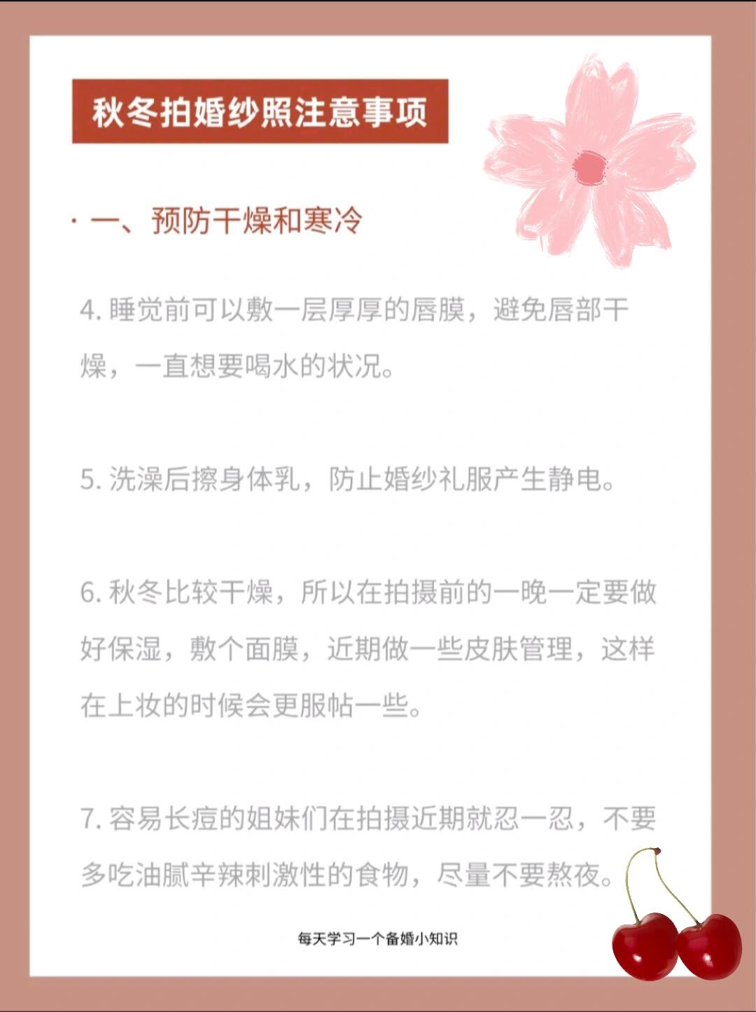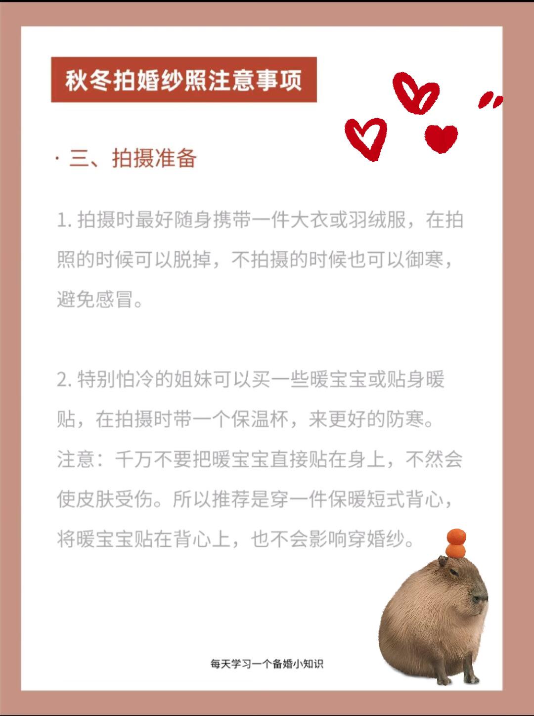 • 秋冬拍婚纱照冻成狗?这篇保命攻略赶紧码住 谁懂啊家人们!秋冬拍婚纱照真的又美又“冻人”🥶 上周陪闺蜜拍完外景,她裹着羽绒服边擤鼻涕边说:“早看到这篇我能少遭一半罪!” 整理了超全秋冬备婚拍照注意事项👇 准新娘们直接抄作业! • 身体&皮肤急救 提前1周喝预防感冒冲剂+少熬夜戒辛辣(别让痘痘抢镜!) 拍摄前一晚:敷唇膜+面膜+涂身体乳(防静电+卡粉)+少喝水(告别水肿脸) • 服装保命技巧 新娘选长款婚纱!里面偷偷穿保暖裤+光腿神器(浅色系不尴尬) 新郎穿低领保暖内衣,袜子选黑白万能搭,鞋子直接上高跟靴子(保暖又上镜) • 拍摄现场暖身术 随身揣大衣/羽绒服,不拍就裹紧!怕冷带暖宝宝(贴在保暖背心外,别直接贴皮肤!)+保温杯装热姜茶 • 时间选得好,少挨半小时冻 外景优先安排10:00-16:00(一天里最暖和),傍晚光线柔,拍氛围感绝绝子! ⚠️ 划重点:别为了美硬扛!冻感冒真的会影响状态