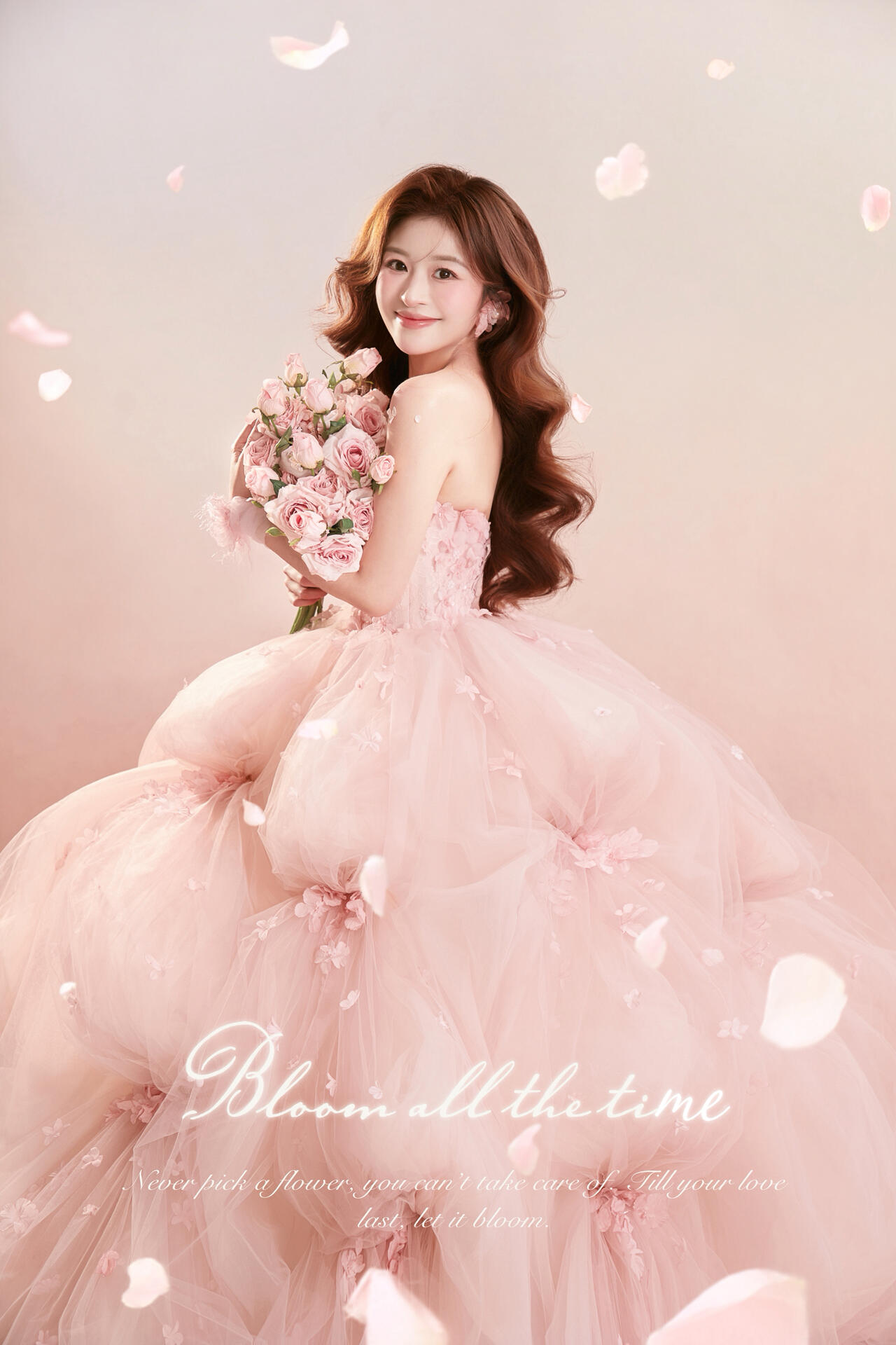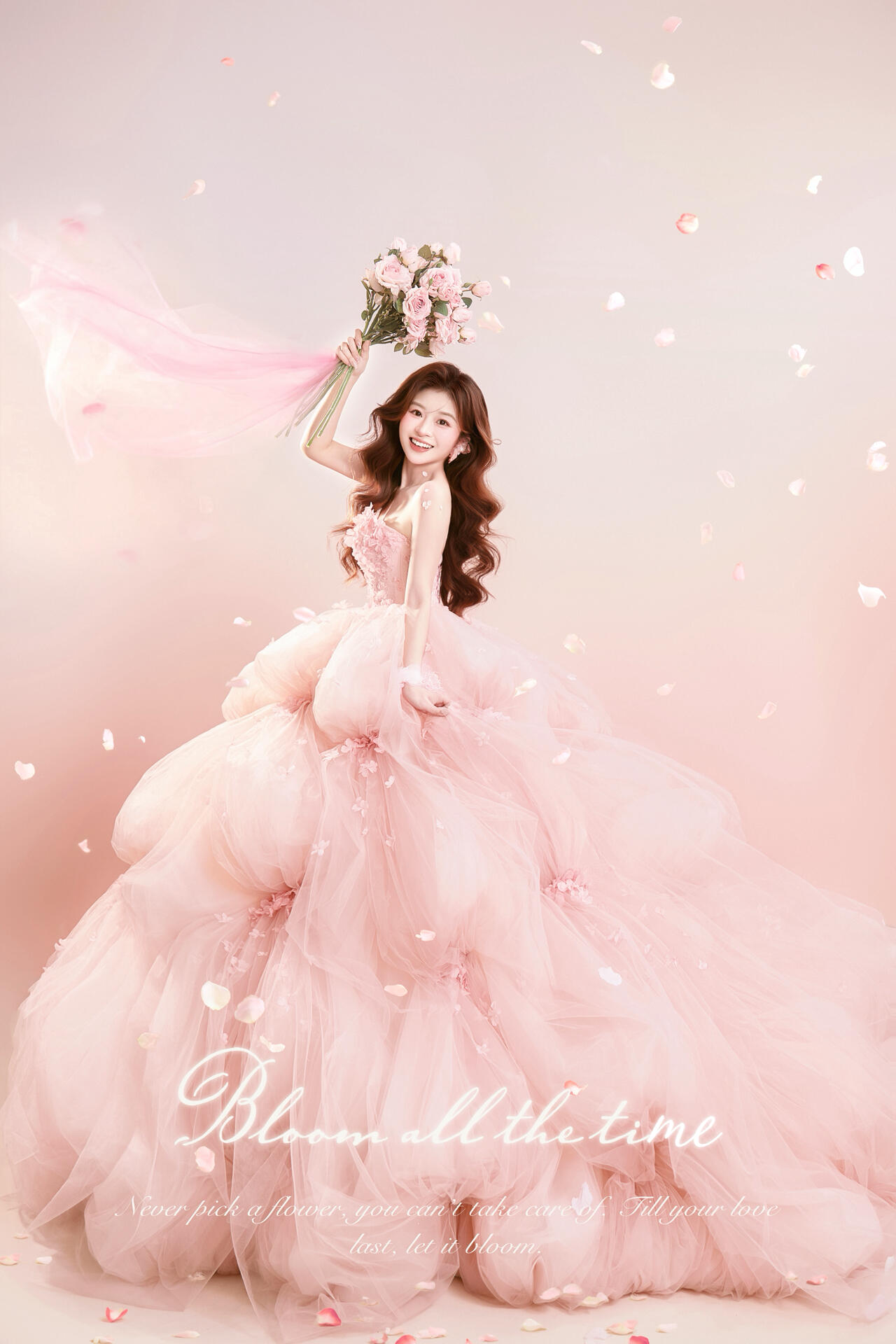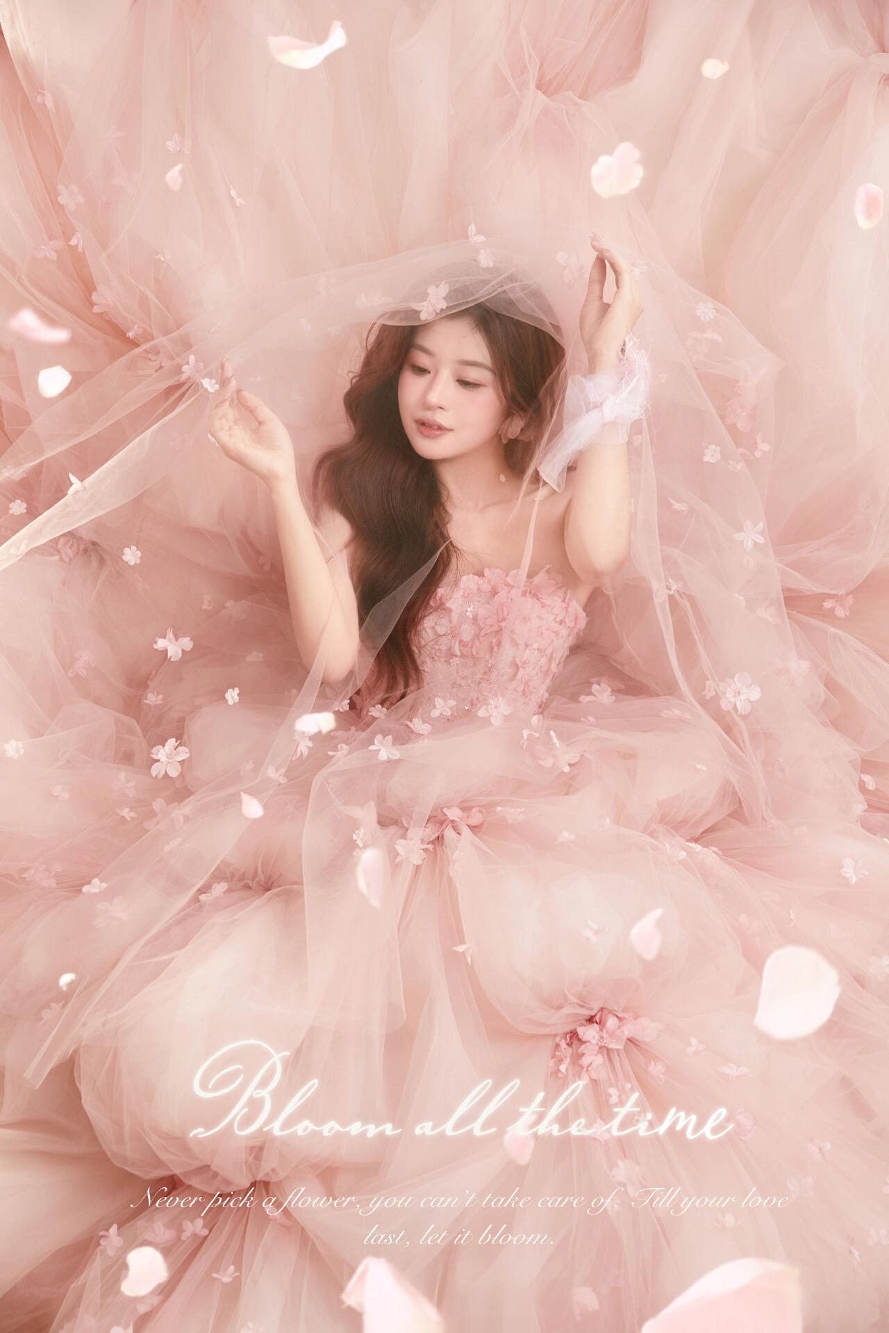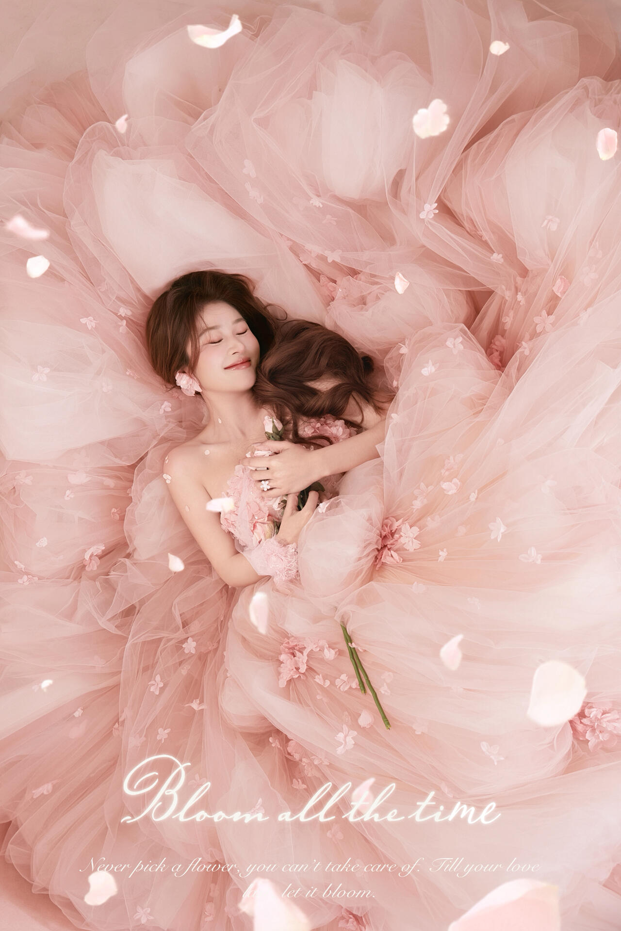 • 层层叠叠的粉色花神主纱👰🏻‍♀️ 裙摆如花瓣般大肆盛开🌸 搭配韩式高马尾鲜花妆容💕 唯美少女感太戳心巴了~ · 错落有致的水波纹光影✨ 配合爱意流转在每一刻镜头📷 隔着屏幕都能感受到浪漫氛围💖#韩式花房婚纱照