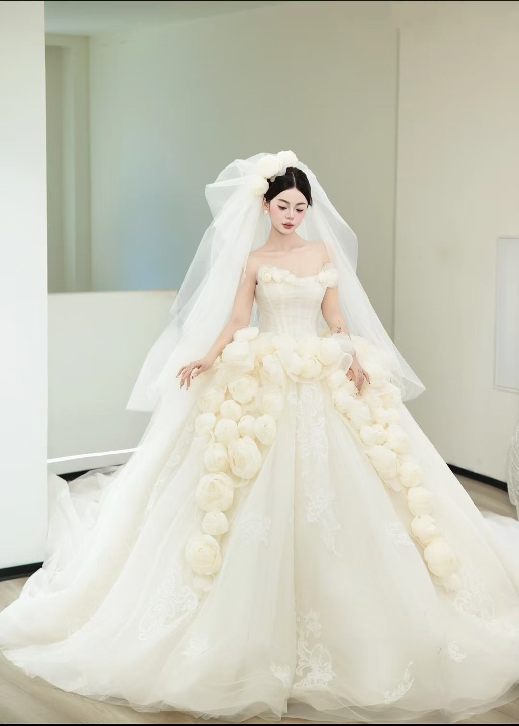 • 疯狂美出圈的花朵婚纱‼️真的很难不心动 灵动甜蜜的花朵盛开在裙摆上 搭配头纱仙气满满✨ 氛围感与仪式感并存的浪漫 呈现所有新娘梦中的婚纱 #一眼心动的公主嫁衣