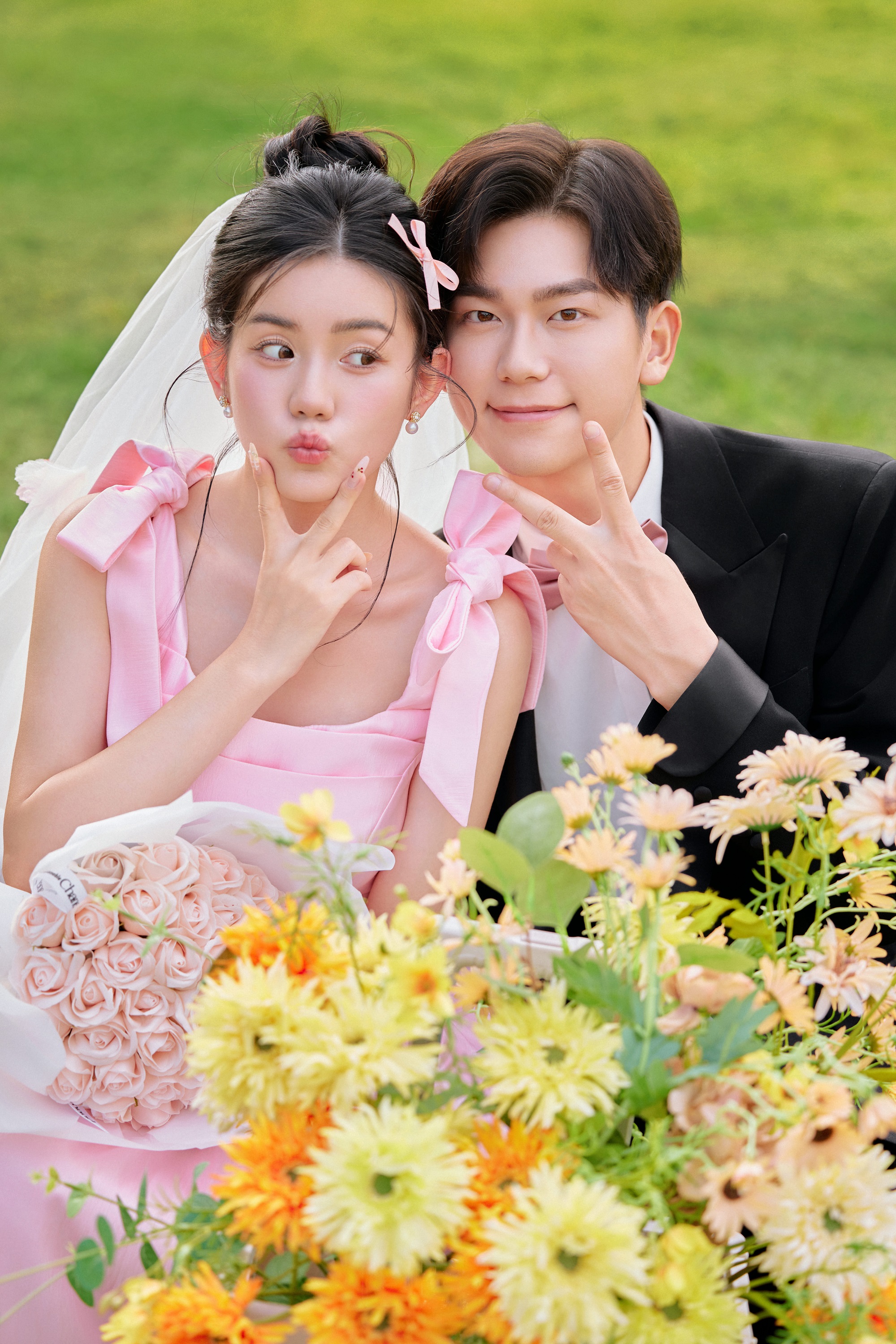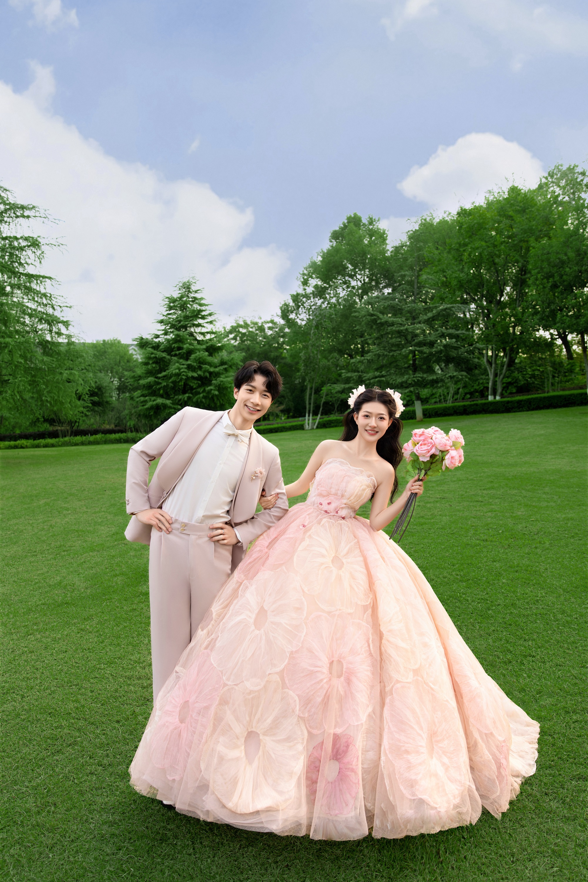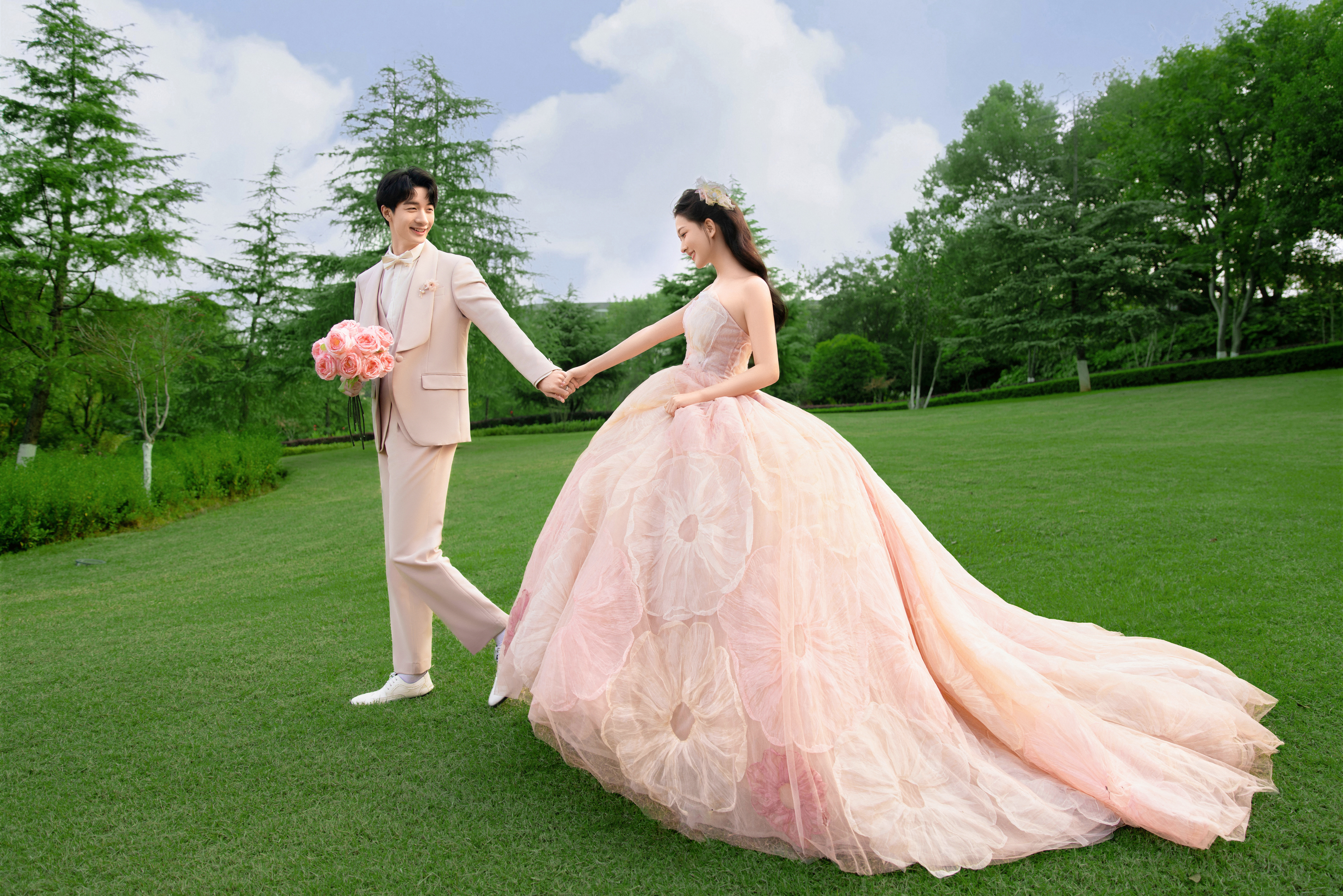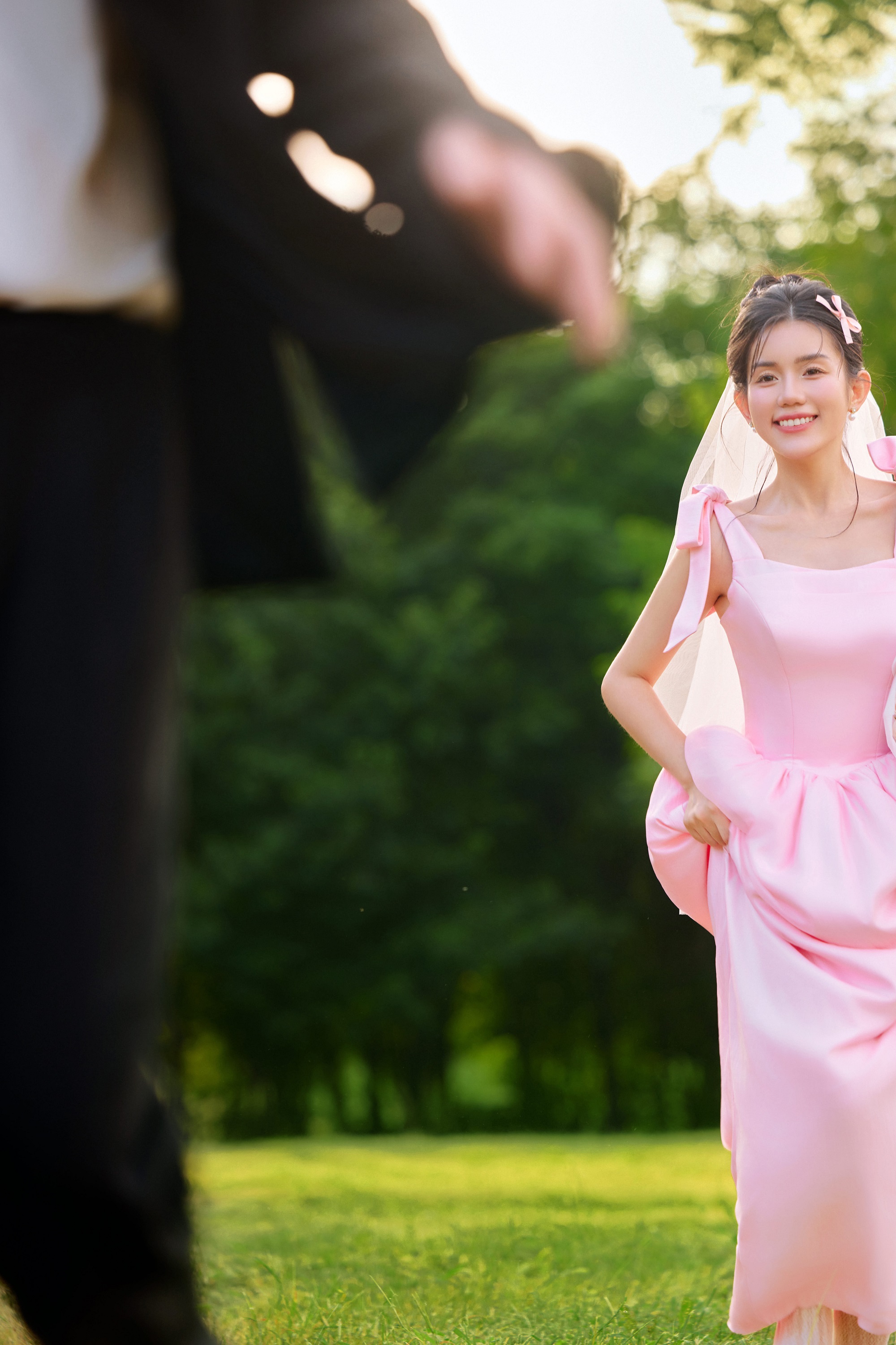 • 粉白纱裙蹭过青草香,他追着风,她笑着躲——草坪上的粉色浪漫,是藏不住的俏皮心动呀~#婚纱照#韩式花房婚纱照