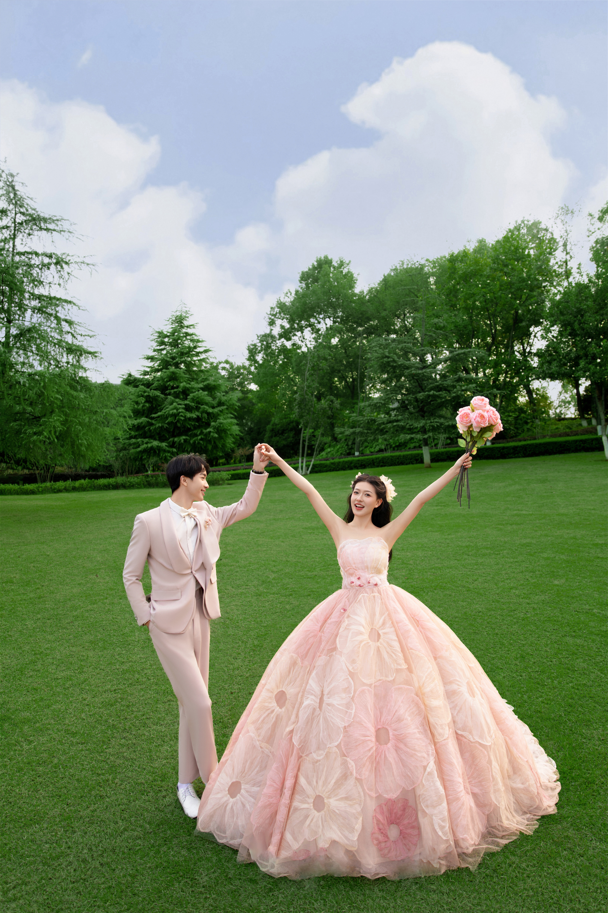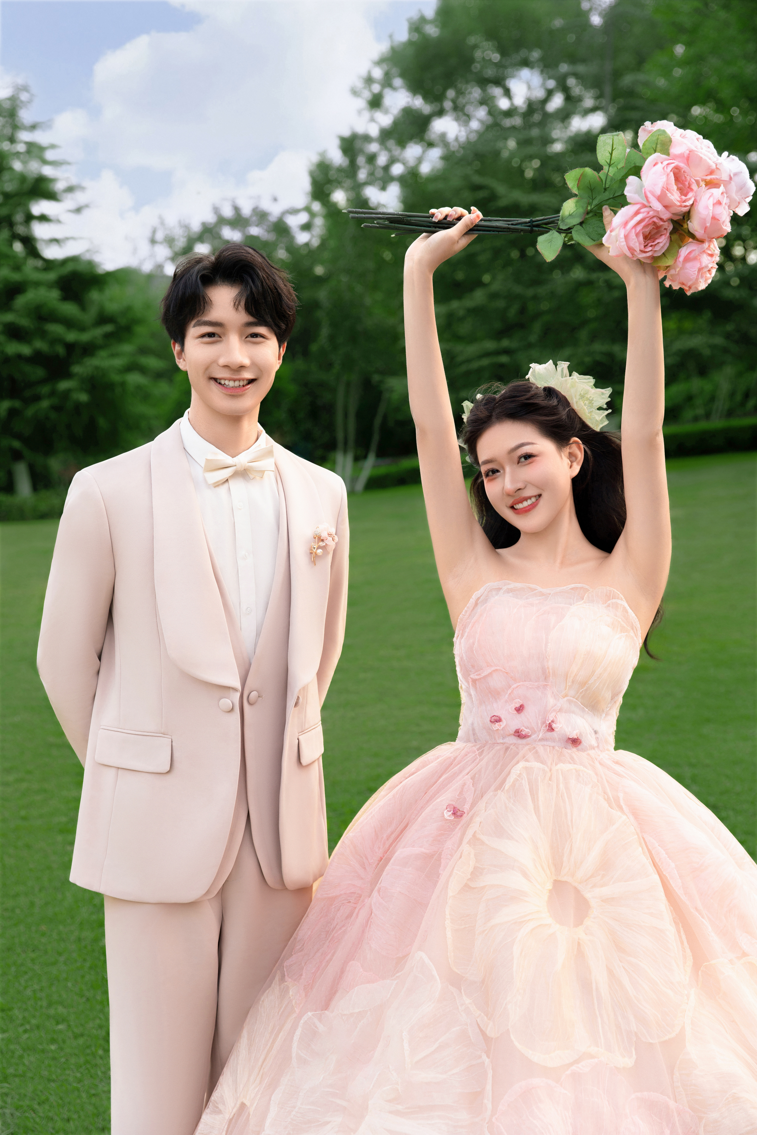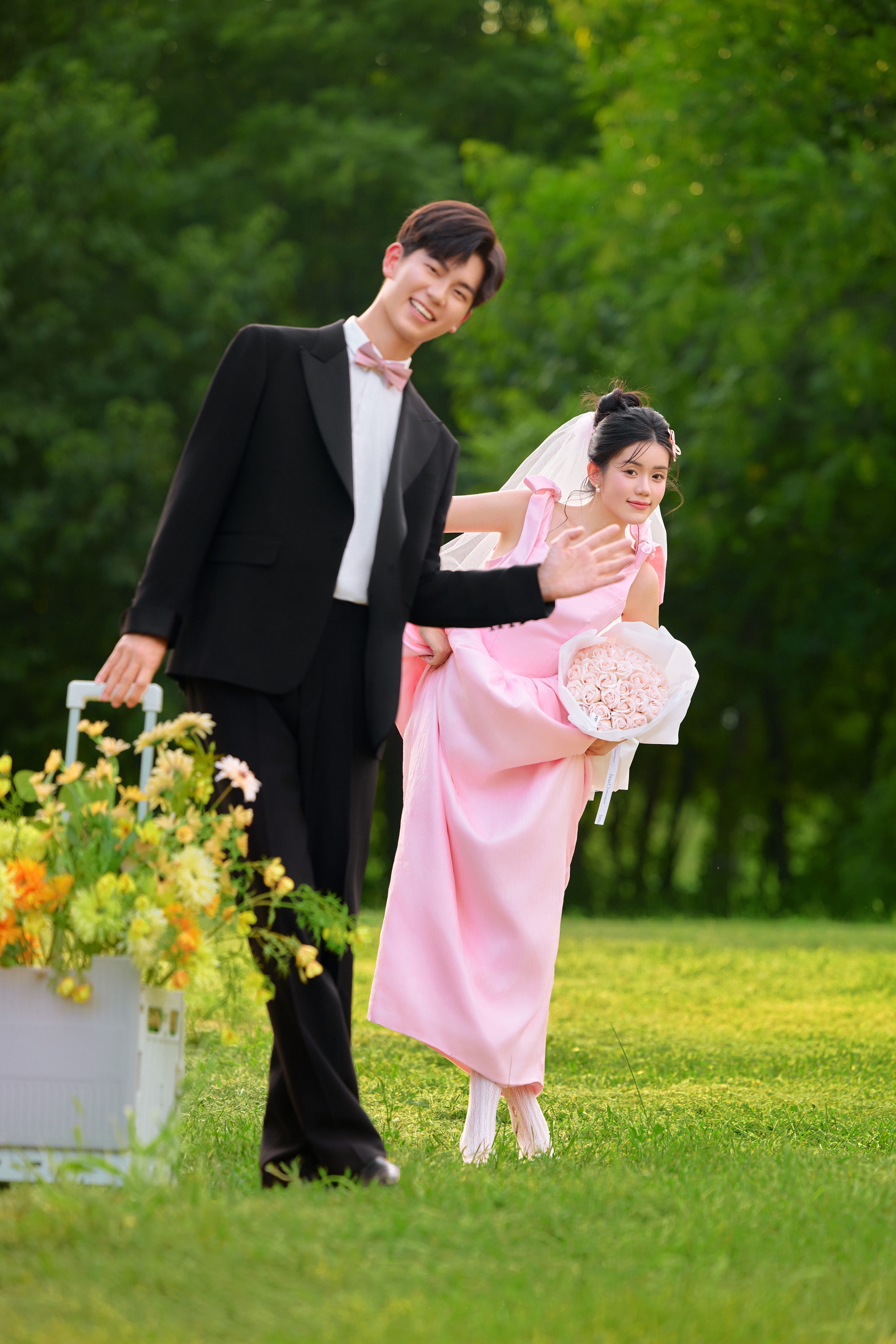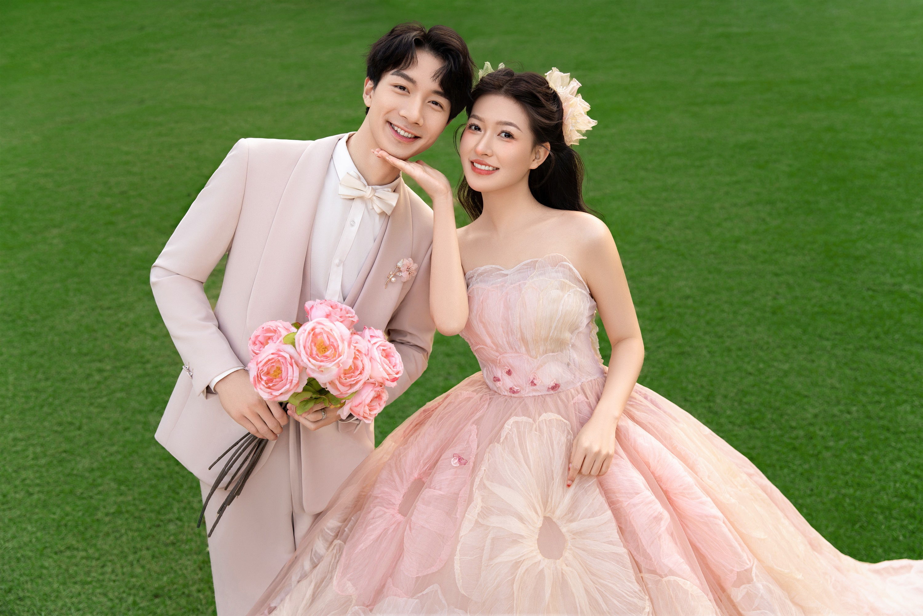• 粉白纱裙蹭过青草香,他追着风,她笑着躲——草坪上的粉色浪漫,是藏不住的俏皮心动呀~#婚纱照#韩式花房婚纱照