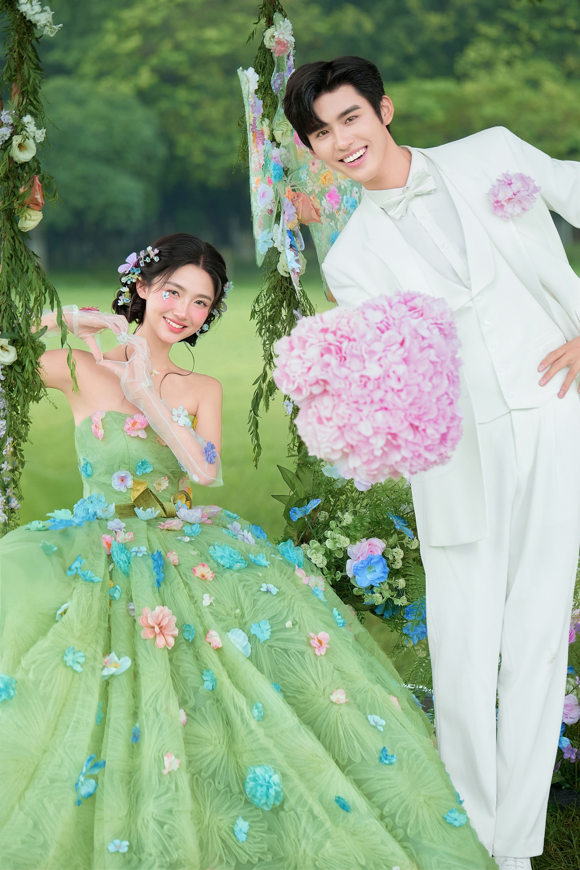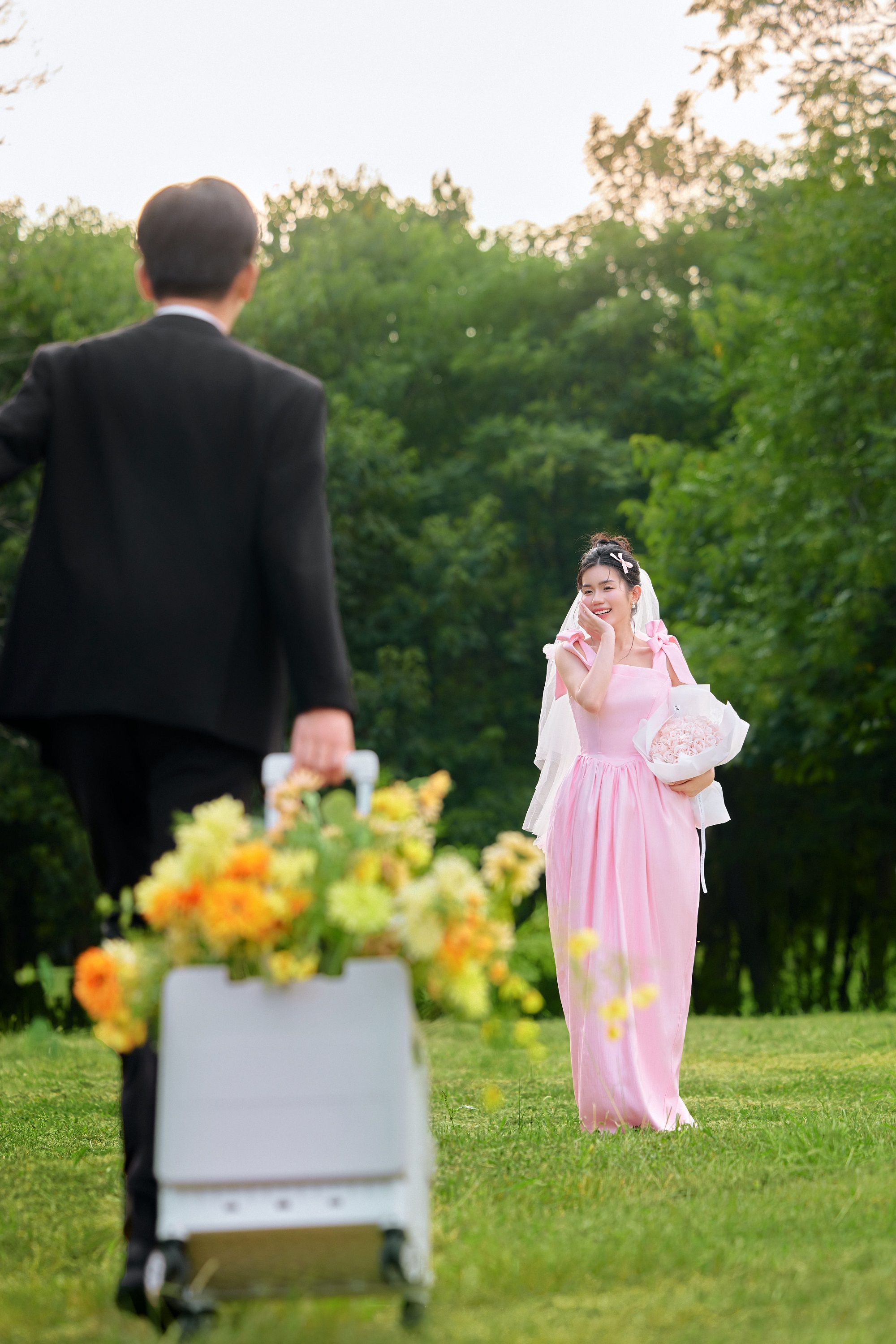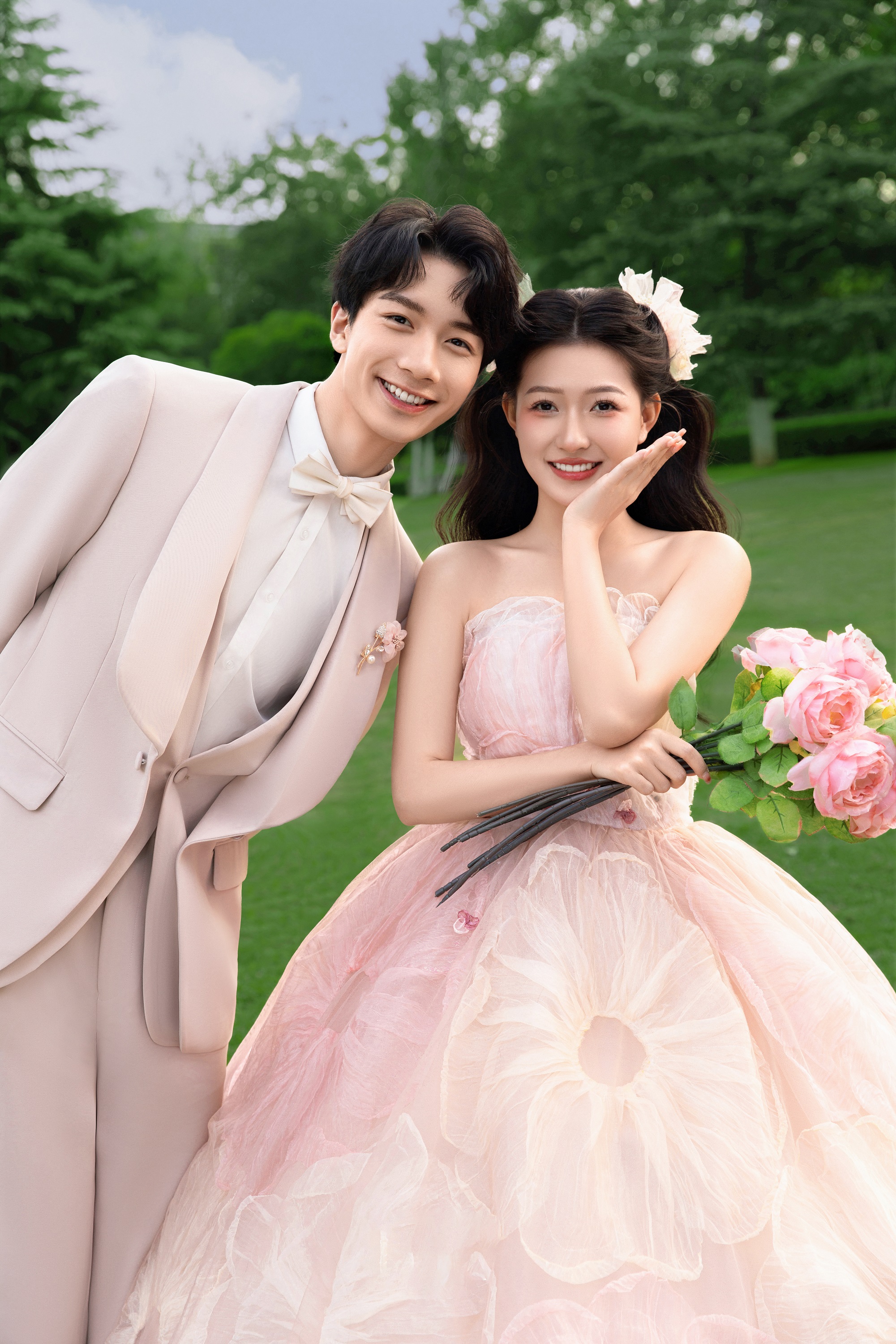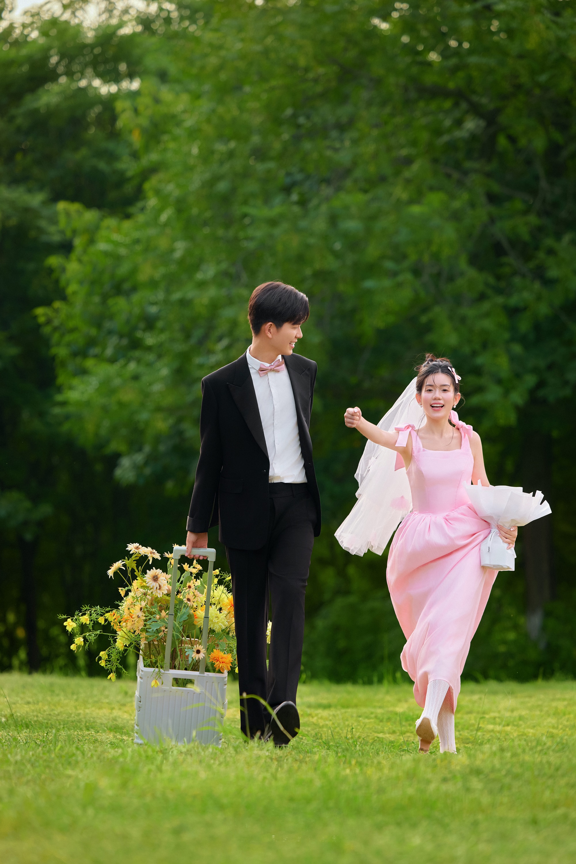 • 粉白纱裙蹭过青草香,他追着风,她笑着躲——草坪上的粉色浪漫,是藏不住的俏皮心动呀~#婚纱照#韩式花房婚纱照