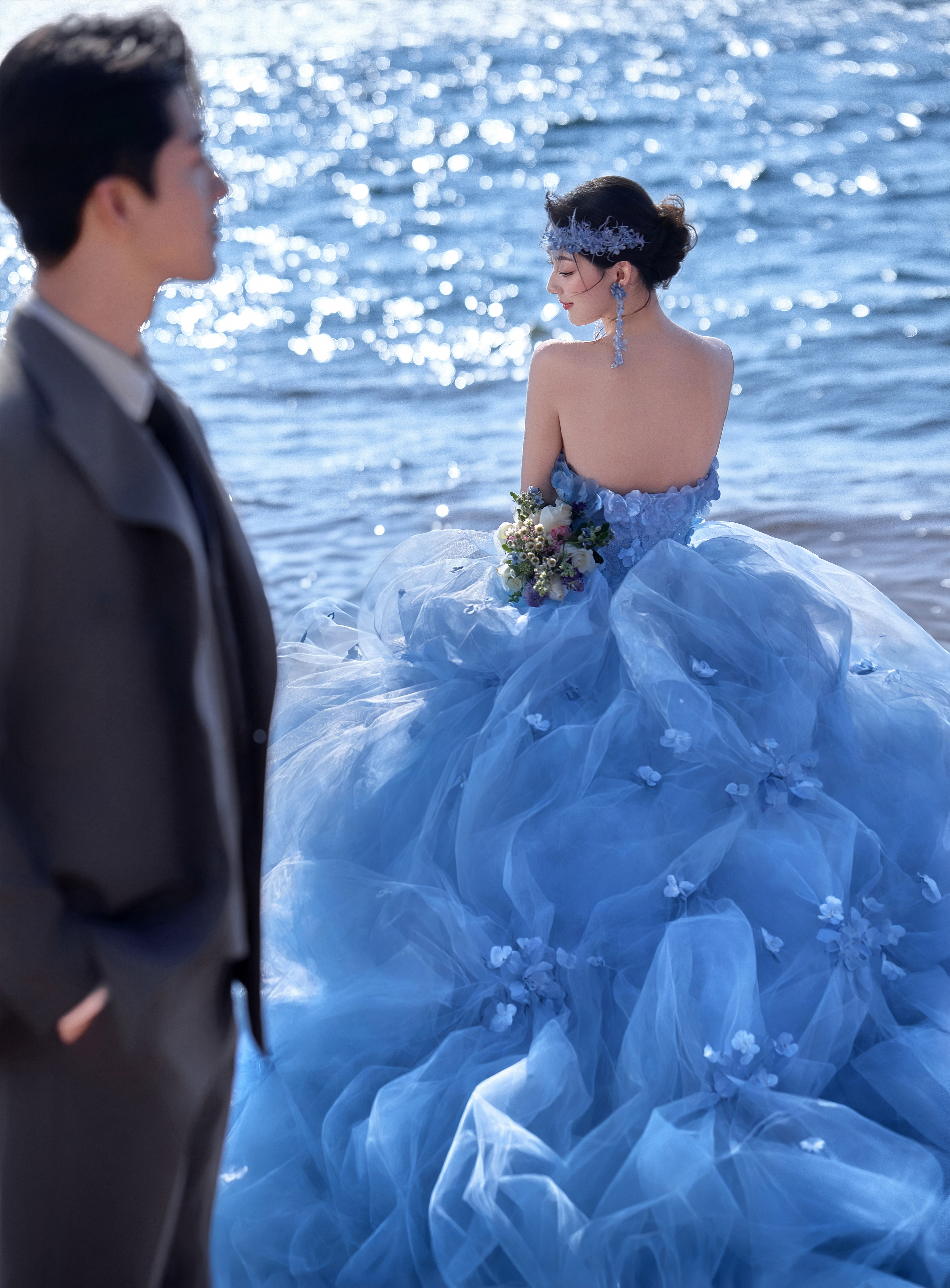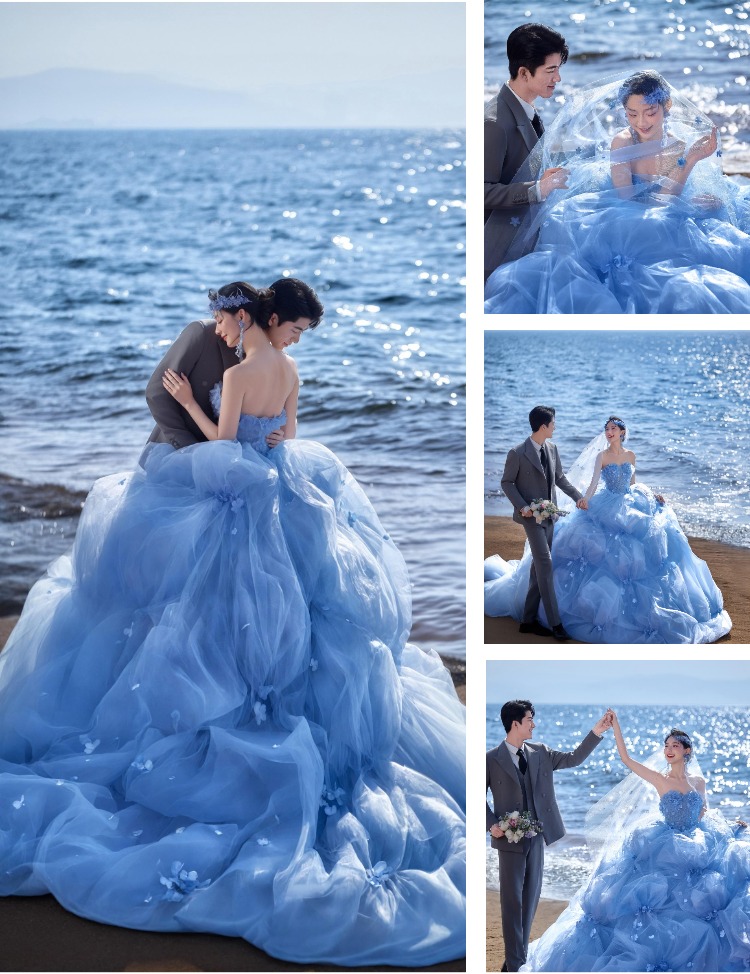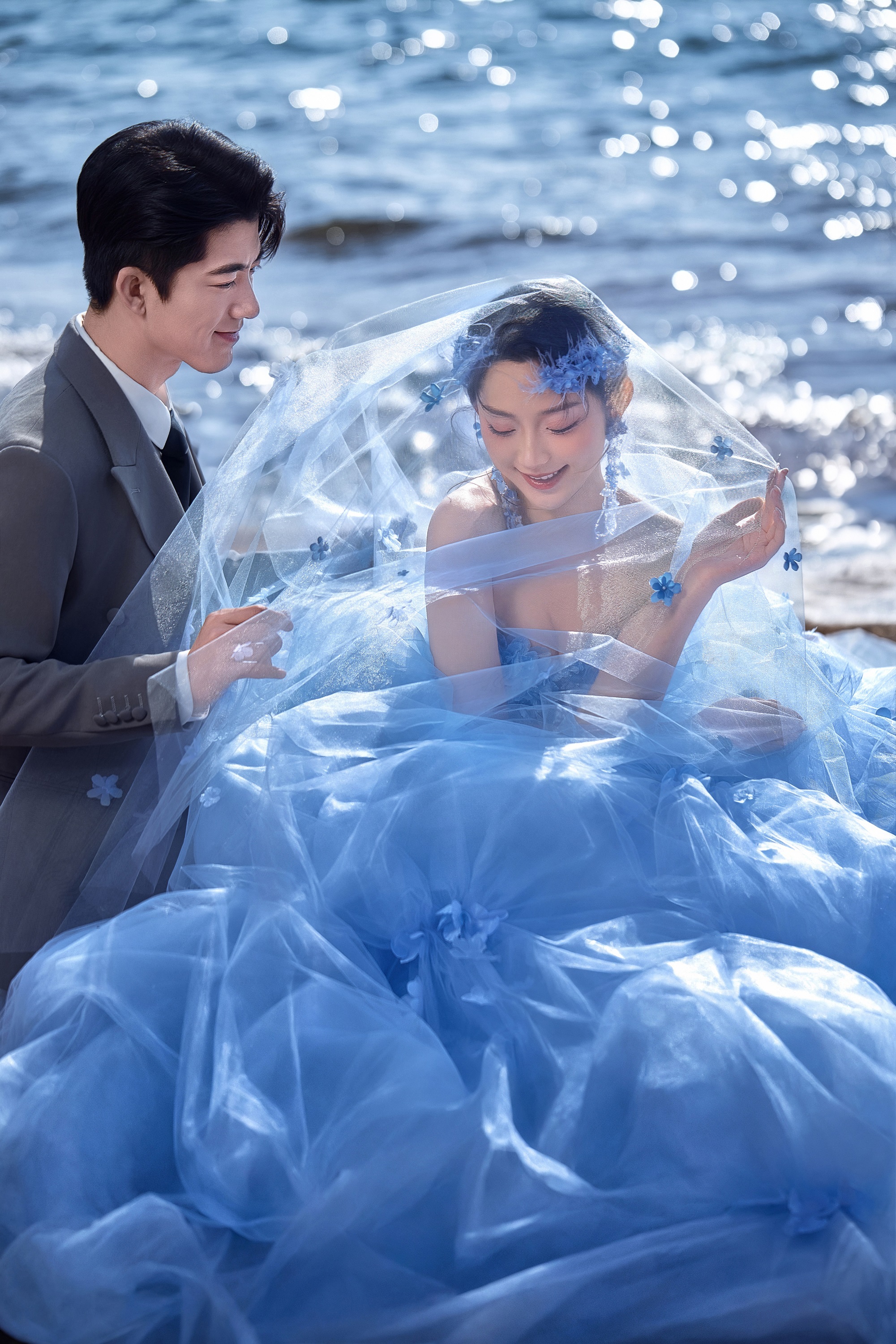 • 冰蓝色婚纱曳过浪花,裙摆漾着与海面同频的光泽,像从深海走出的月光少女。海风掀起头纱,咸湿的空气裹着爱意,脚下是细软沙滩,眼前是无垠蓝海,每一帧都像电影镜头般治愈,定格“与你共赴星辰大海”的温柔约定。 #浪漫光影婚纱照