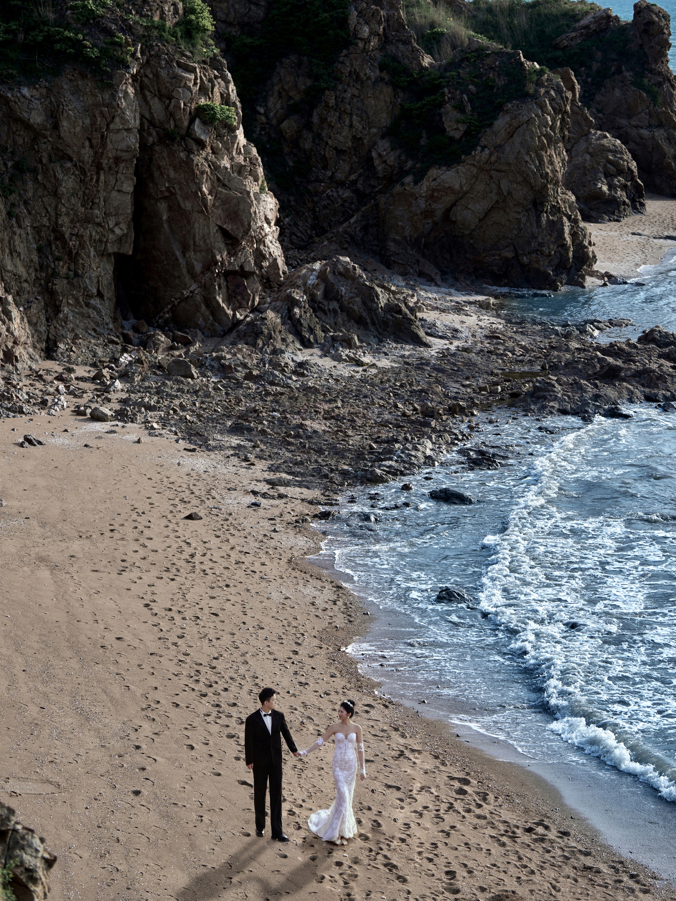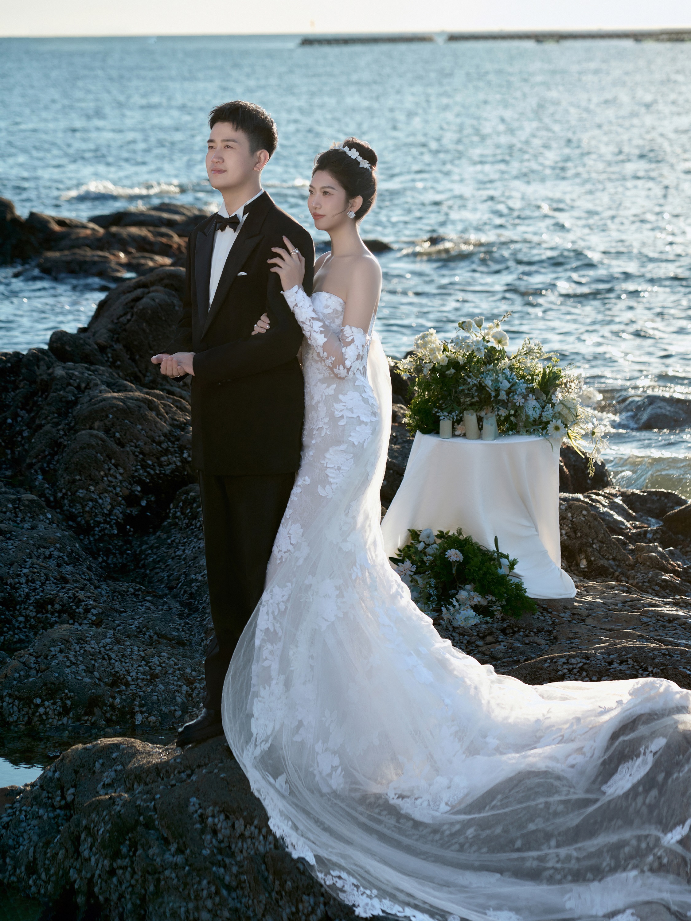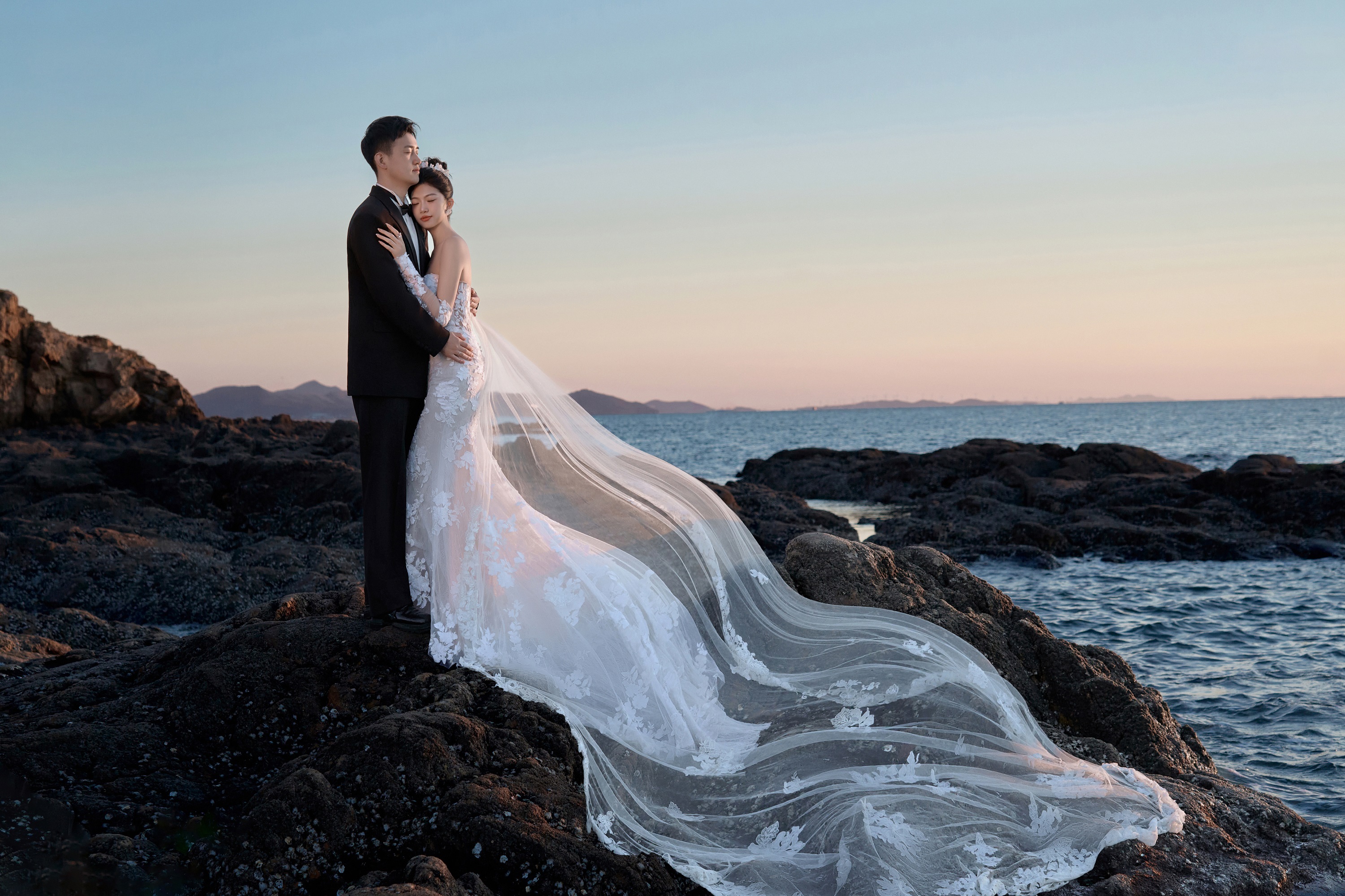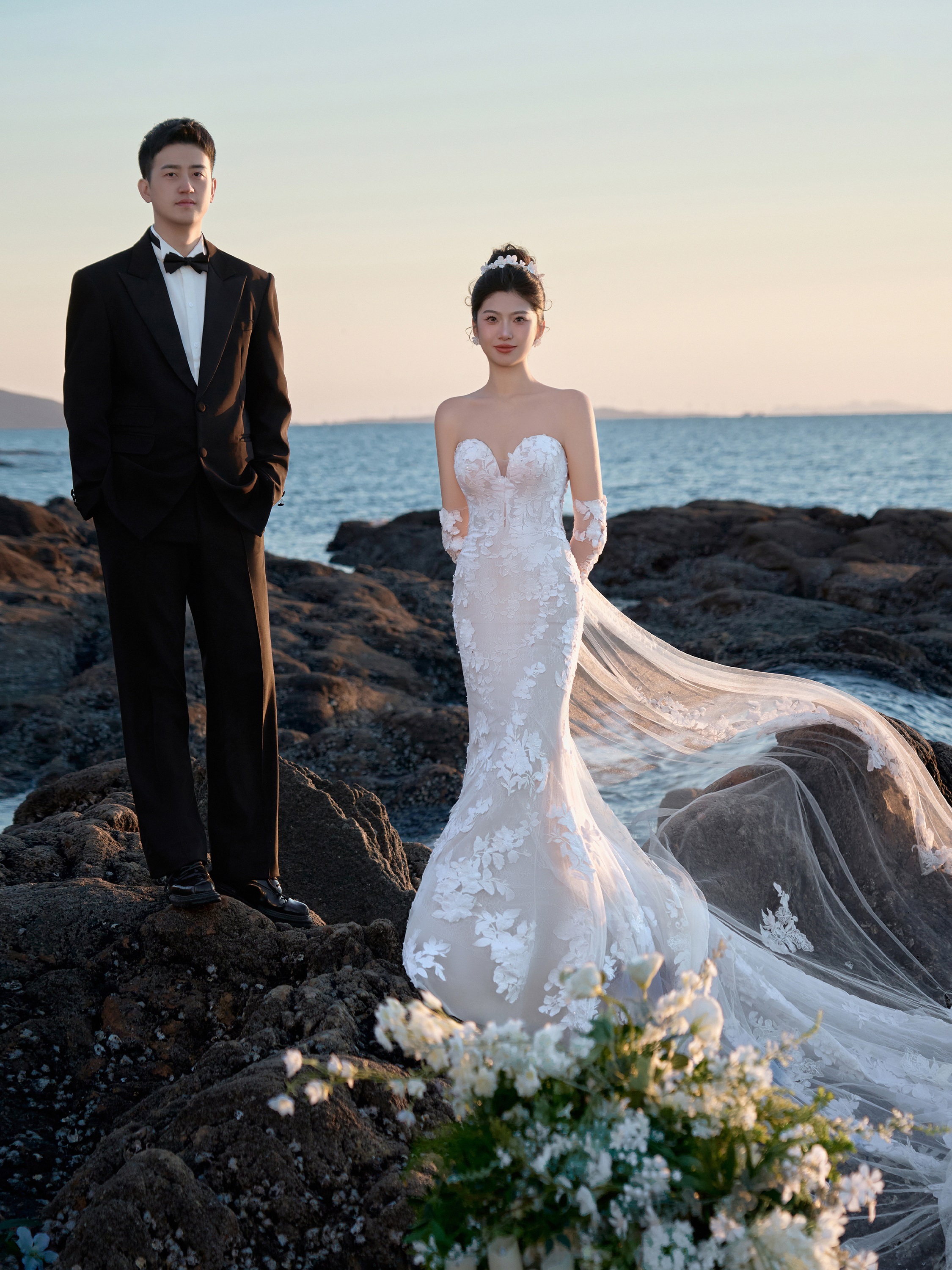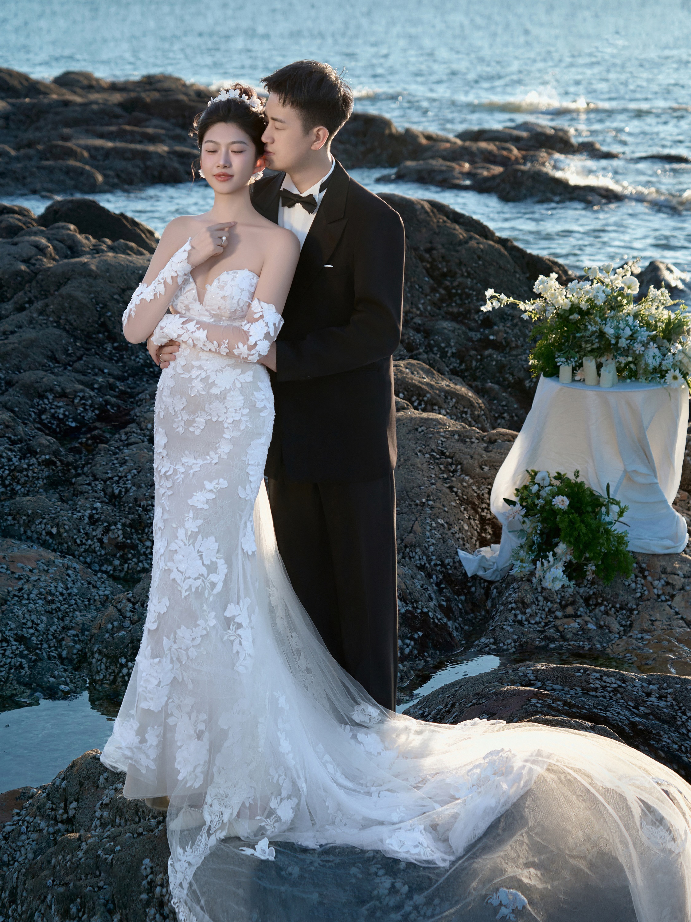 • 在千篇一律的白纱婚纱照中,选择黑色礼服拍摄海边主题,无疑是一次大胆又惊艳的尝试。成片交付的瞬间,所有顾虑都化为满心欢喜,这组婚纱照不仅定格了爱情的模样,更诠释了属于我们的独特审美与态度。 黑色礼服的质感远超预期,丝绒材质在海风下泛着细腻光泽,鱼尾裙摆随浪涛轻摆,既勾勒出优雅曲线,又自带神秘高级感。与传统白纱的纯洁不同,黑色礼服更显沉稳大气,搭配简约珍珠配饰,在蔚蓝大海与金色沙滩的映衬下,形成强烈又和谐的色彩碰撞,每一张照片都像电影帧般富有故事感。 摄影师的专业度让人安心,精准捕捉了海边光影的变化,无论是日出时分的柔和晨光,还是日落时分的橘色余晖,都将黑色礼服的质感与海景的壮阔完美融合。镜头下,我们或牵手漫步沙滩,或相拥凝视远方,或在浪花中嬉戏,自然流露的情绪被尽数定格,没有刻意摆拍的僵硬,只有松弛惬意的互动,每一张都充满生命力。 最惊喜的是黑色礼服赋予的独特氛围,它跳出了传统婚纱照的甜蜜套路,增添了几分酷飒与文艺气息。海边的风、翻滚的浪、黑色的裙摆与相爱的人,共同构成了一幅浪漫又个性的画卷,既适合挂在新房客厅彰显格调,也适合制作成相册珍藏回忆。
