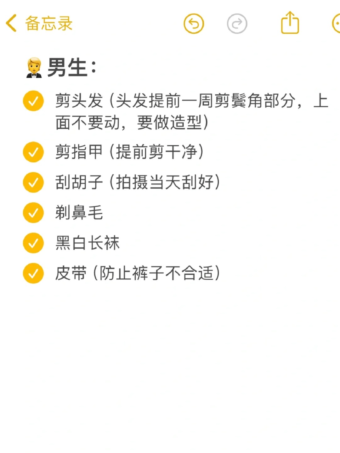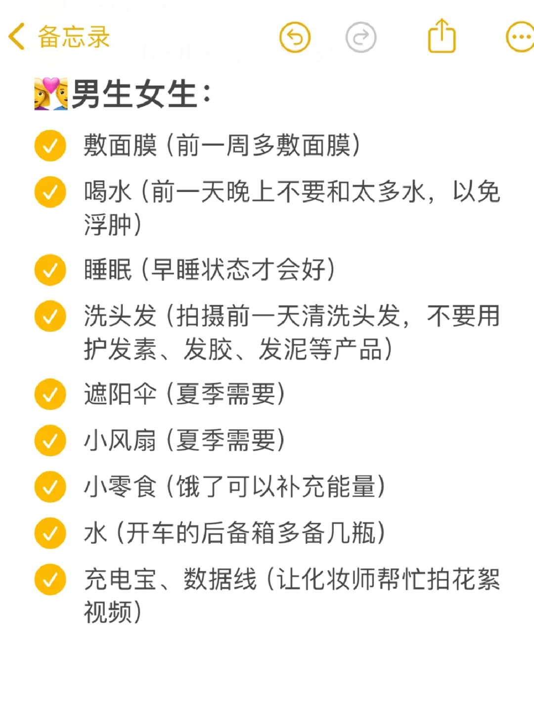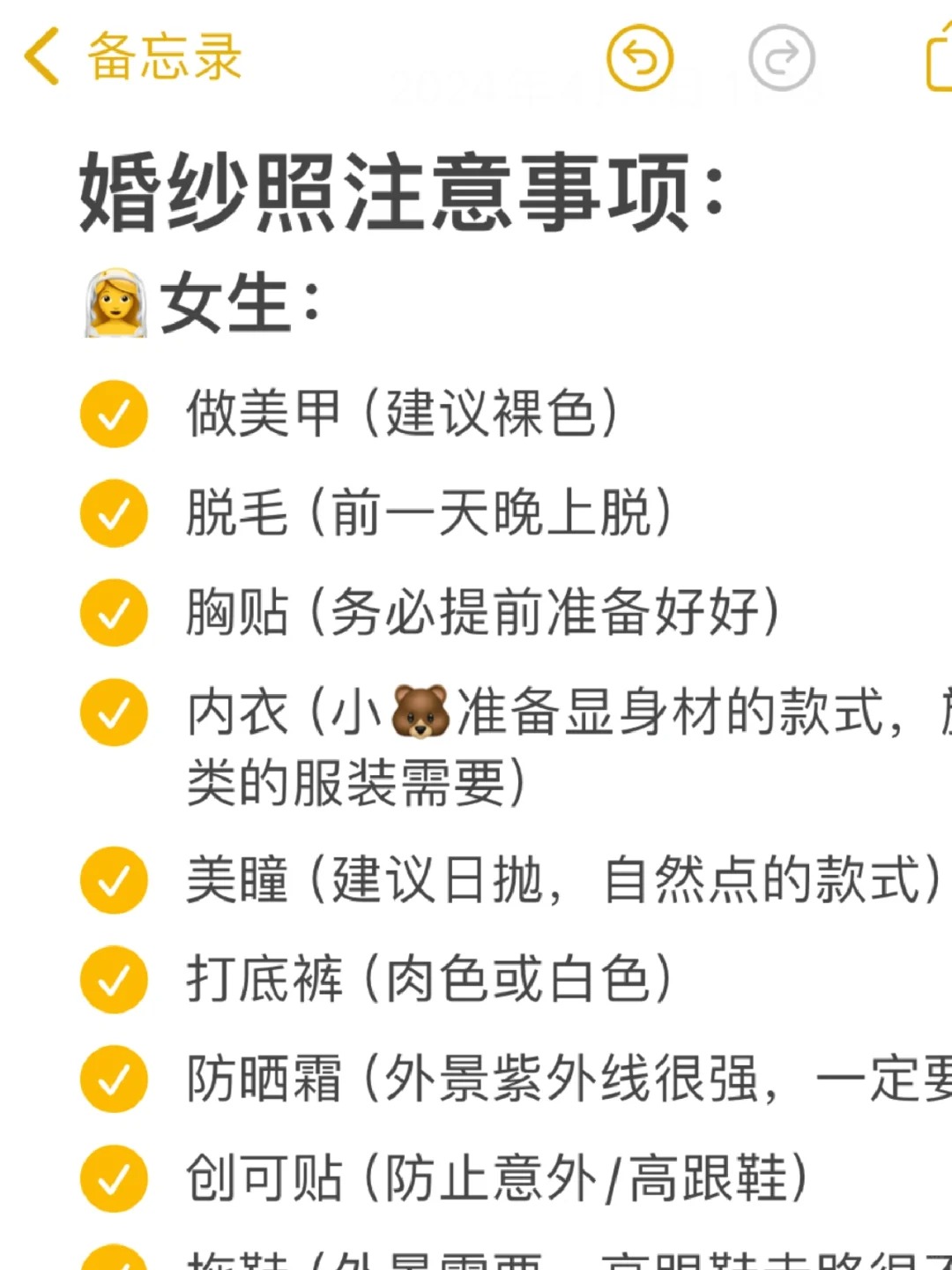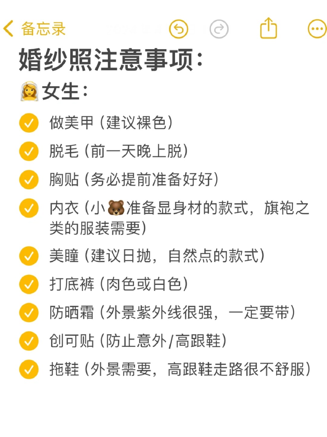 • 👰‍♀️女生: 做美甲(建议裸色) 脱毛(前一天晚上脱) 胸贴(务必提前准备好好) 内衣(小🐻姐妹可以准备显身材的款式,旗袍之类的服装需要) 美瞳(建议日抛,自然点的款式) 打底裤(肉色或白色) 防晒霜(外景紫外线很强,一定要带) 创可贴(防止意外/高跟鞋) 拖鞋(外景需要,高跟鞋走路很不舒服)#婚纱照拍摄注意事项