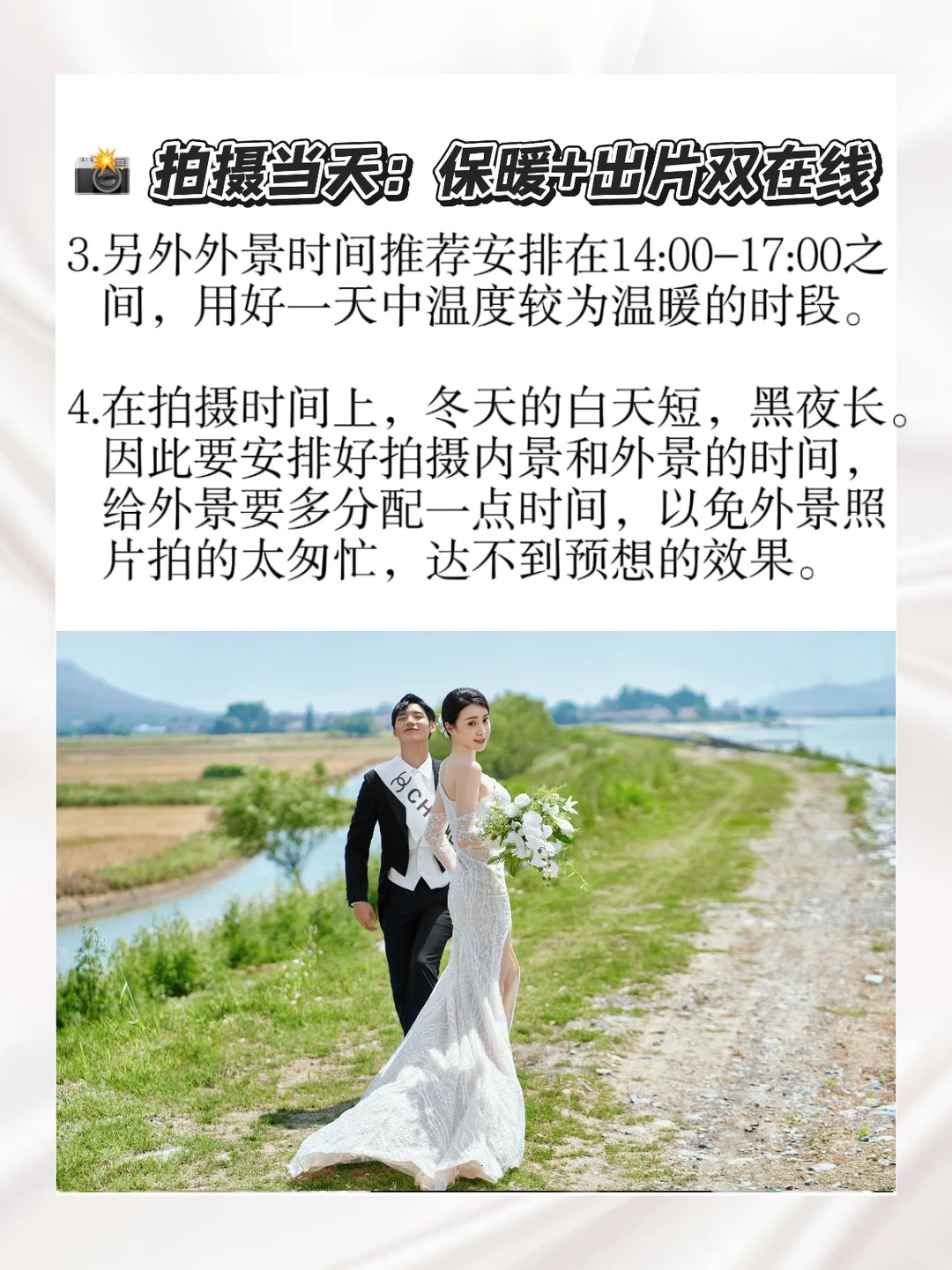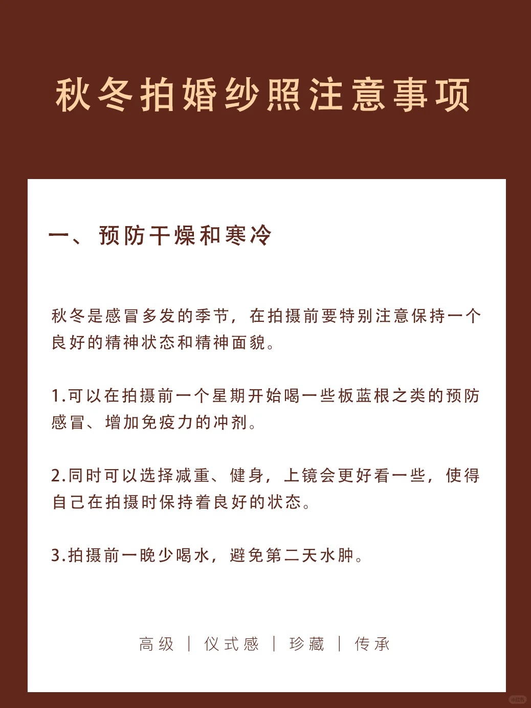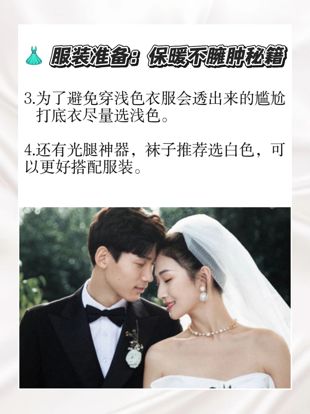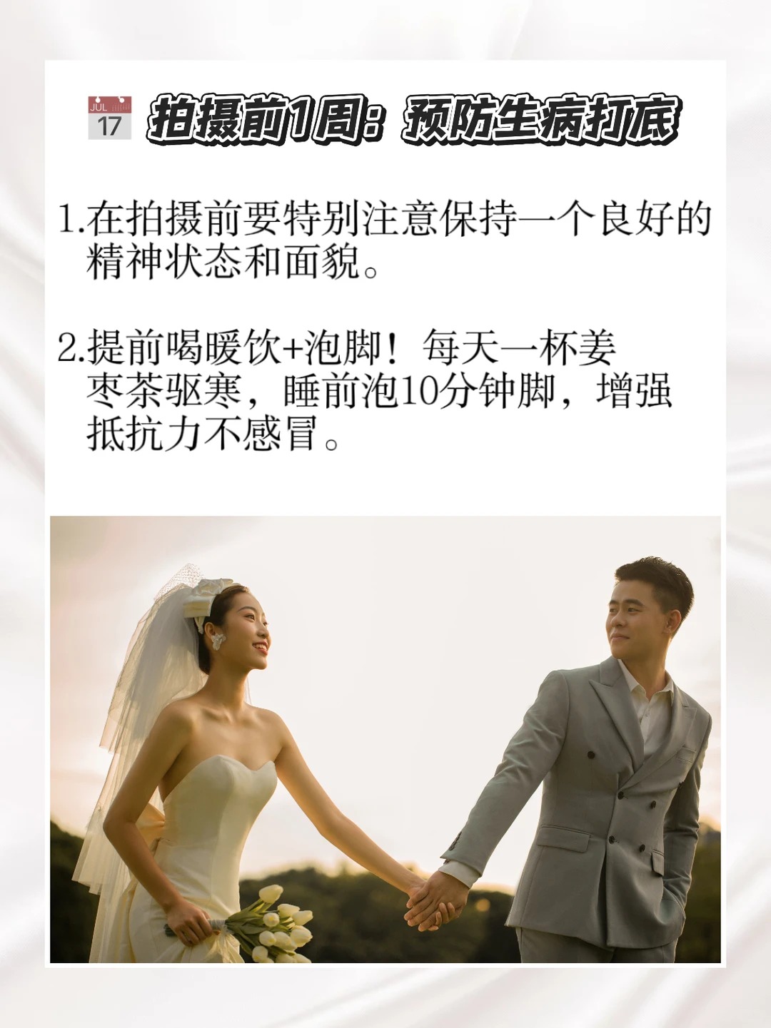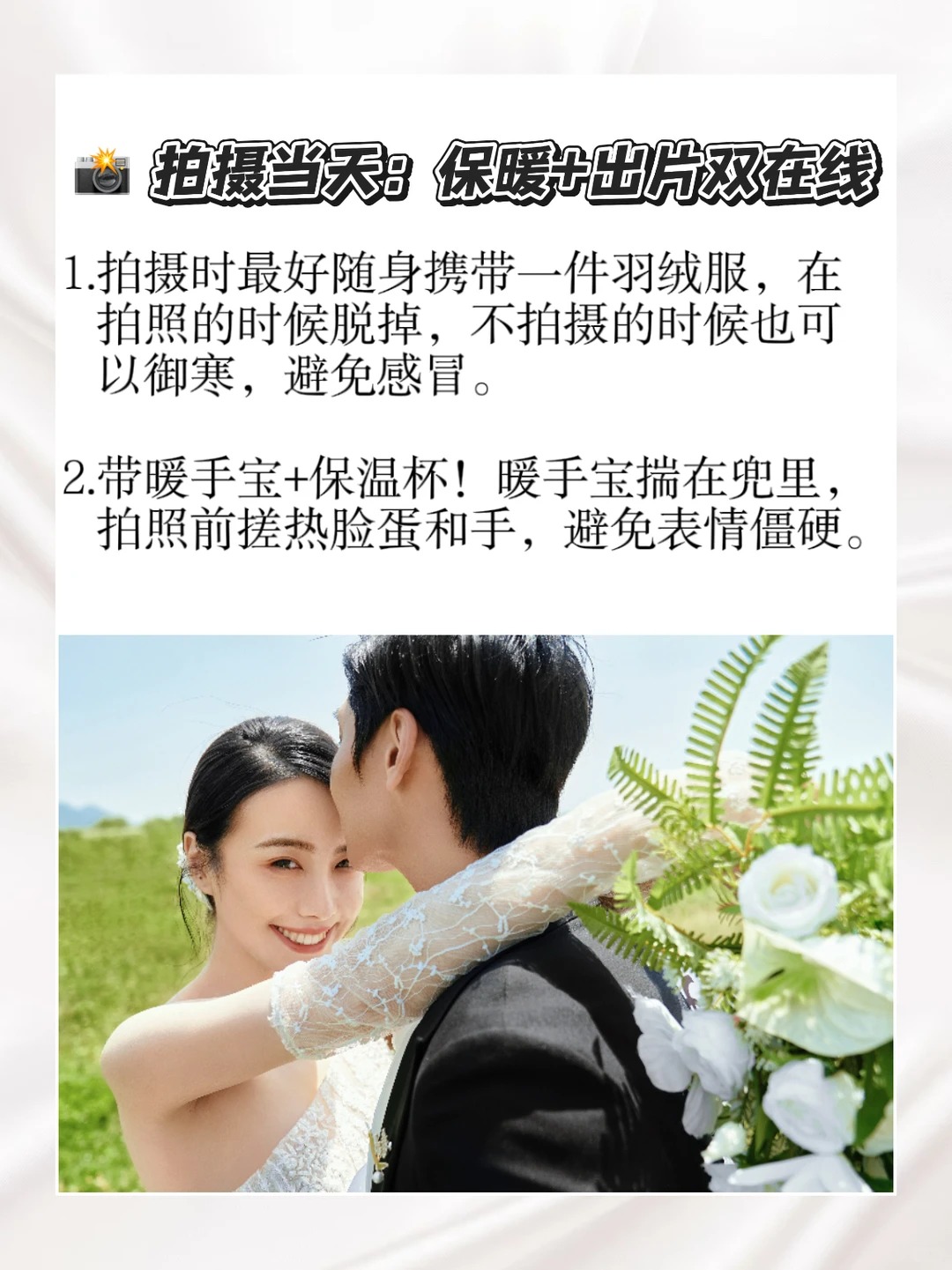 • 冬季拍外景怕冻病?怕穿太多臃肿不好看? 这份按「时间+核心需求」整理的攻略, 暖感与美感兼得,还能杜绝拍摄后感冒! 📅 拍摄前1周:预防生病 1.在拍摄前要特别注意保持一个良好的精神状态和面貌。 2.提前喝暖饮+泡脚!每天一杯姜枣茶驱寒,睡前泡10分钟脚,增强抵抗力不感冒 3. 秋冬比较干燥,所以在拍摄的前一晚一定要做好保湿,敷个面膜,近期做一些皮肤管理,这样在上妆的时候会更服帖。#婚纱照拍摄注意事项