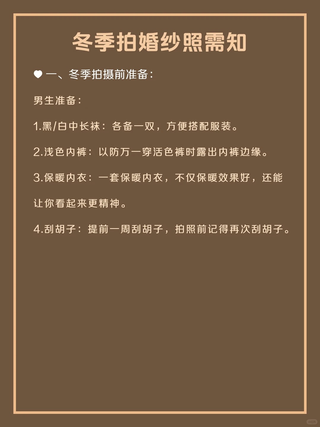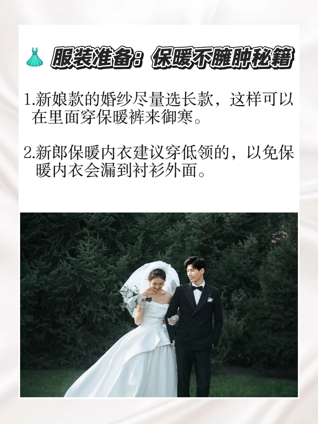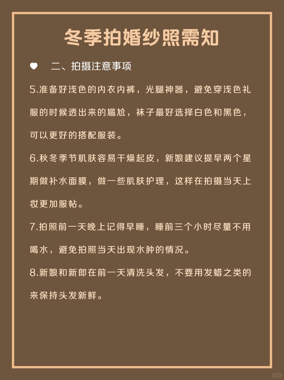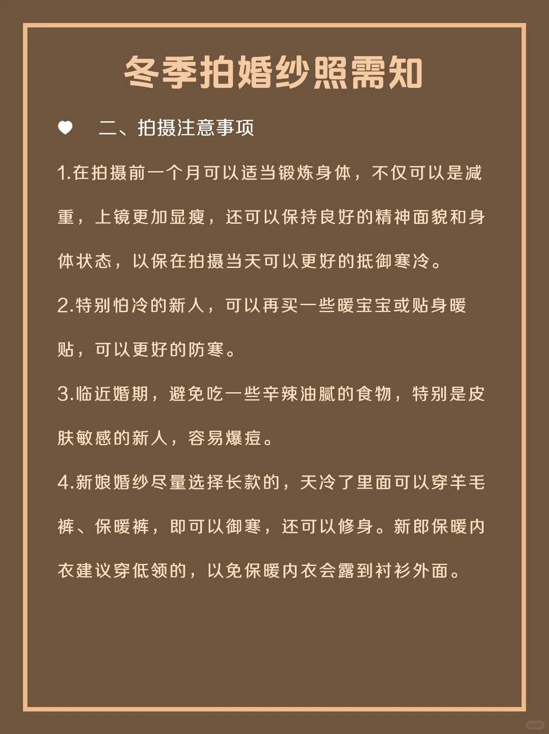 • 冬季拍外景怕冻病?怕穿太多臃肿不好看? 这份按「时间+核心需求」整理的攻略, 暖感与美感兼得,还能杜绝拍摄后感冒! 📅 拍摄前1周:预防生病 1.在拍摄前要特别注意保持一个良好的精神状态和面貌。 2.提前喝暖饮+泡脚!每天一杯姜枣茶驱寒,睡前泡10分钟脚,增强抵抗力不感冒 3. 秋冬比较干燥,所以在拍摄的前一晚一定要做好保湿,敷个面膜,近期做一些皮肤管理,这样在上妆的时候会更服帖。#婚纱照拍摄注意事项