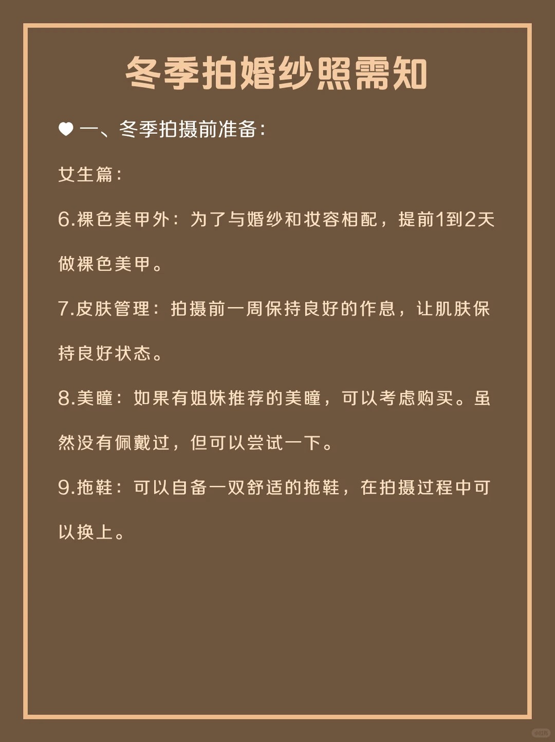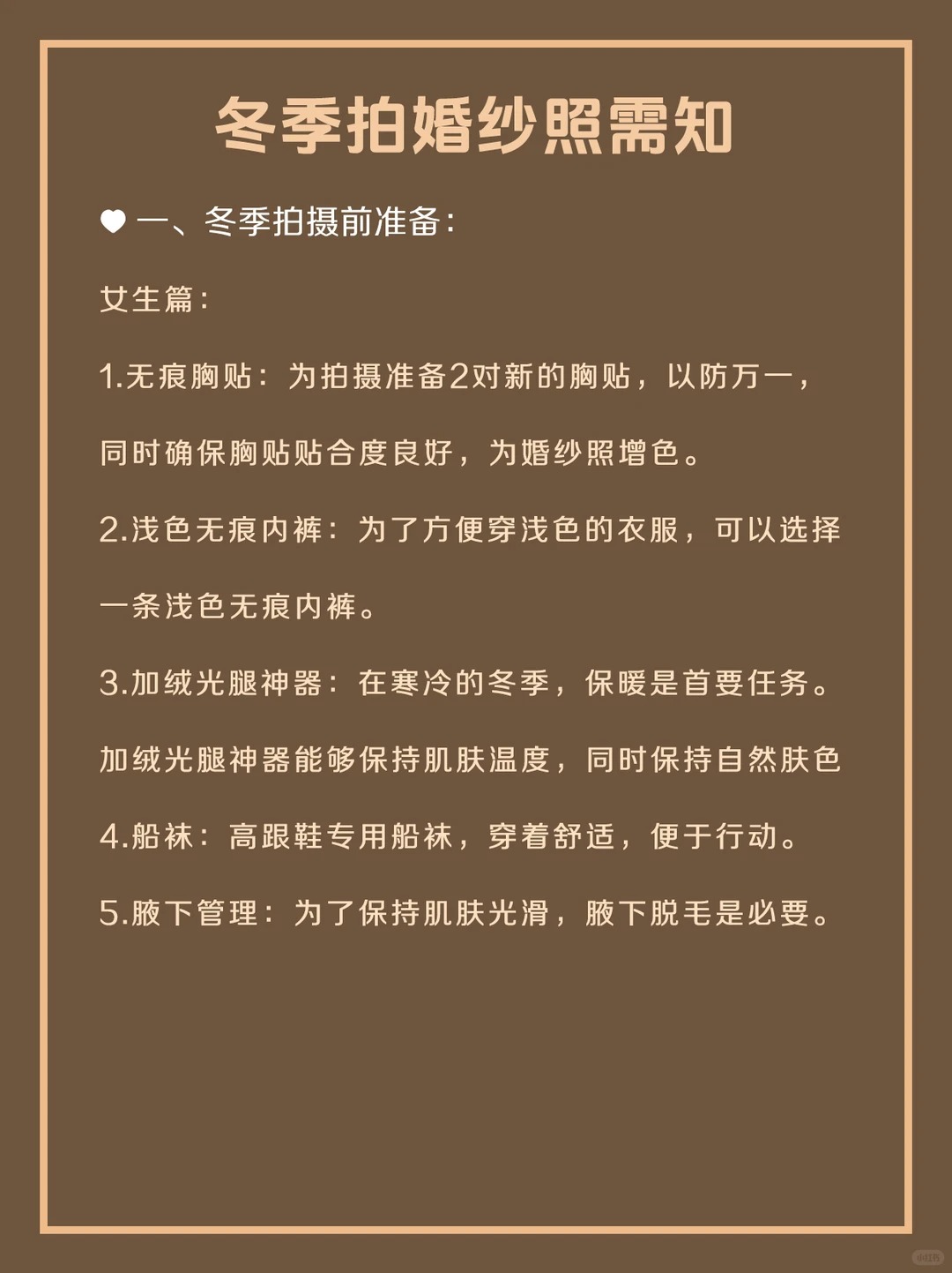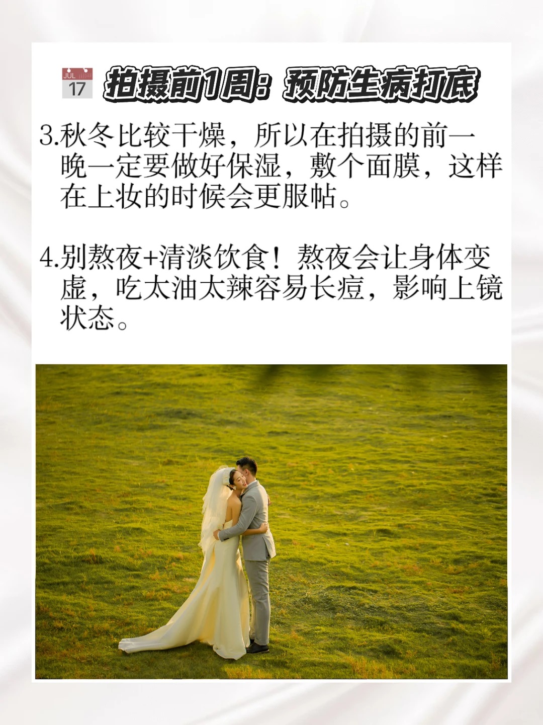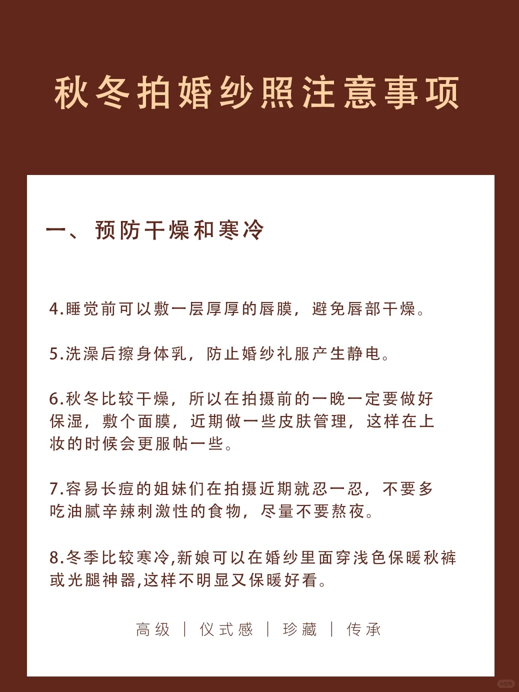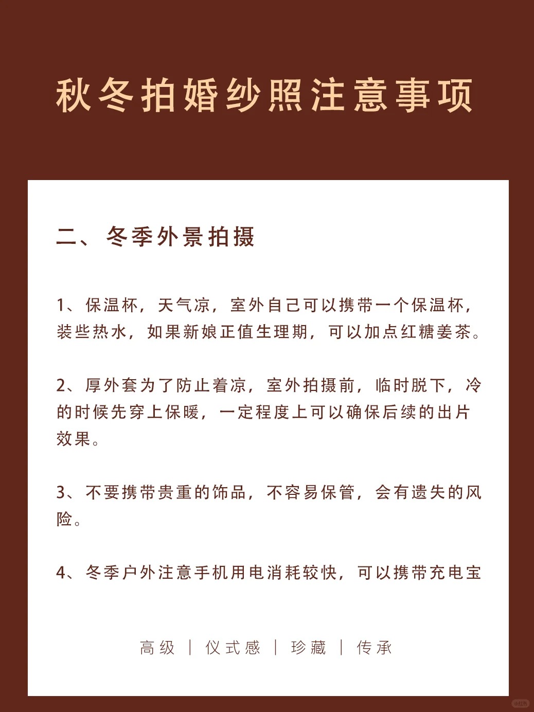 • 冬季拍外景怕冻病?怕穿太多臃肿不好看? 这份按「时间+核心需求」整理的攻略, 暖感与美感兼得,还能杜绝拍摄后感冒! 📅 拍摄前1周:预防生病 1.在拍摄前要特别注意保持一个良好的精神状态和面貌。 2.提前喝暖饮+泡脚!每天一杯姜枣茶驱寒,睡前泡10分钟脚,增强抵抗力不感冒 3. 秋冬比较干燥,所以在拍摄的前一晚一定要做好保湿,敷个面膜,近期做一些皮肤管理,这样在上妆的时候会更服帖。#婚纱照拍摄注意事项