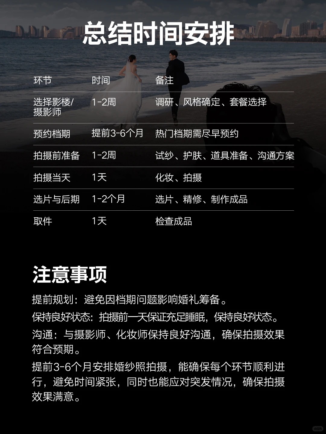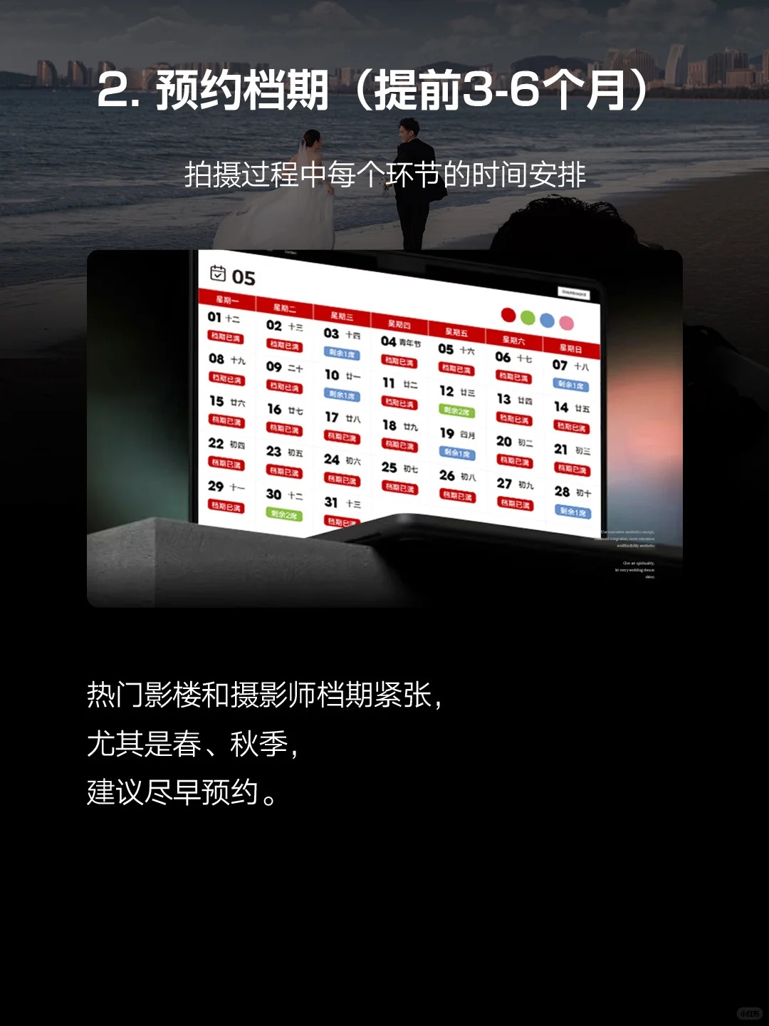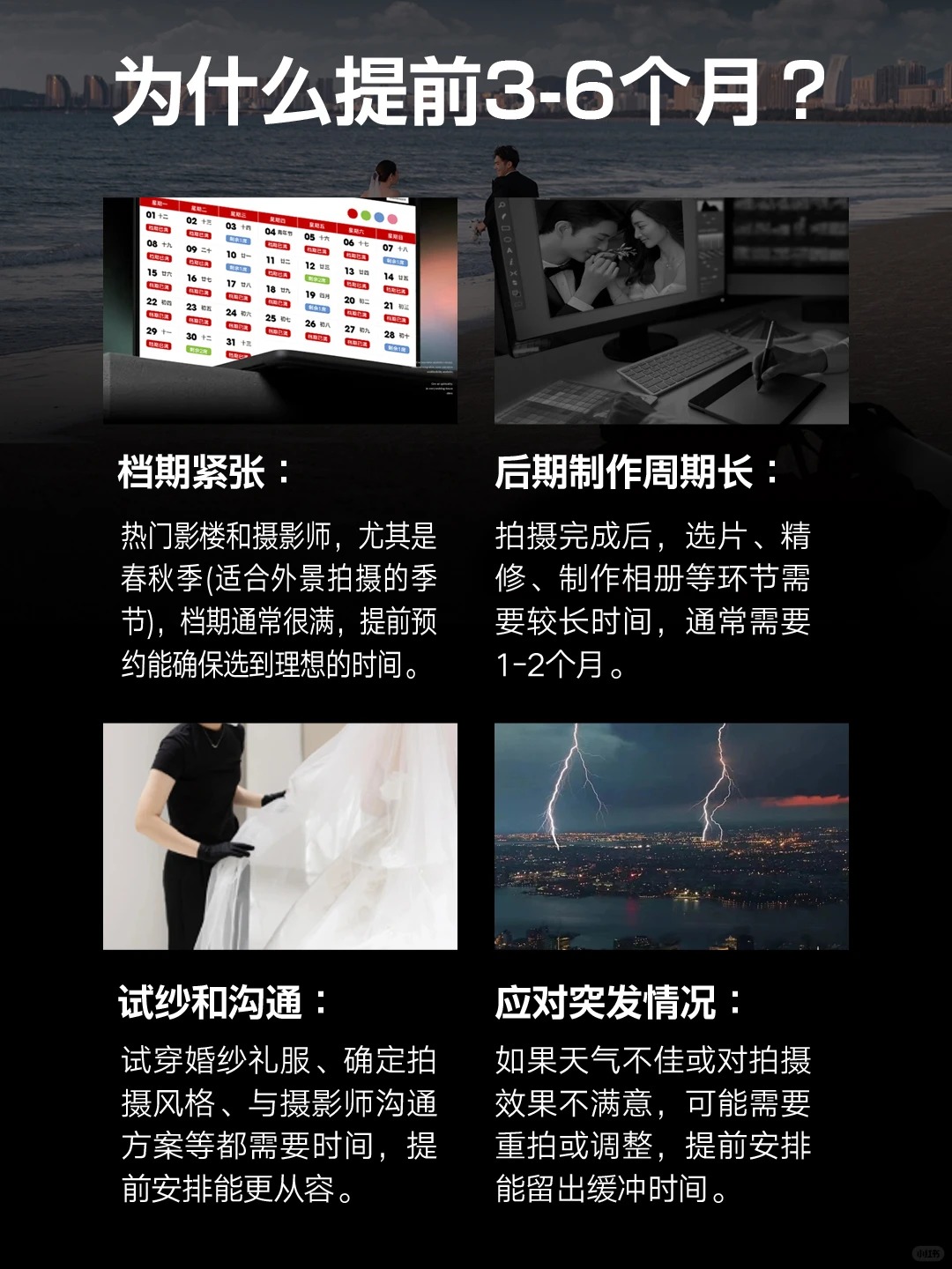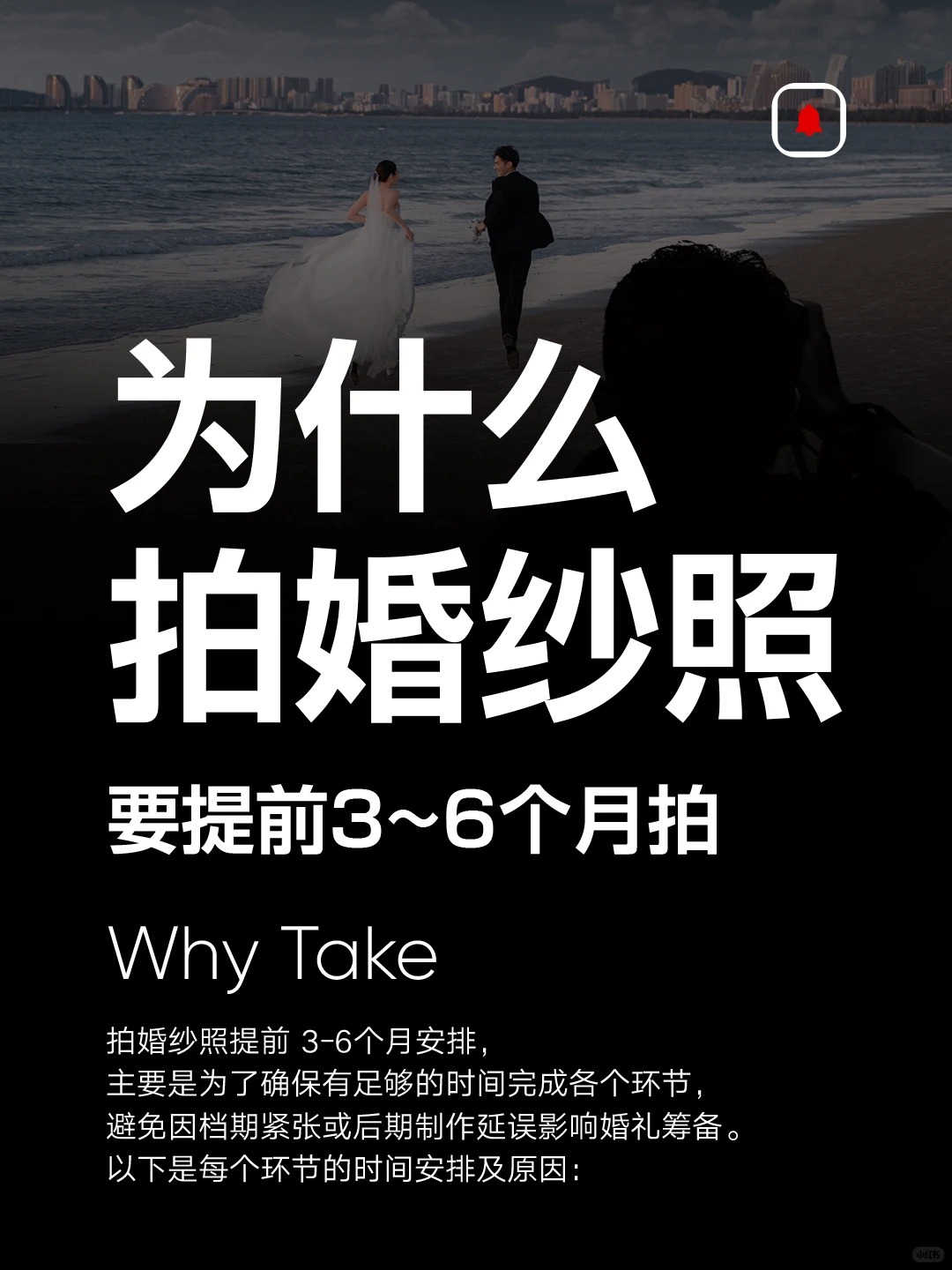 • 姐妹们!听我一句劝,婚纱照真的真的要提前3-6个月拍!📸 不然等到婚礼前手忙脚乱,真的会后悔到哭😭 💡 为什么提前这么久? 1⃣ 档期紧张:热门影楼和摄影师,尤其是春秋季,档期真的爆满!不提前约,根本抢不到好时间!#婚纱照拍摄注意事项
