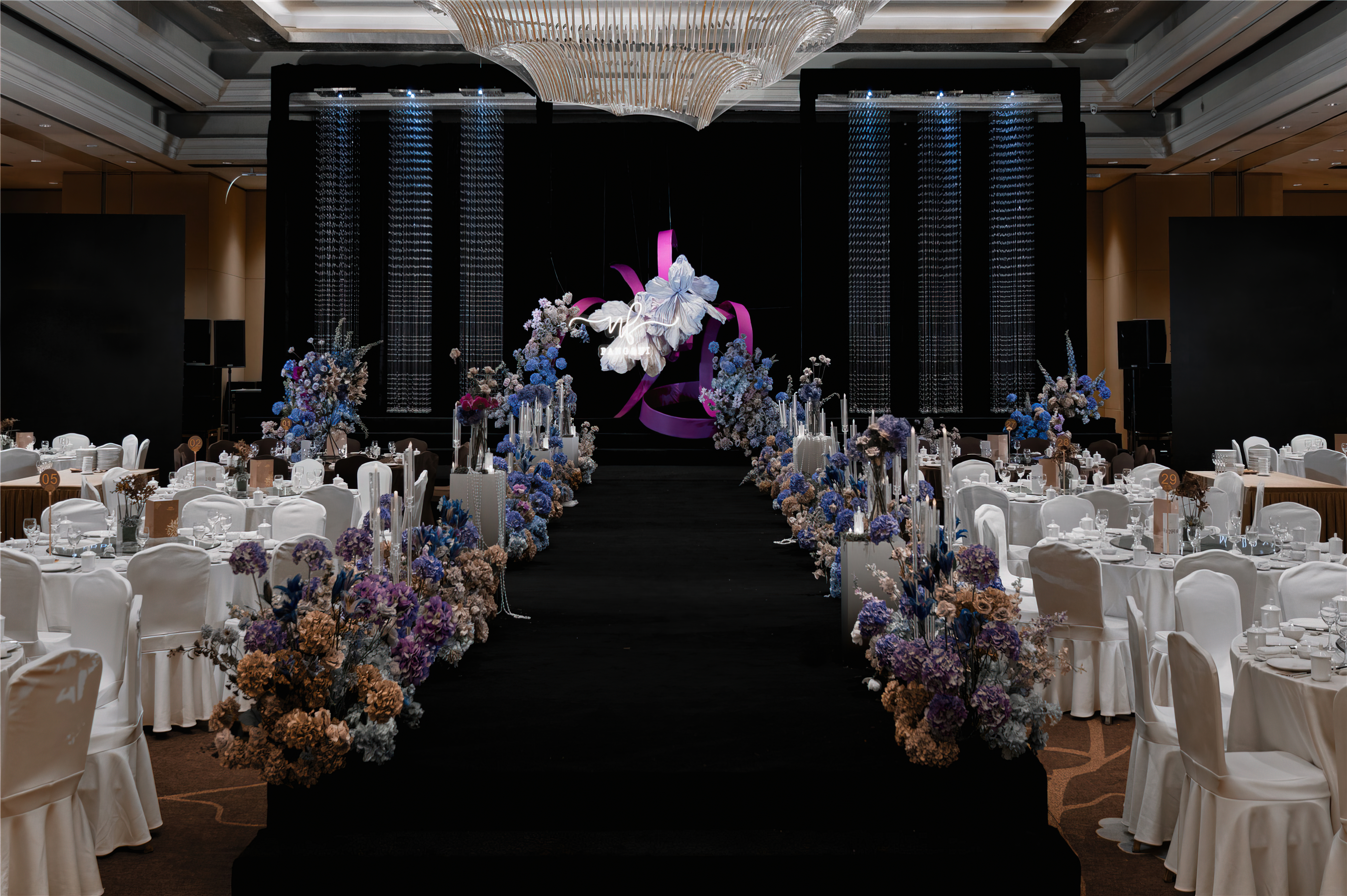 • 红丝绒包裹着奢华,帷幔缓缓拉开,黑色的神秘深邃碰撞梦幻瑰丽的柔美花海,水晶灯与馥郁粉黛串联成花瀑,打造经典的秀场风晚宴。